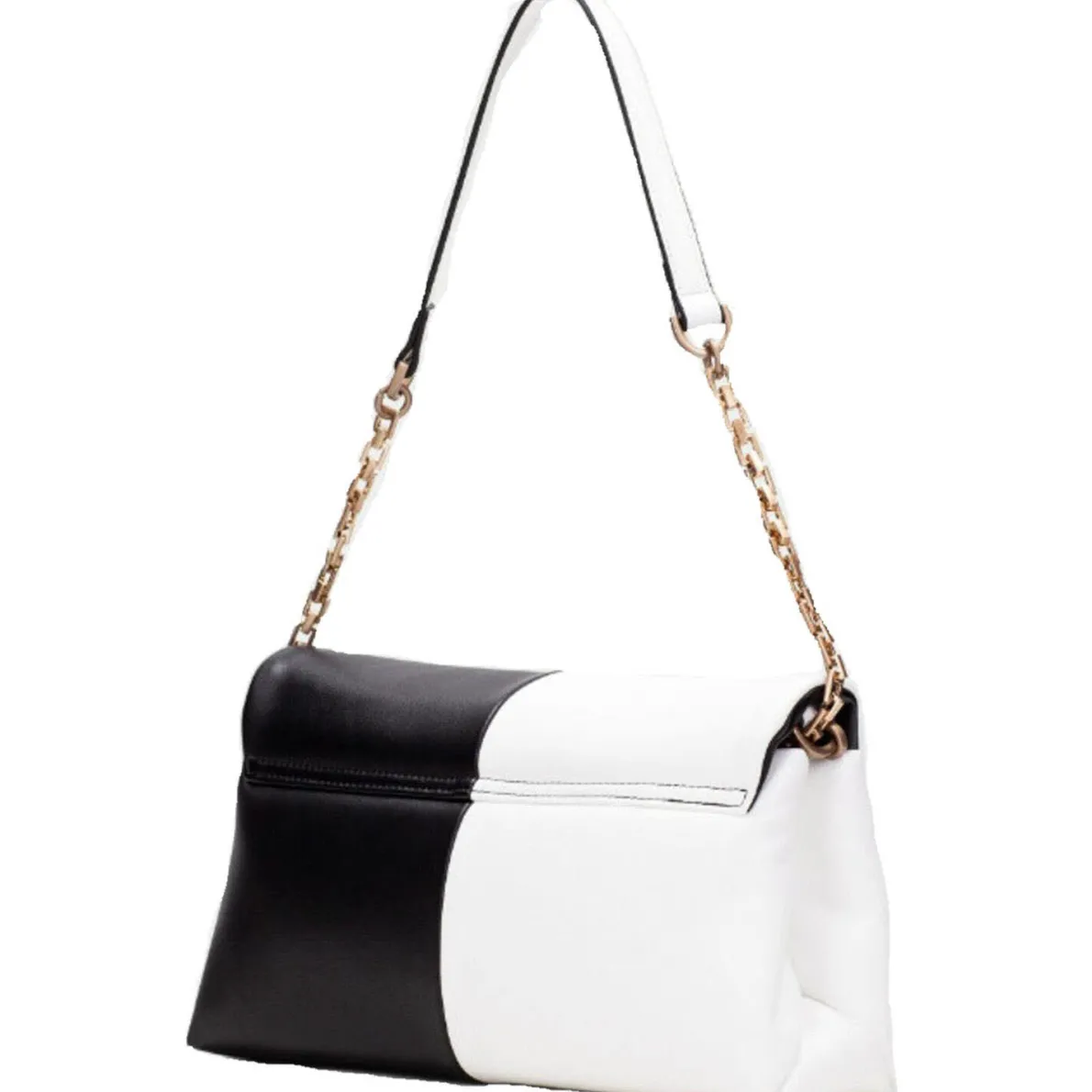 Der Umhängegurt besteht zum Teil aus Kettengliedern, ist abnehmbar und ermöglicht ein crossover Tragen der Handtasche.