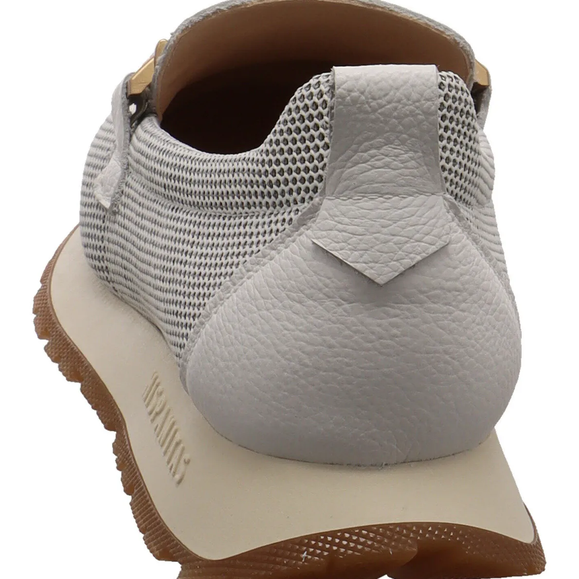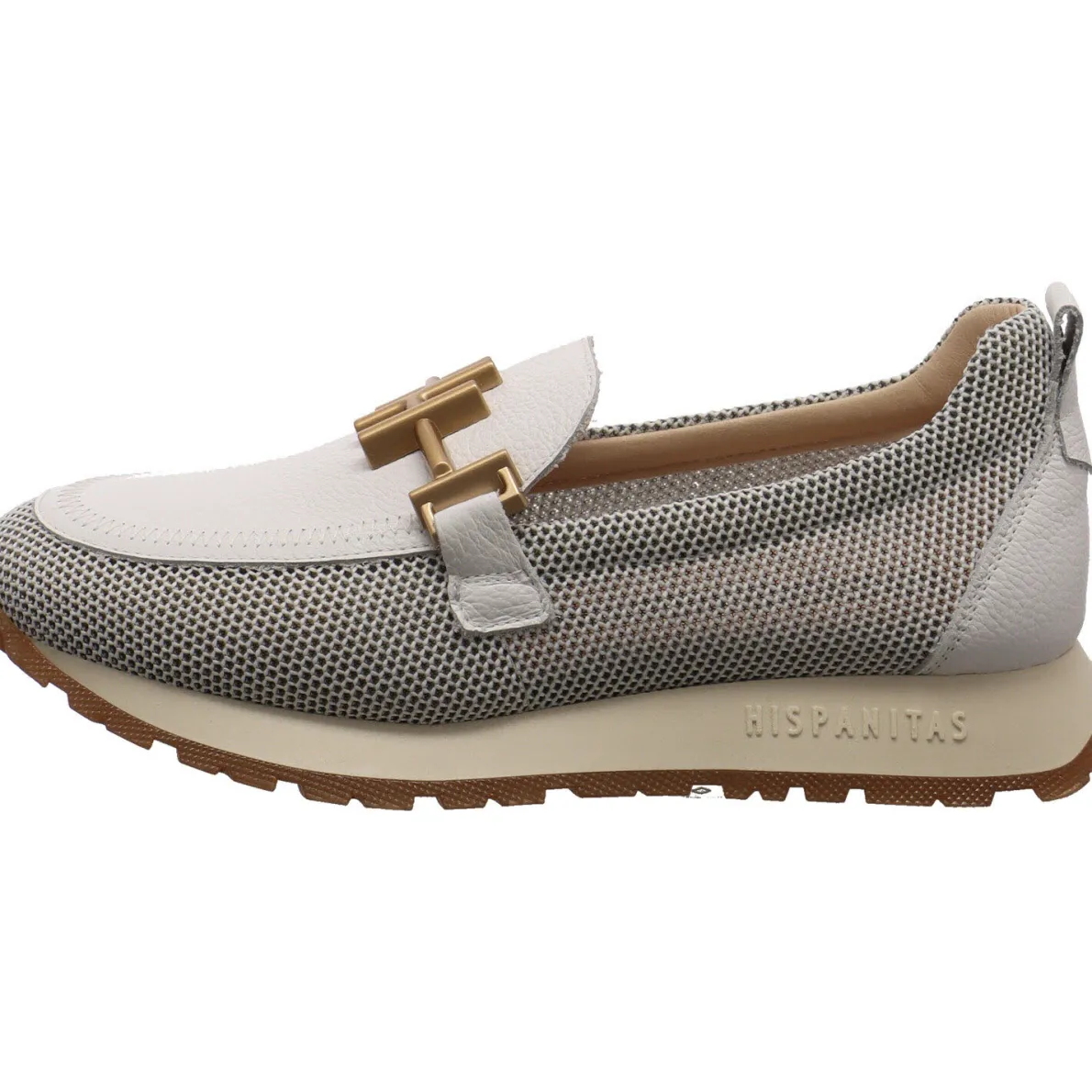 Voll im Trend liegst du mit diesem modischen Damen Loafer Melbourne vom spanischen Label Hispanitas. Er wurde aus einer Kobination aus hochwertigem Echtleder in Weiß und atmungsaktiven Textil Mesh gefertigt. Auf dem Spann ist eine Metall Applikation mit dem Marken Logo angebracht. Der Slipper verfügt über die Triflow Technologie, die jeden Schritt dämpft und dank der dreifachen Polsterung für Flexibilitöt und Komfort beim Gehen sorgt. Die markante Laufsohle ist Beige abgesetzt und rundet den sportlich, modernen Look gekonnt ab. Die weiche Innensohle ist als Wechselfußbett gearbeitet, so können auch eigene Einlagen verwendet werden.