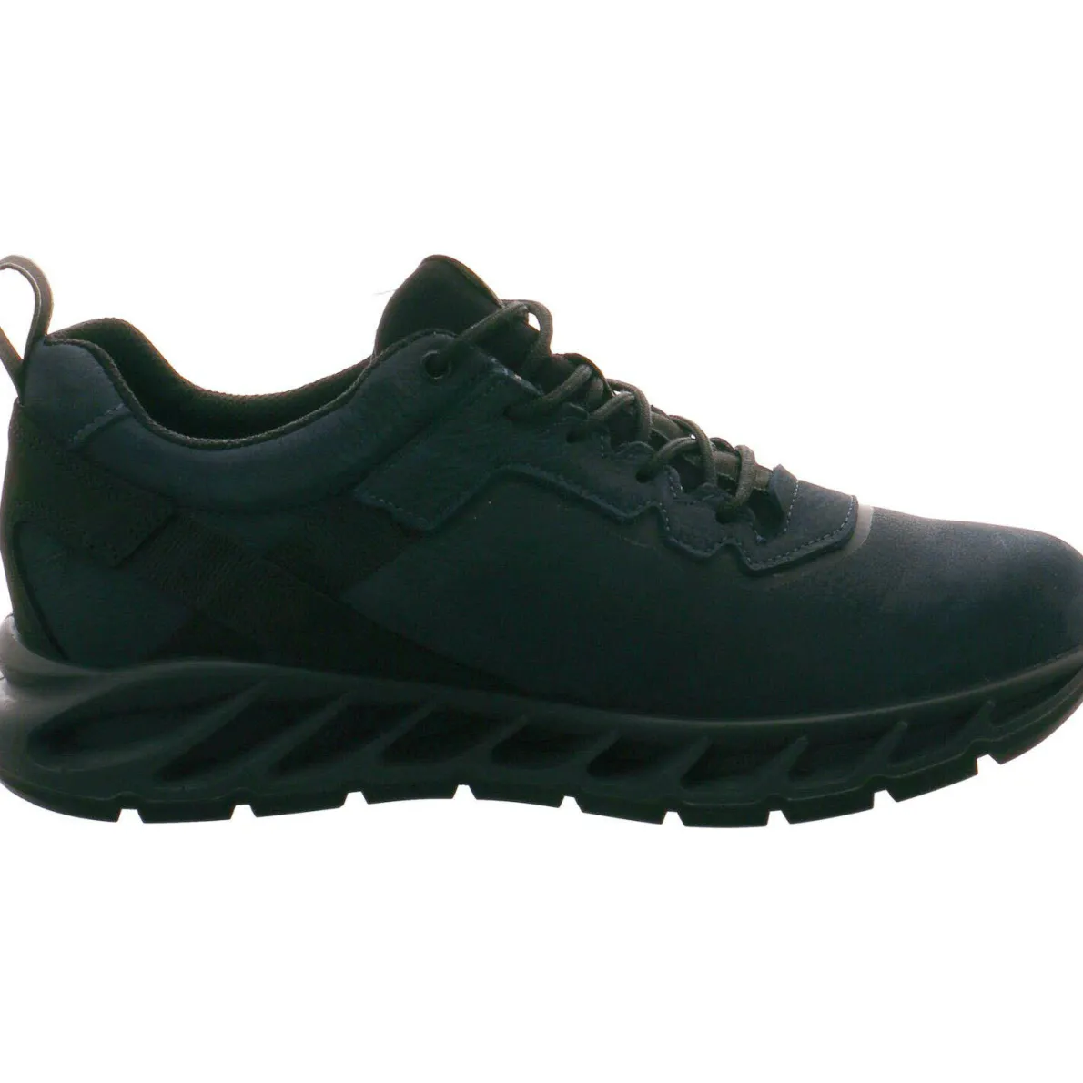 Gefertigt wurde der Sneaker für Herren in einem Materialmix aus feinem Nubukleder in Blau und flexiblen textilen Einsätzen, die zum Teil farblich in Schwarz abgesetzt wurden.