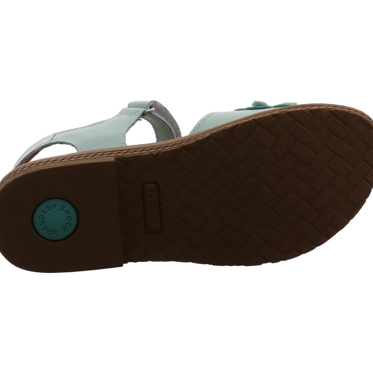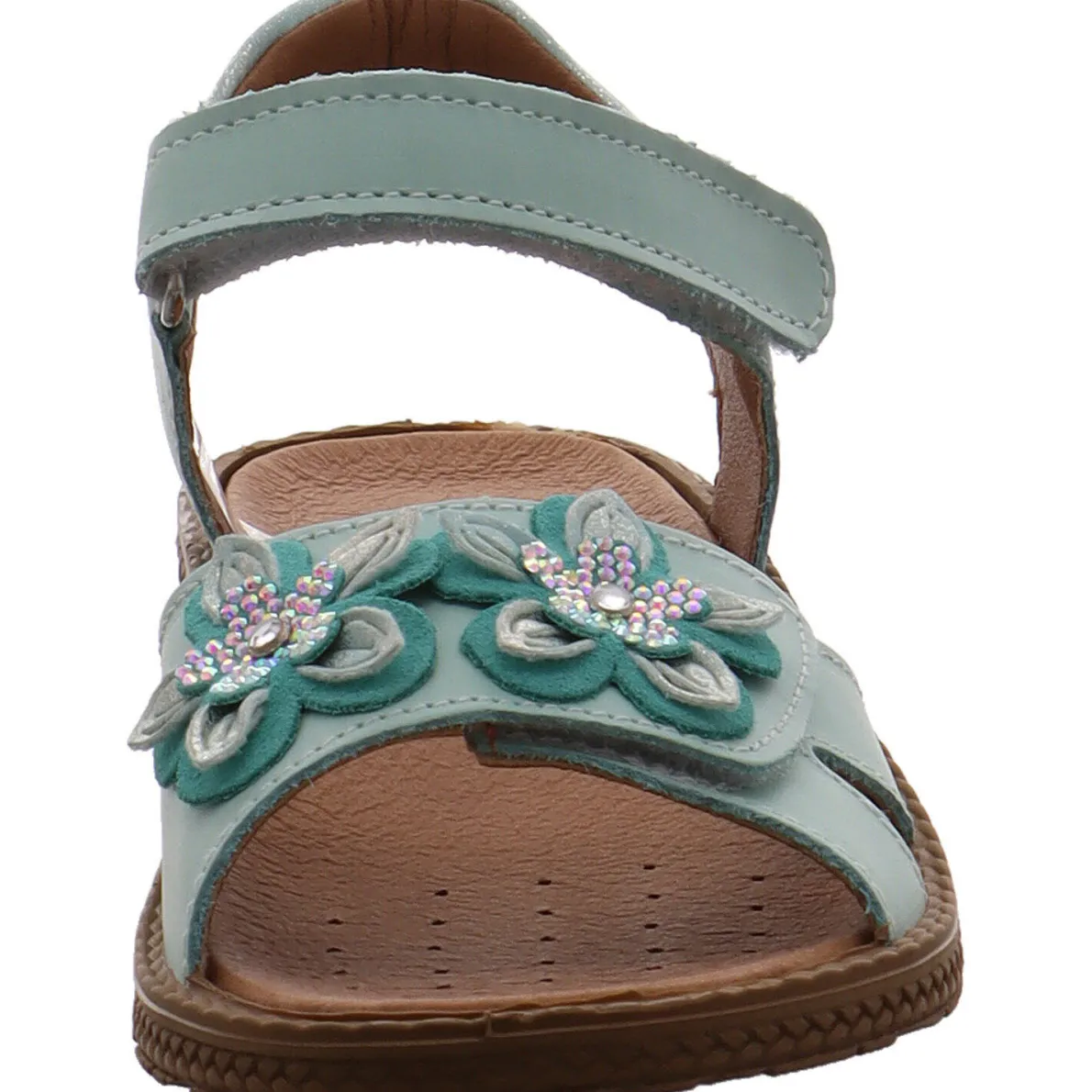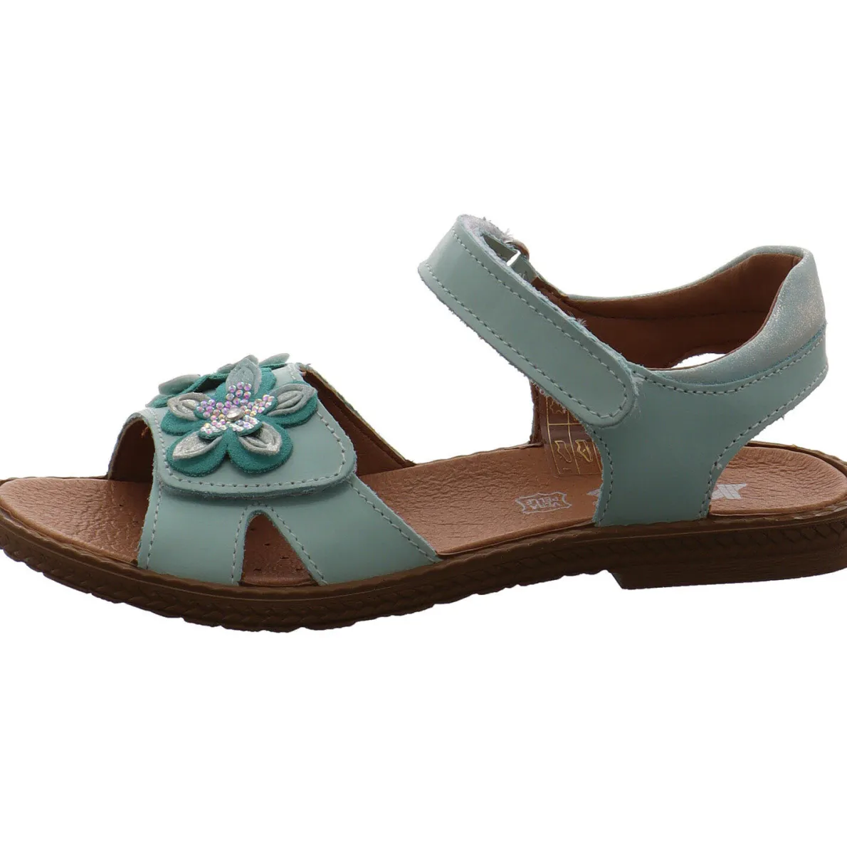 Gefertigt aus hochwertigem Echtleder in einem Türkis Blau ist die Sandale ein besonders schicker Begleiter im Sommer. Ein besonderes Highlight sind die aufgesetzten Blumen mit den vielen kleinen Glitzersteinen.