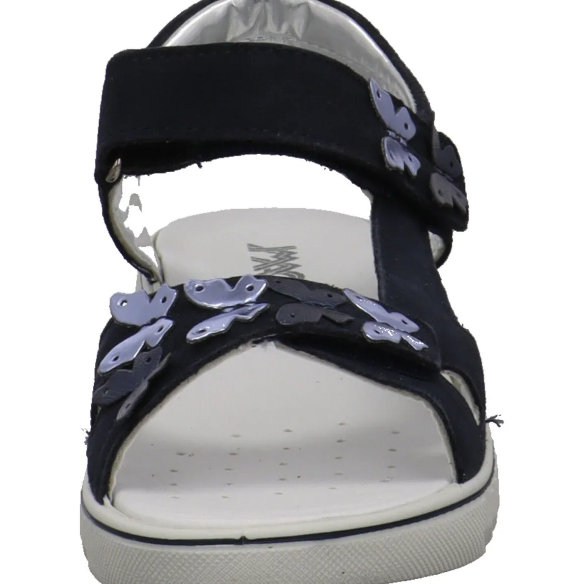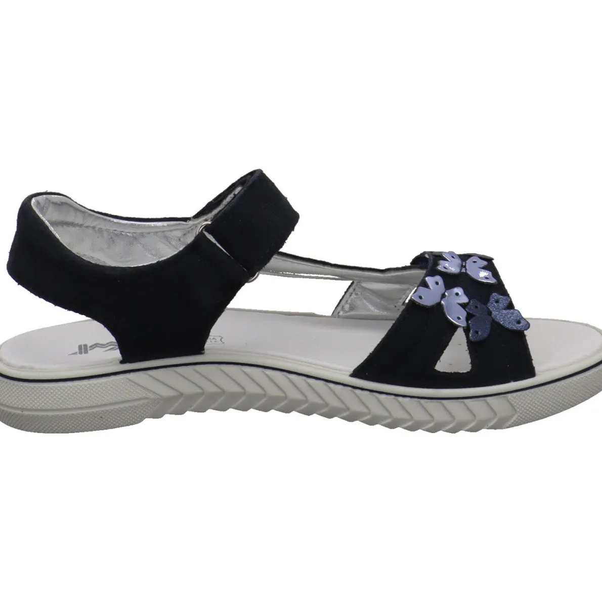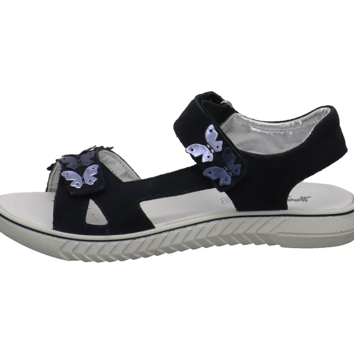Diese tolle Kinder Sandale Aurora für Mädchen aus dem Hause Imac wurde aus weichem Veloursleder in Navy Blau gefertigt. Der Schuh überzeugt durch schlichtes Design und ist auf dem Blatt mit kleinen Schmetterlingen im Metallic Effekt und mit Glitzer verziert, was ihn zum echten Hingucker macht