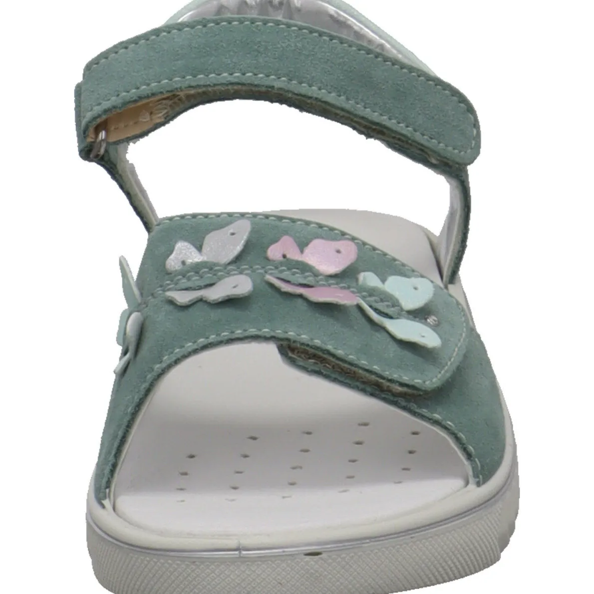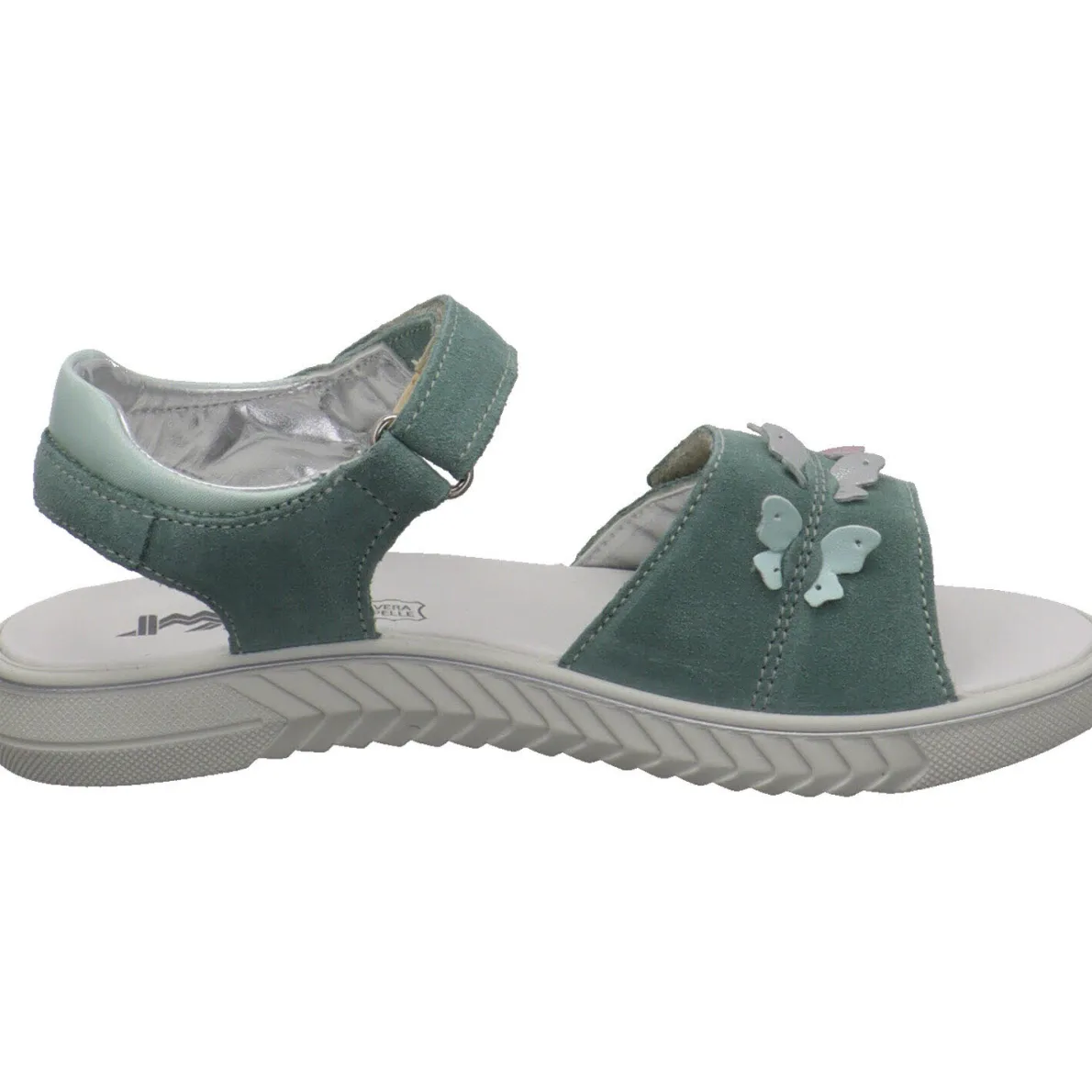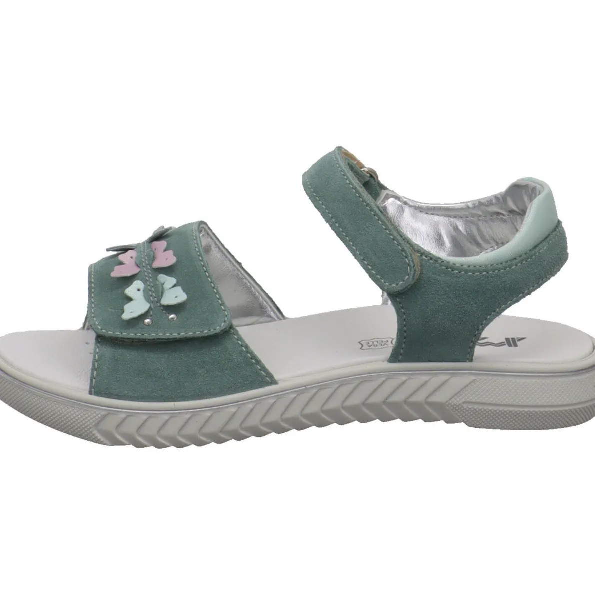 Diese tolle Kinder Sandale Aurora für Mädchen aus dem Hause Imac wurde aus weichem Veloursleder in mintgrün gefertigt. Der Schuh überzeugt durch sein schlichtes Design und wurde auf dem Blatt mit kleinen Schmetterlingen im Metallic Effekt und mit Glitzer verziert, was ihn zum echten Hingucker macht.