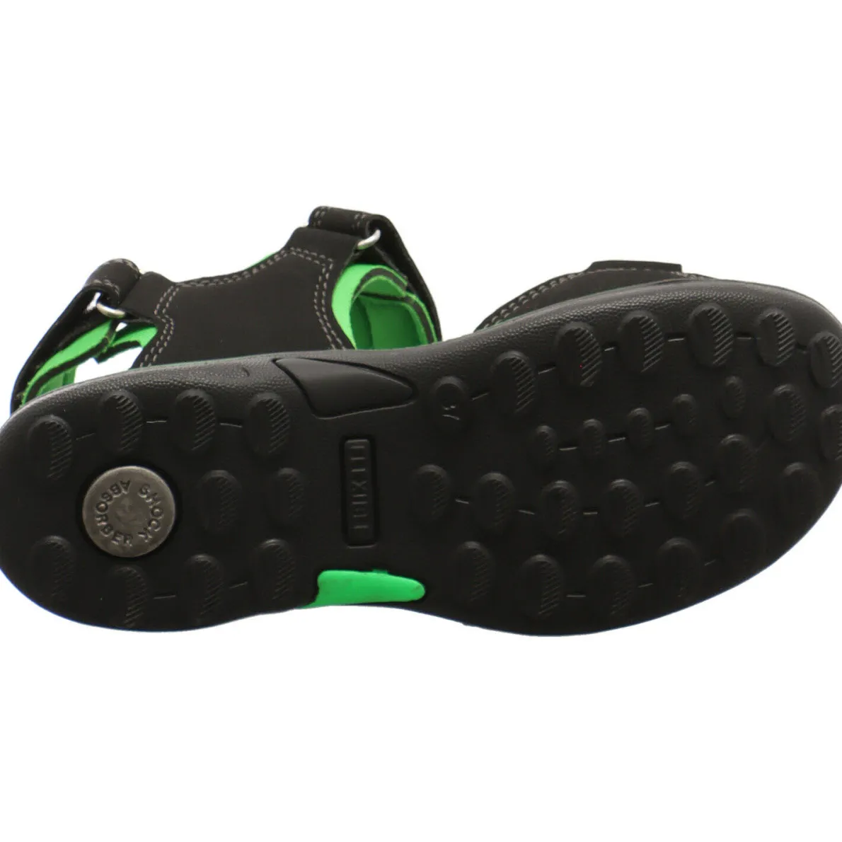 Gefertigt aus einem Mix aus Kunstleder in Schwarz und Textil Mesh in Grün bietet er ein angenehmes Tragegefühl. Aufgelockert wird das Design durch Ziernähte und Farbakzente in Neon Grün und Blau. Durch den dreifachen Klettverschluss lässt der Schuh im Trekking Look sich optimal dem Fuß anpassen.