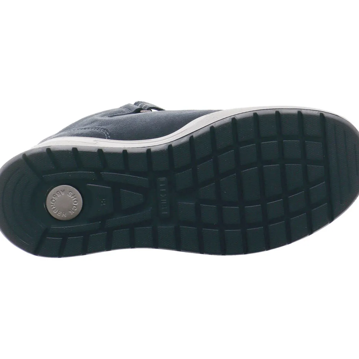 Gefertigt aus einem gekonnten Mix aus Veloursleder und Textil in einem dunklen Blau ist der Schuh mit Akzenten in Grün abgesetzt.