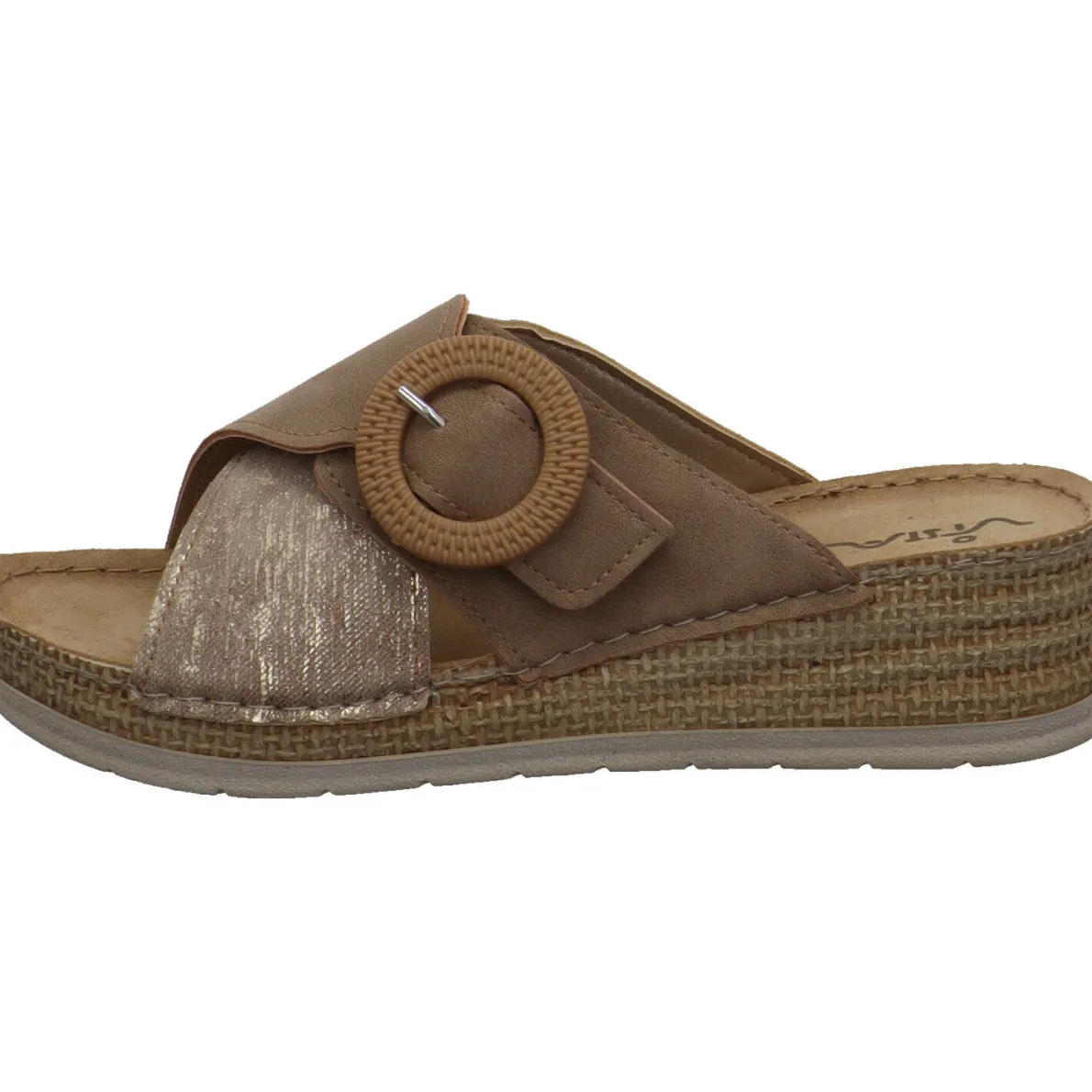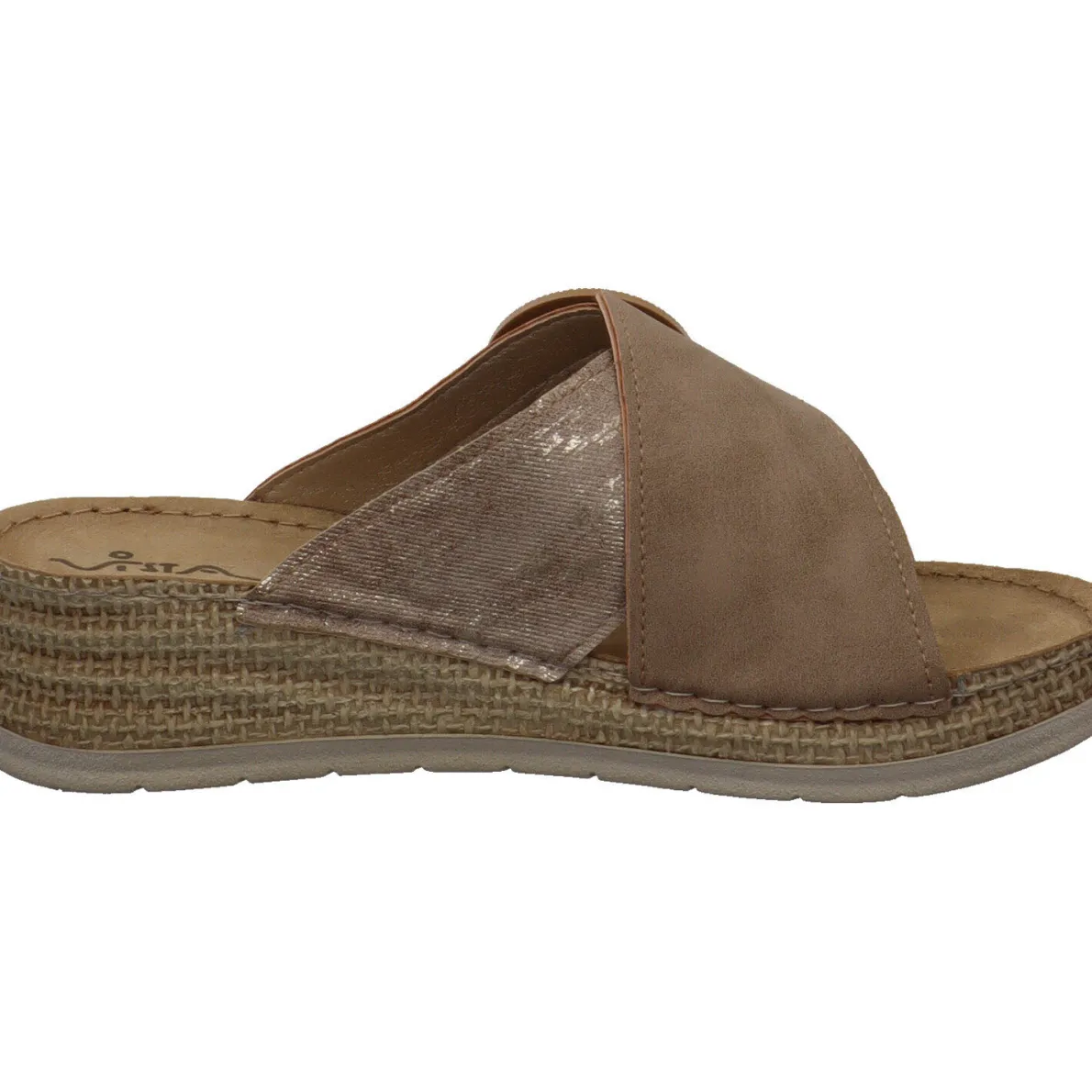 Modisch und bequem, begleitet dich diese schöne Damen Pantolette aus den Hause Vista. Die breiten, über Kreuz gesetzte Riemen in Beige geben dir einen guten Halt. Der Riemen mit Zierschnalle ist mit einem Klettverschluss gearbeitet, so kannst du den Schuh genau auf deine Bedürfnisse anpassen.