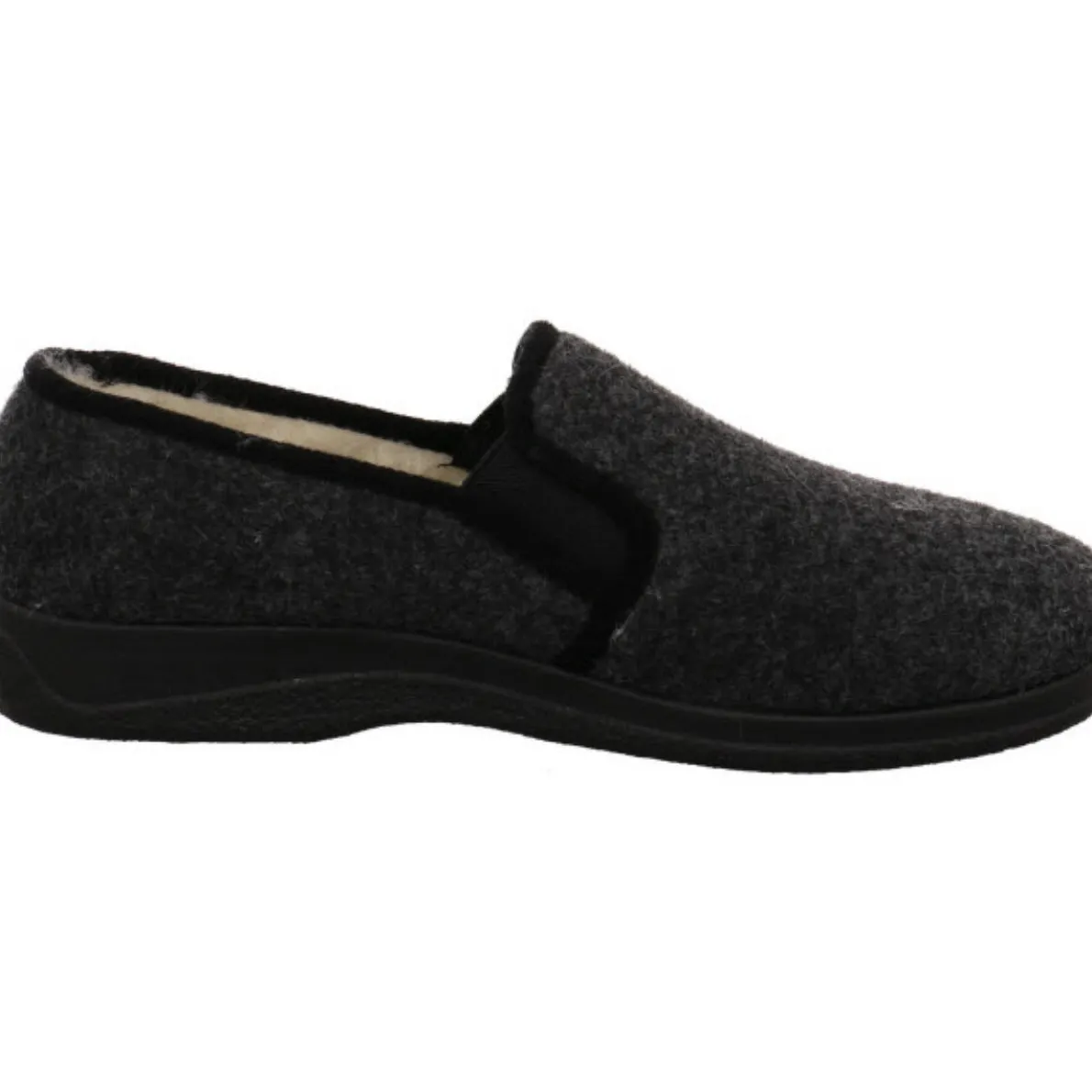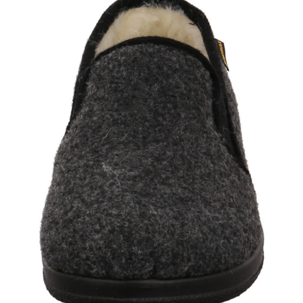 Der Hausschuh ist mit einem mollig warmen Innenfutter aus echter Schurwolle ausgestattet und die seitlichen Dehngummis sorgen für eine perfekte Passform und einen leichten Einstieg.