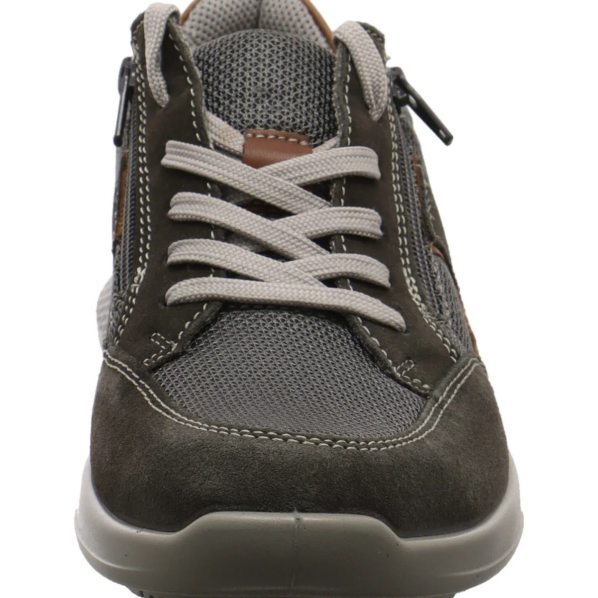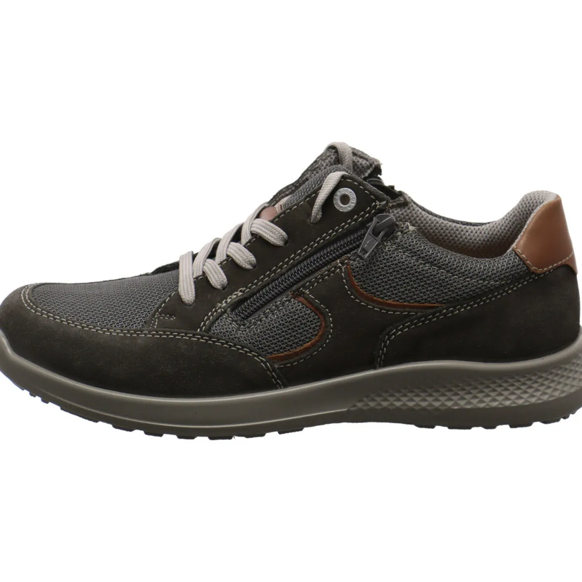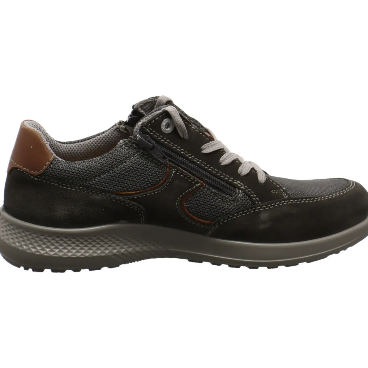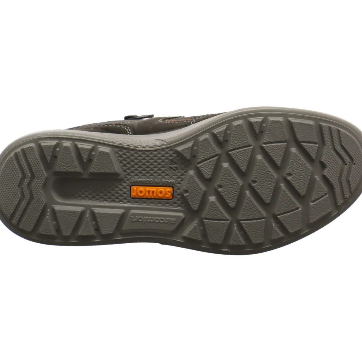 Der Schuh von Jomos ist ein hochwertiger Herren Schnürschuh aus einem Mix aus hochwertigem Veloursleder in dunklem Grau und luftigem Mesh Textil. Sein sportliches Design verleihen ihm vor allem die Akzente in Braun und die Overlaystruktur. Die dezenten Schnürsenkel und der an beiden Seiten angebrachten Reißverschlüsse ermöglichen einen bequemen Einstieg und die Ausstattung lässt keine Wünsche offen. Lasche und Schaftrand sind weich gepolstert, das AirCom-Wechselfußbett sorgt für angenehmes Tragegefühl und die aufgeraute und profilierte Aircomfortsohle gibt ausreichend Grip. Die Weite K bietet deutlich mehr Platz und Komfort.