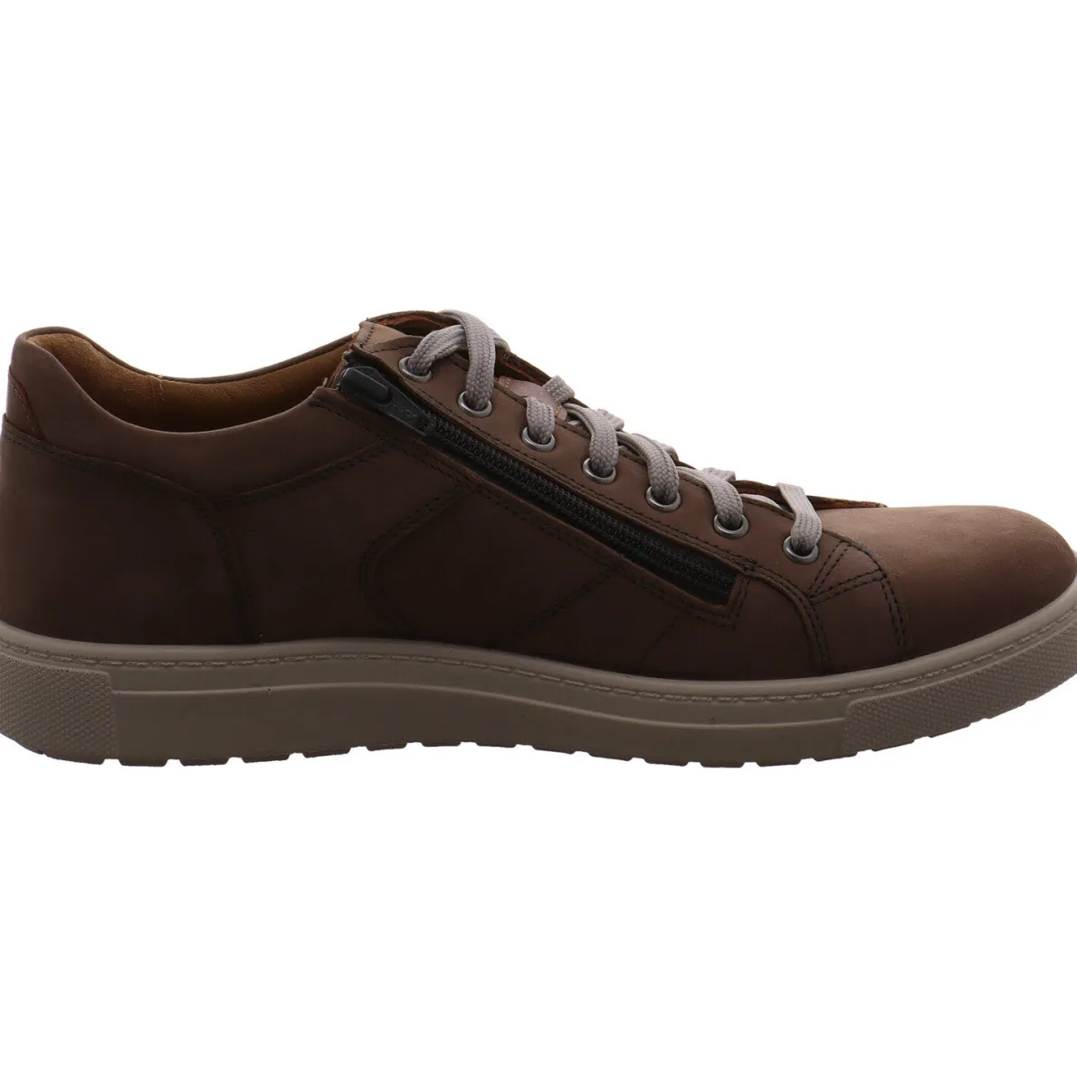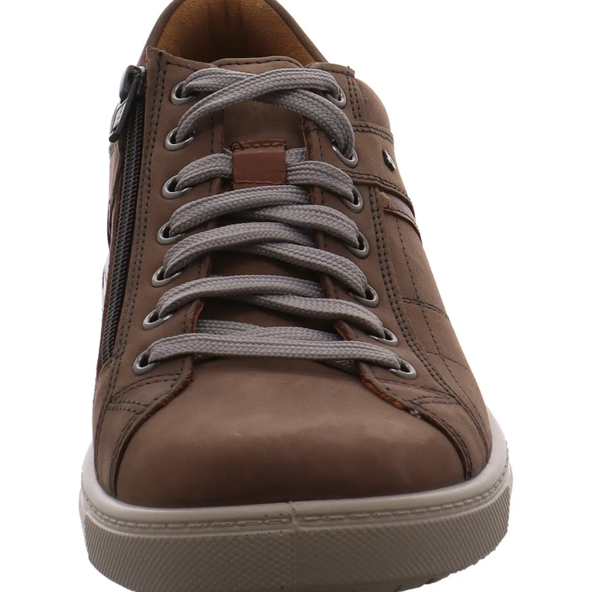 Dieser Schnürschuh von Jomos ist ein hochwertiger Herren Schnürschuh aus weichem Nubukleder in Grau/Braun. Sein sportliches Design verleihen ihm vor allem die grauen Ziernähte. Die dezenten Schnürsenkel in hellem Grau ermöglichen einen bequemen Einstieg und die Ausstattung des Schuhs lässt keine Wünsche offen. Lasche und Schaftrand sind weich gepolstert, das Air-Com-Microvelours-Wechselfußbett sorgt für angenehmes Tragegefühl und die aufgeraute und profilierte Aircomfortsohle gibt ausreichend Grip. Durch die Weite H bietet er den Füßen deutlich mehr Platz.