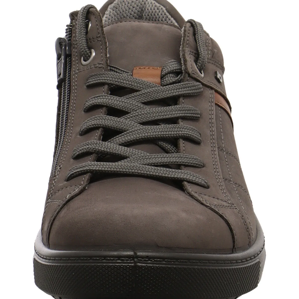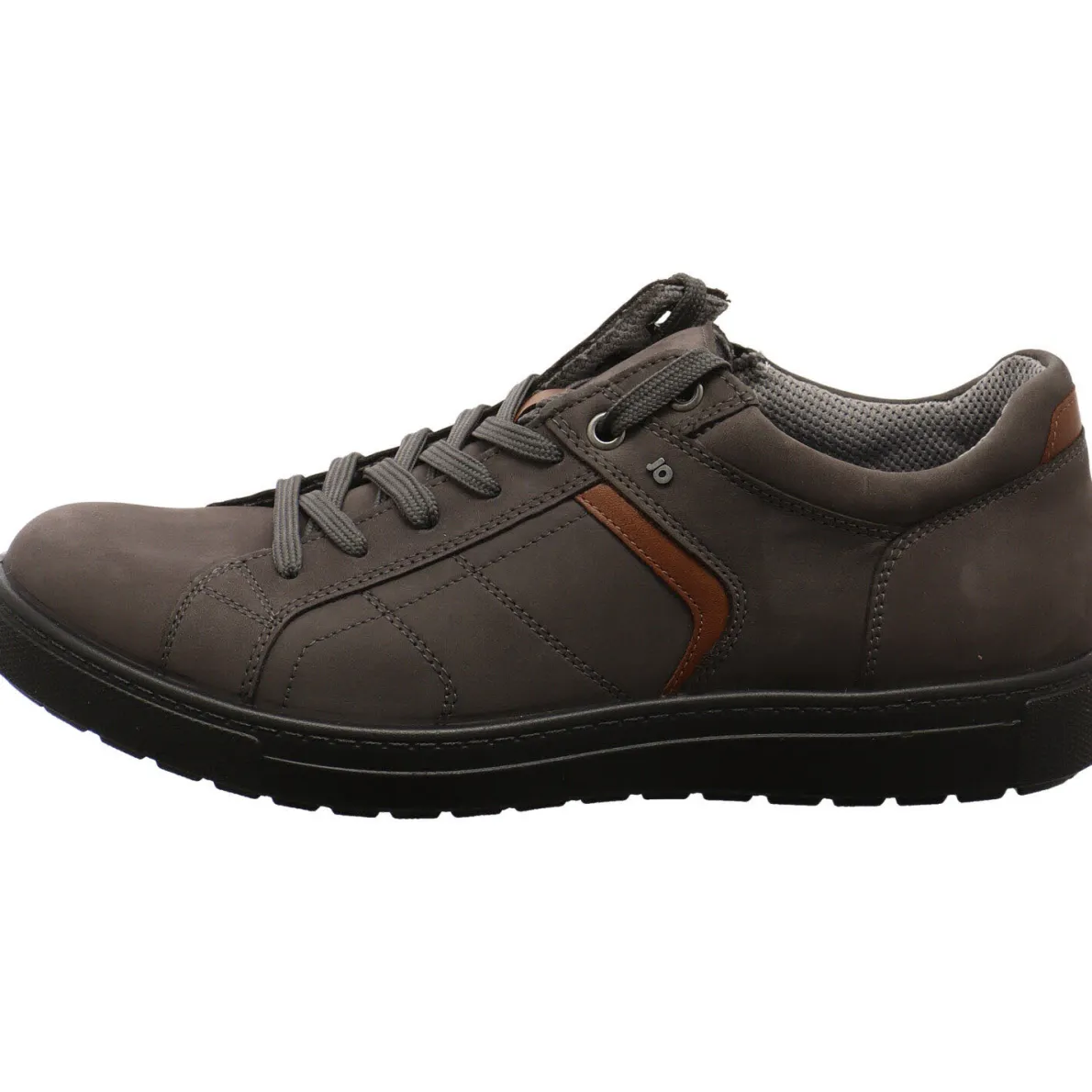 Der Schuh Rally von Jomos ist ein hochwertiger Herren Schnürschuh aus hochwertigem Veloursleder in Grau. Sein sportliches Design verleihen ihm vor allem die Akzente in Braun und die Overlaystruktur. Die dezenten Schnürsenkel und der seitliche Reißverschluss ermöglichen einen bequemen Einstieg und die Ausstattung lässt keine Wünsche offen. Lasche und Schaftrand sind weich gepolstert, das AirCom-Wechselfußbett sorgt für angenehmes Tragegefühl und die aufgeraute und profilierte Aircomfortsohle gibt ausreichend Grip. Die Weite H bietet deutlich mehr Platz und Komfort.