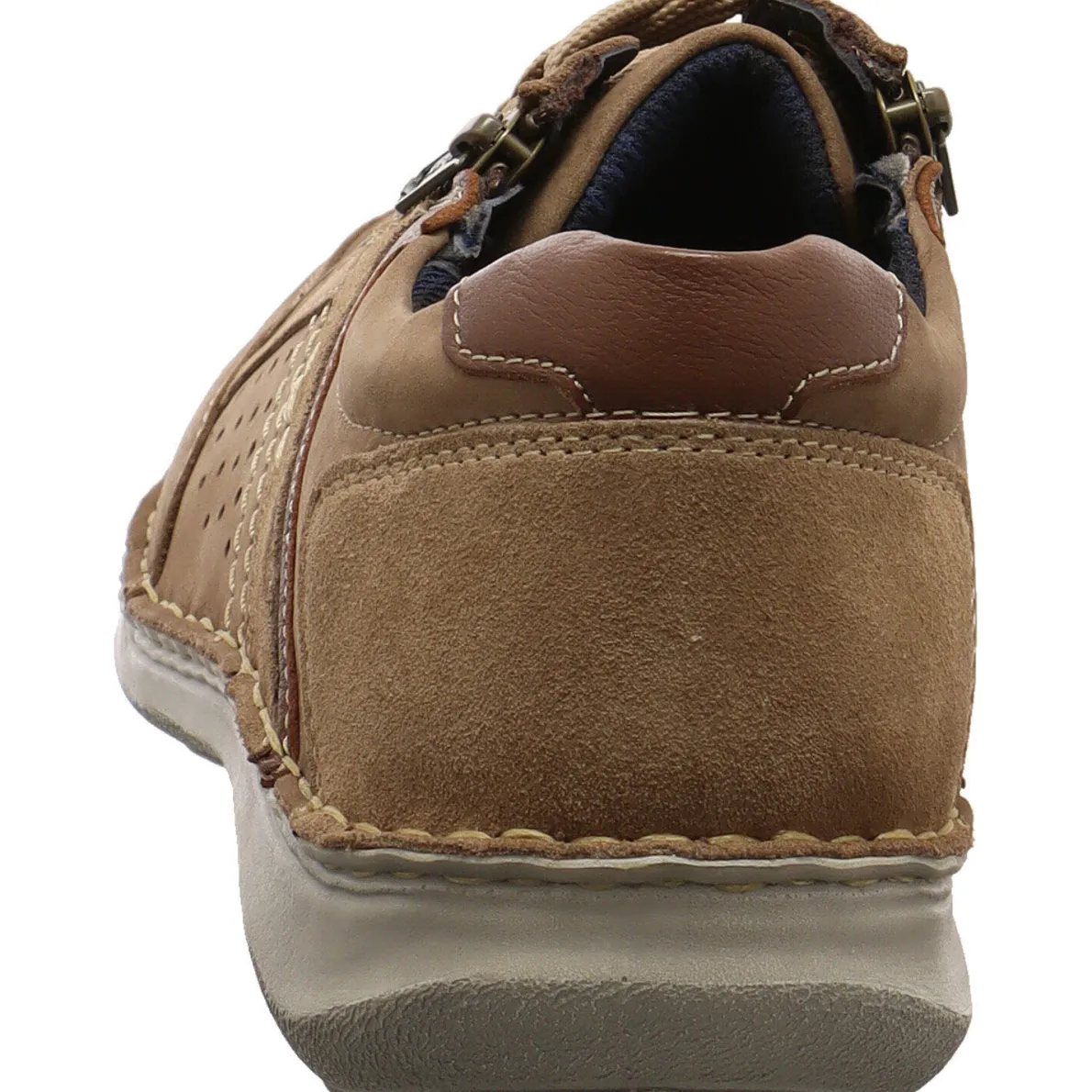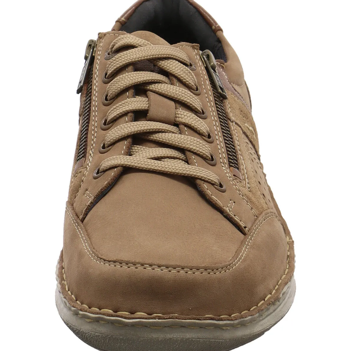Der New Anvers 87 von Josef Seibel ist ein Herren Schnürschuh aus hochwertigem Nubukleder in Beige. Die Glattleder Einsätze an der Ferse und an den Seiten geben dem Schnürschuh einen sportlichen Look. Für absoluten Tragekomfort sorgen der leicht gepolsterte Schaftrand, die anpassungsfähige Innenausstattung aus Leder und das unterfütterte Wechselfußbett.