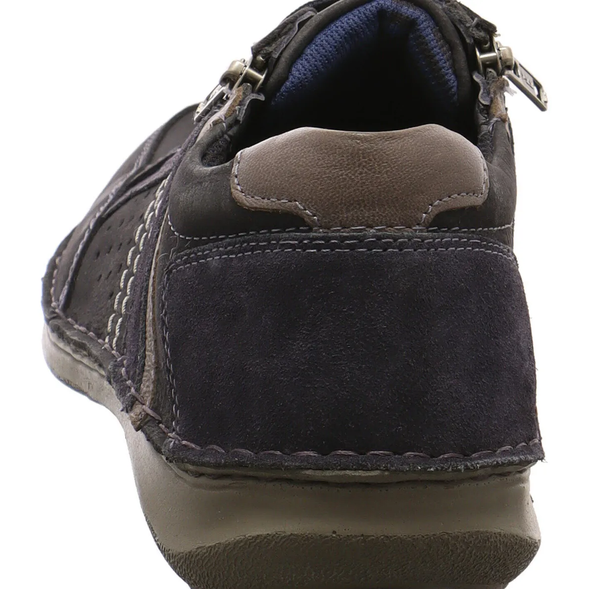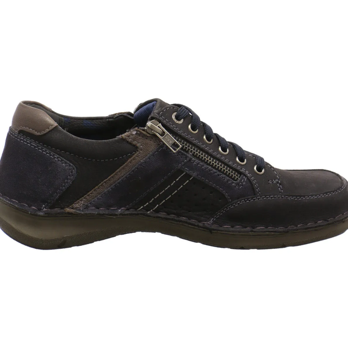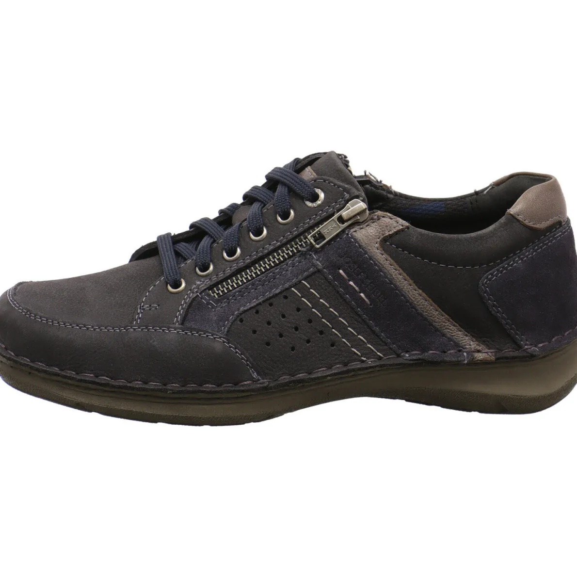 Der New Anvers 87 von Josef Seibel ist ein Herren Schnürschuh aus hochwertigem Echtleder in Blau. Die Velourleder Einsätze an der Ferse und an den Seiten geben dem Schnürschuh einen sportlichen Look. Für absoluten Tragekomfort sorgen der leicht gepolsterte Schaftrand, die anpassungsfähige Innenausstattung aus Leder und das unterfütterte Wechselfußbett.