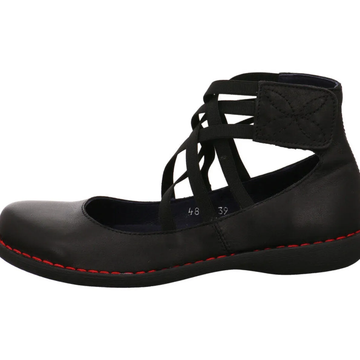 Dieser schöne Ballerina Vevet Negro in Schwarz beigeistert durch sein ungewöhnliches Design und ist ein Schuh zum wohlfühlen. Am Knöchel befindet sich ein Riemen, welcher mit einem dezenten Klettverschluss ausgestattet ist. Elastische Zierbänder verbinden den Riemen harmonisch mit dem unter Teil des Schuh. Die Ziernaht in Rot rund um den Schuh ist ein zusätzlicher Hingucker.