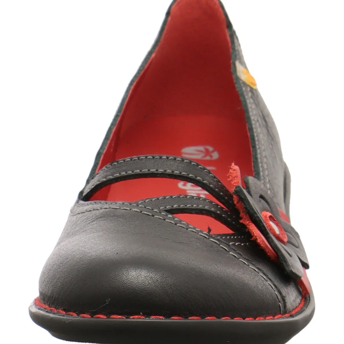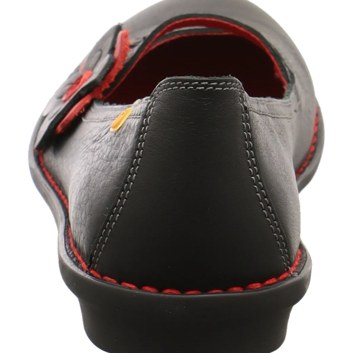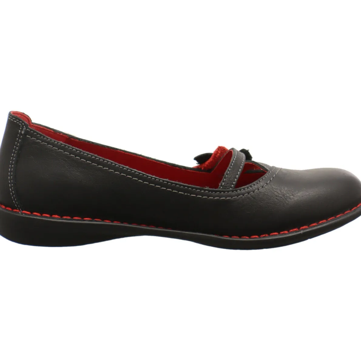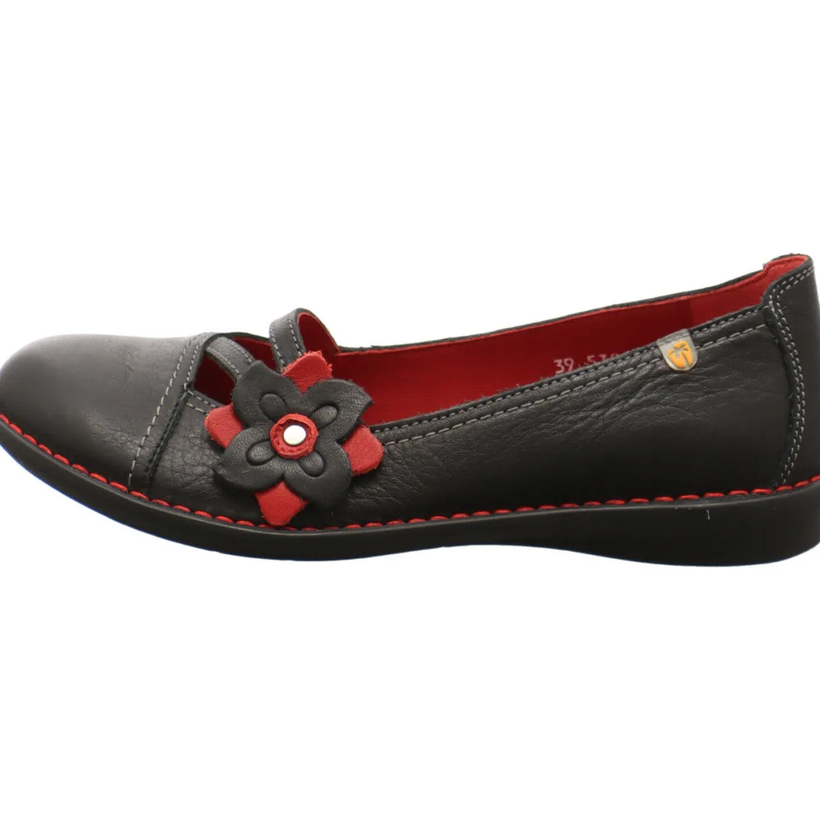Dieser schöne Damen Ballerina in Schwarz mit Akzenten in Rot beigeistert durch sein ungewöhnliches Design und ist ein Schuh zum wohlfühlen. Die Blume auf dem Blatt ist ein besonders schönes Detail.