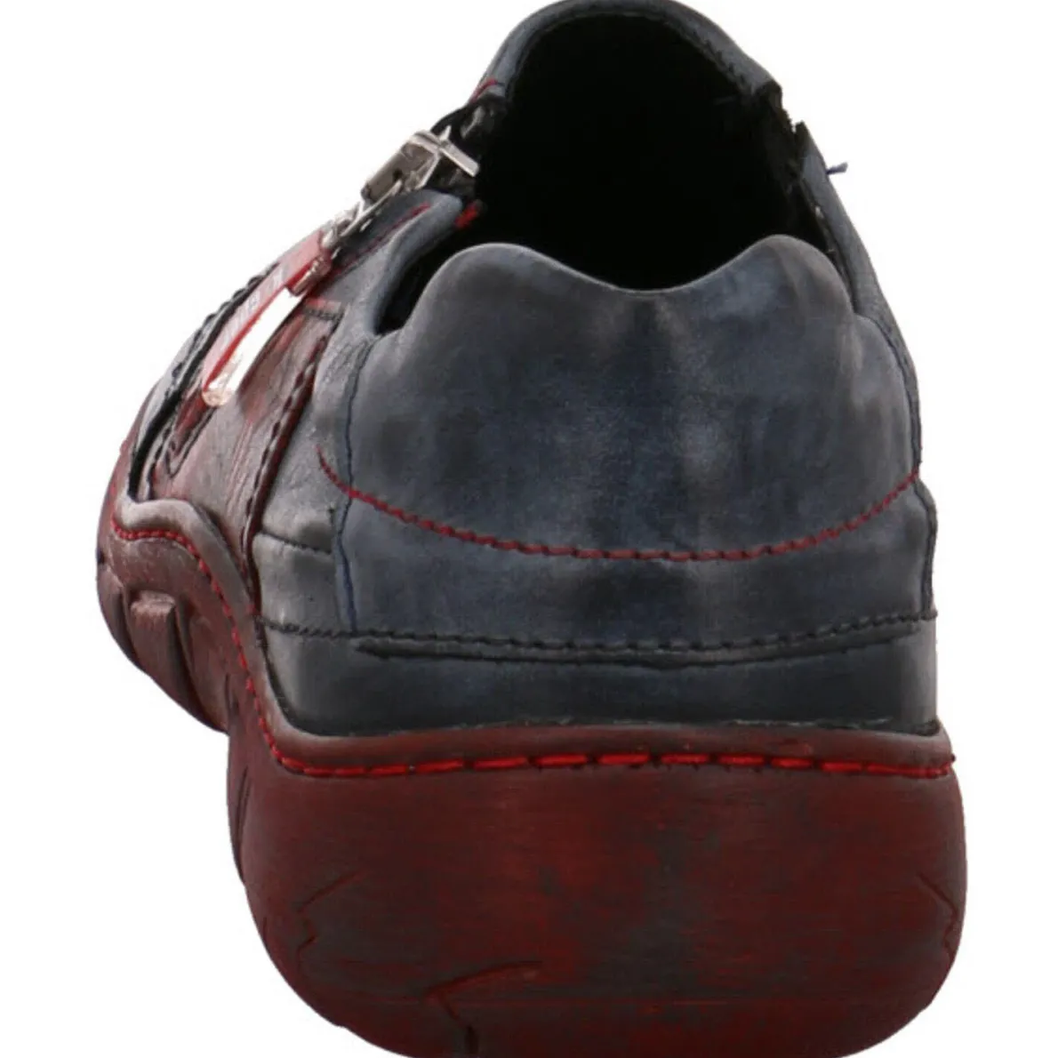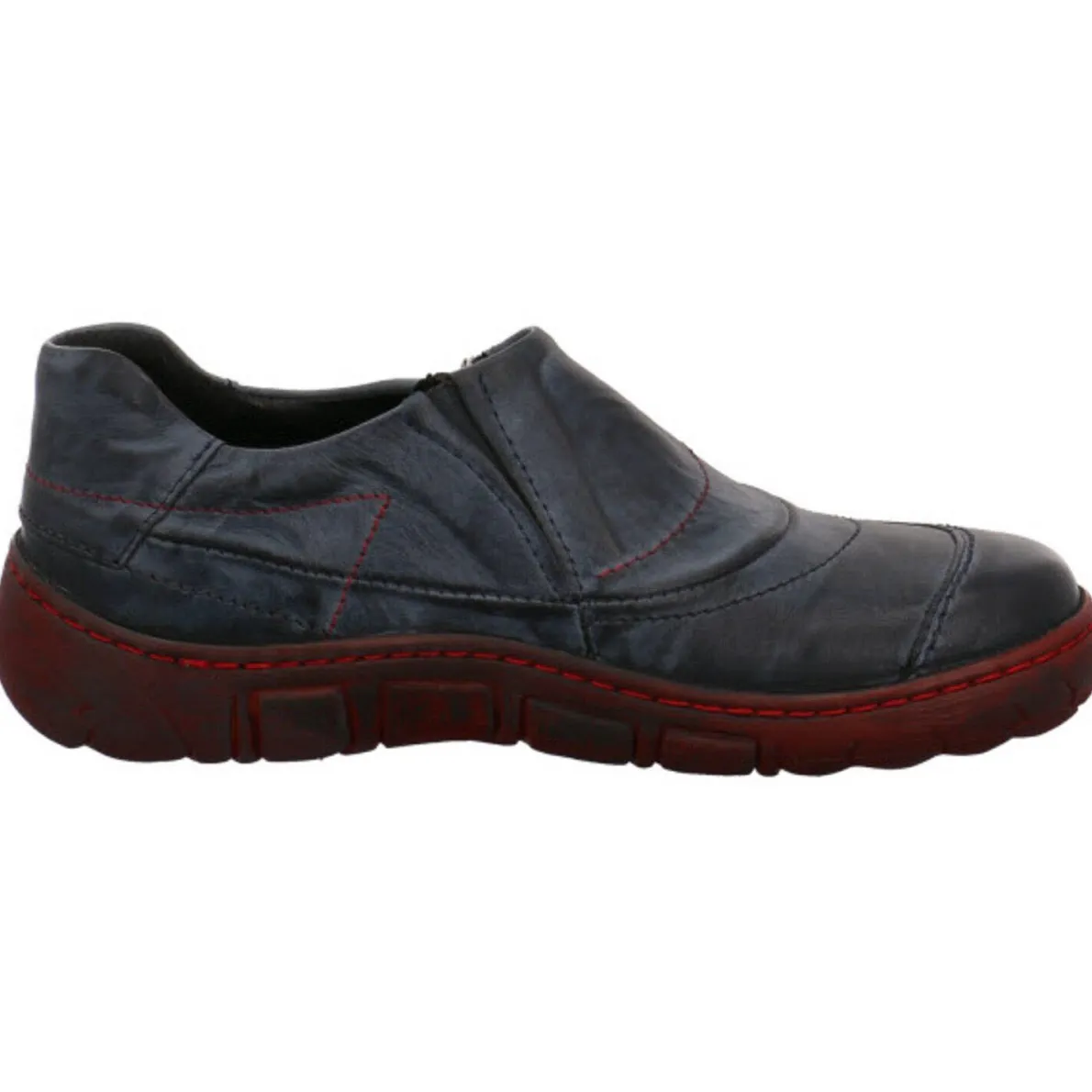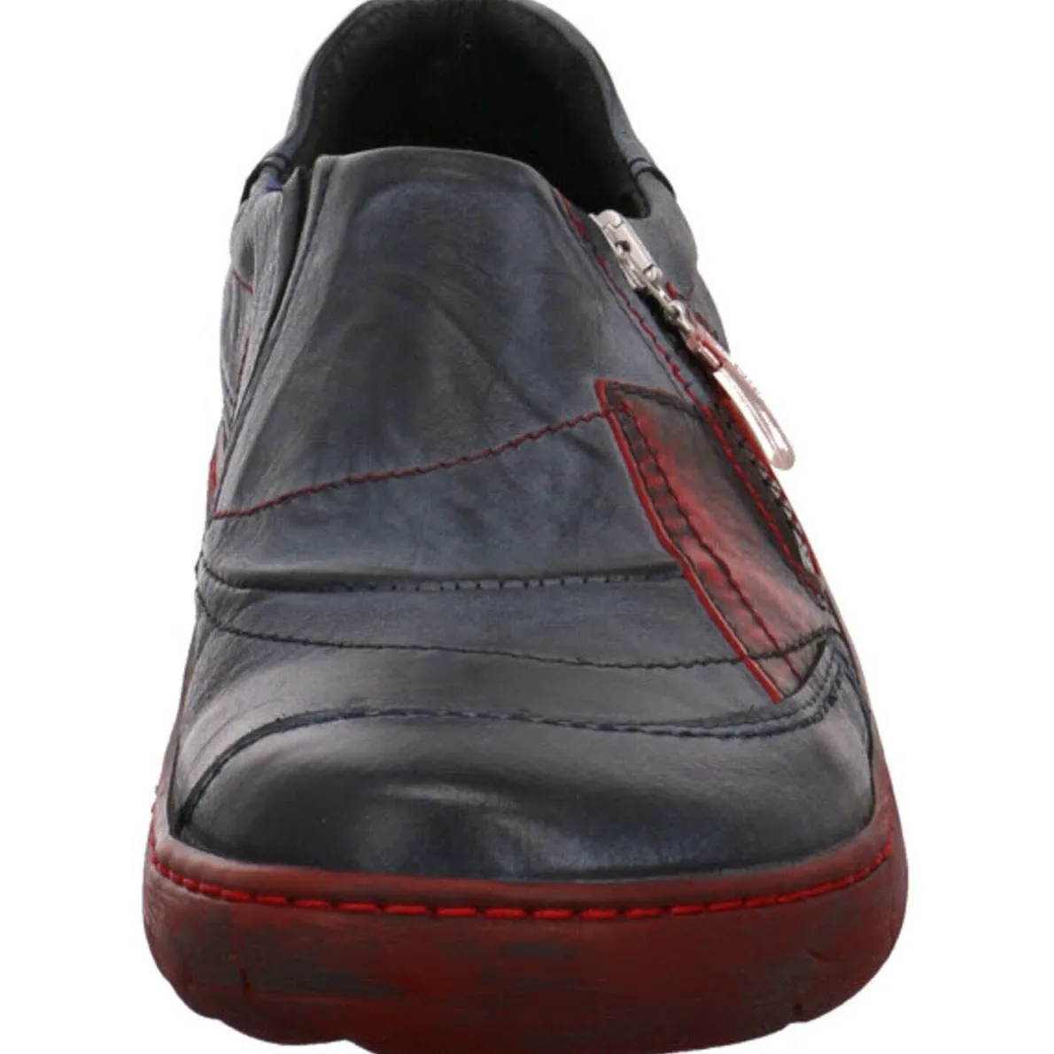 Ein Schuh aus dem Hause Kacper ist immer ein Hingucker in deinem Schuhschrank und dieser Slipper für Damen dabei keine Ausnahme. Er ist innen und außen aus hochwertigem Leder verarbeitet, was den Schuh besonders angenehm zu tragen macht. Der Look in Vintage blau und rot wird durch auffällige Nähte und Overlays komplettiert, die dem Slipper ein cooles Design verleihen. Der seitliche Reißverschluss und ein Stretch Einsatz sorgen für einen komfortablen Einstieg. Mit der Laufsohle, die für das Label typisch auffällig gestaltet ist, hast du stets sicheren Halt auf allen Untergründen. Das Wechselfußbett aus Leder ist antibakteriell und sorgt für eine gute Luftzirkulation, sodass immer ein angenehmes Fußklima herrscht.