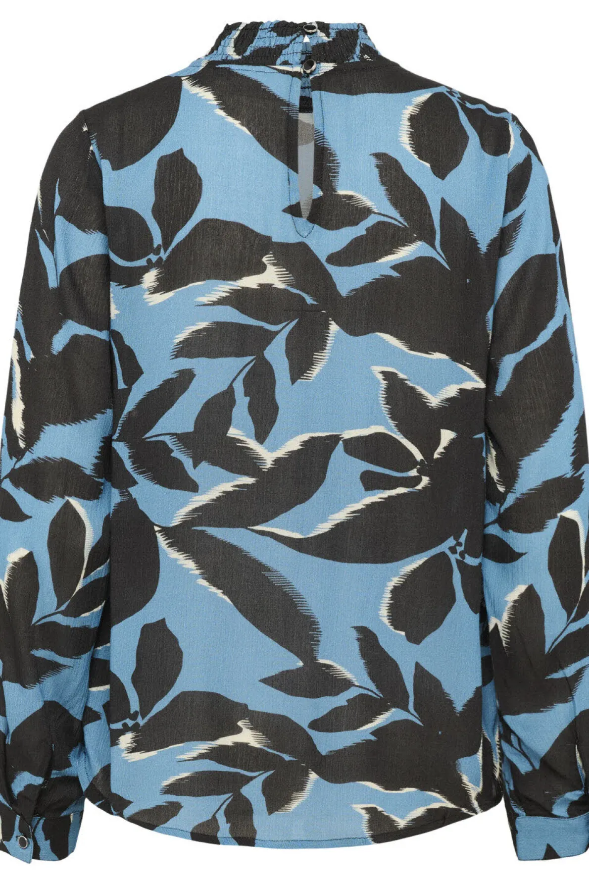 Der leichte, fließende Viskose Stoff in Blau ist mit einem Print in Schwarz, mit Blättern verziert und verleiht ihr einen verspielten Look.