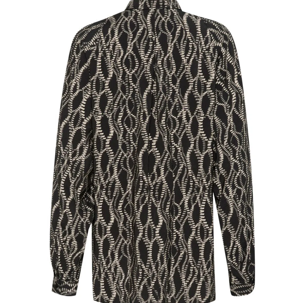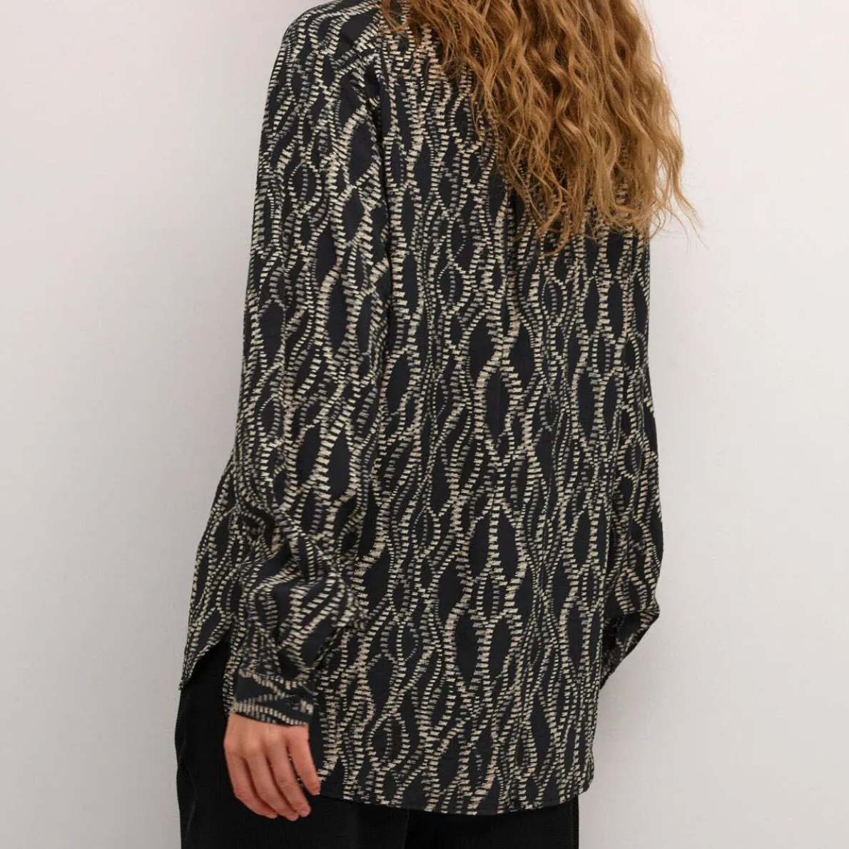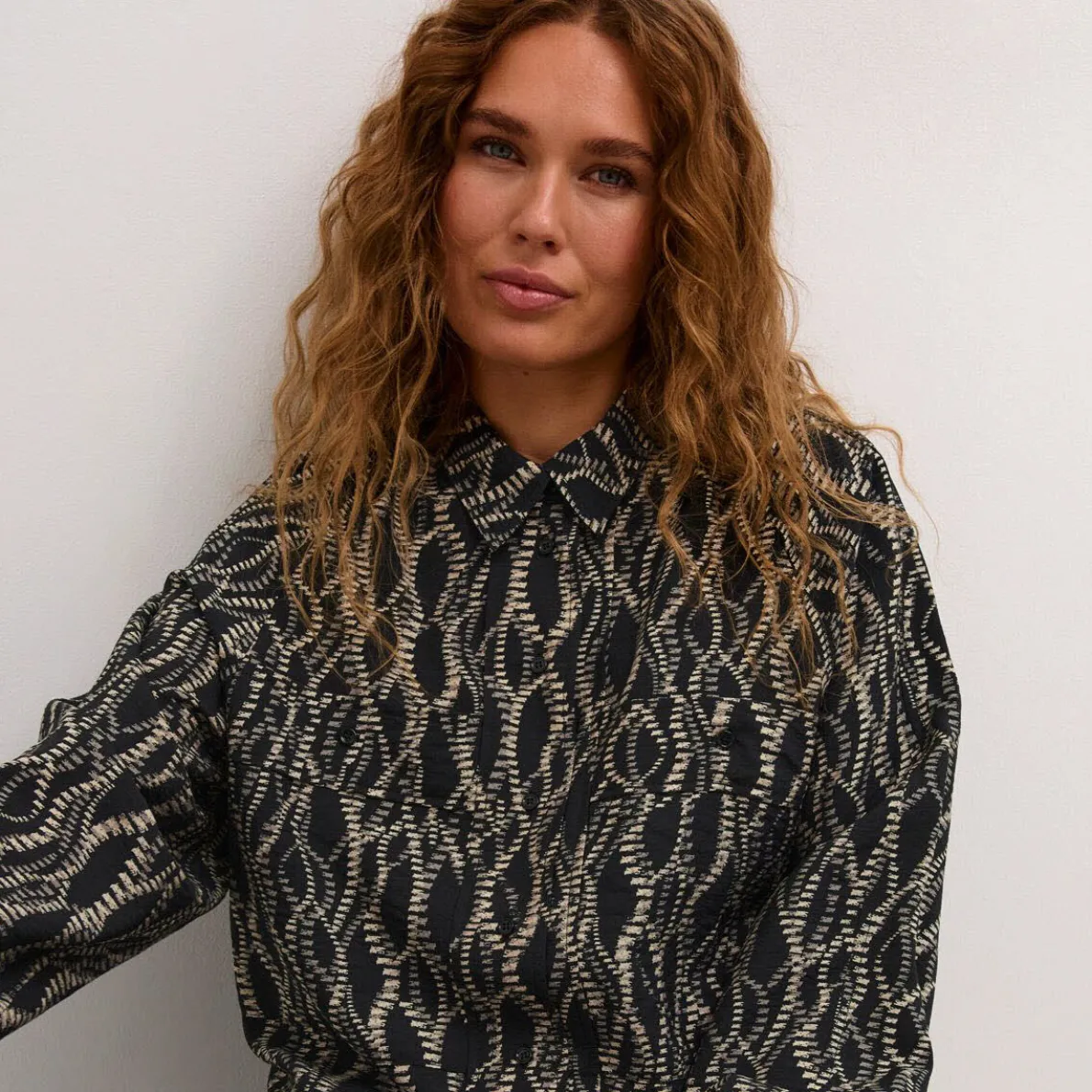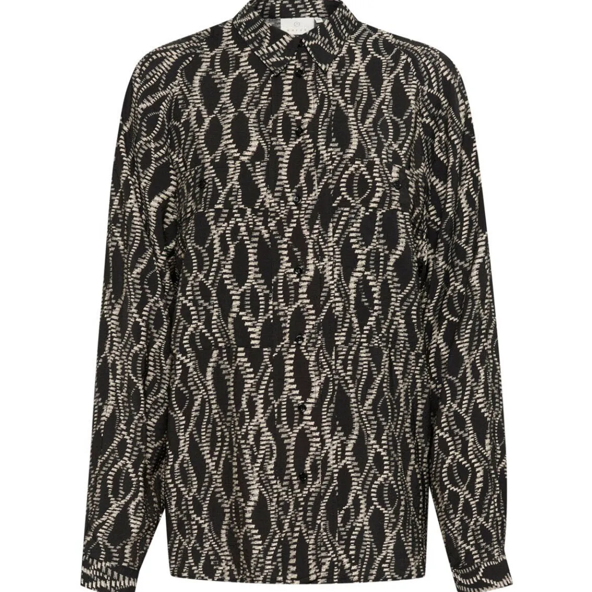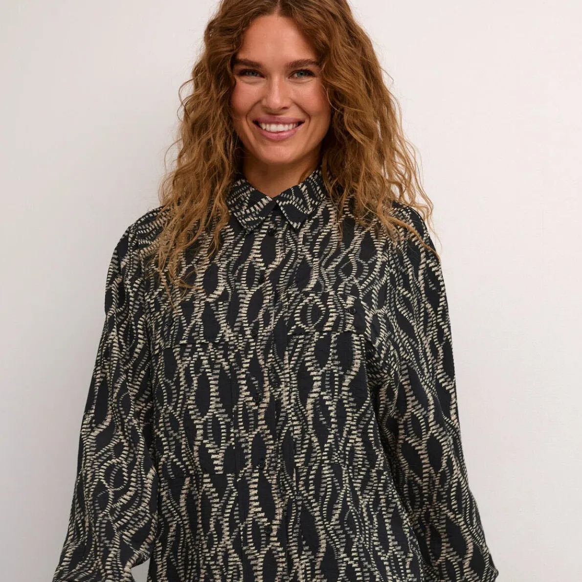 Ob für das Büro oder die Freizeit, mit der Damen Bluse KAdunora Hemd von Kaffe, hast du einen tollen Allrounder in deinem Kleiderschrank. Das Mischgewebe in Schwarz ist mit einem tollen graphischen Muster verziert. Die langen Ballonärmel geben ihr das gewisse Etwas. Sie hat einen klassischen Kragen, an den langen Ärmel Manschetten und eine durchgehende Knopfleiste. Durch ihren Loose Fit Schnitt kannst du sie ganz leger tragen.