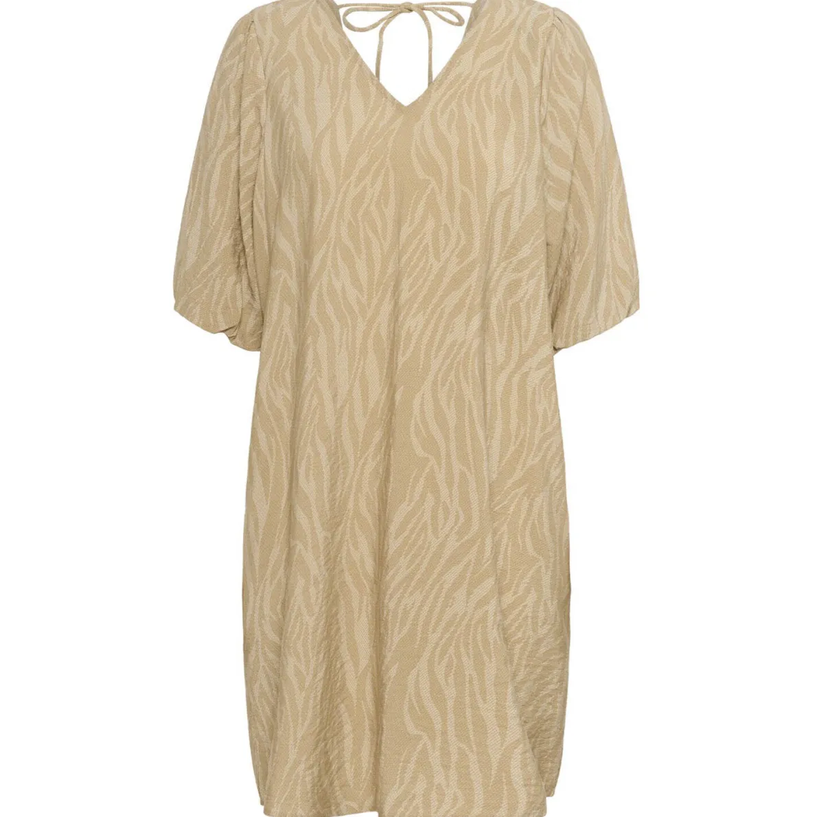 Das Viskose Mischgewebe in Beige ist luftig leicht und im Loose Fit Schnitt gearbeitet. Hingucker ist dabei der Chinchilla Animal Print. Es hat einen V-Ausschnitt und auf der Rückseite zwei Bänder, die zu einer Schleife gebunden werden können und zusätzlichen Halt geben. Die kurzen Ärmel haben einen Gummibund eingearbeitet und haben so einen tollen Fall am Arm.