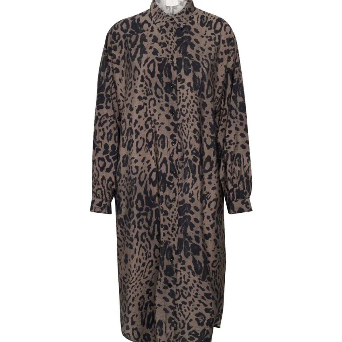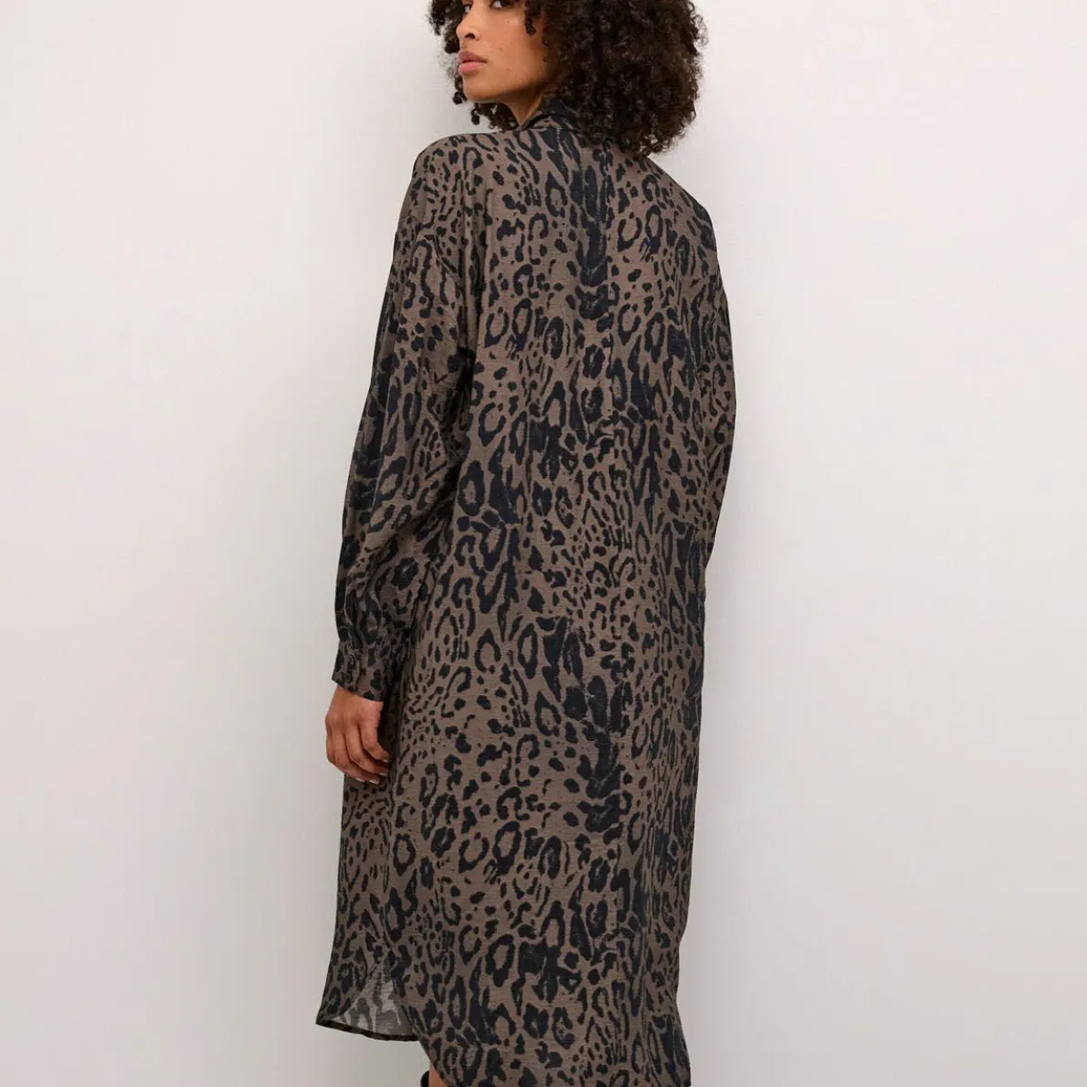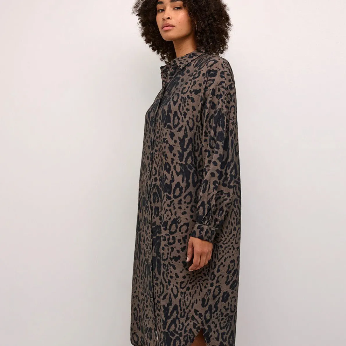 Es ist im Leo Animal Print in Braun gearbeitet. Durch den Polokragen und die durchgängige Knopfleiste, hat es den typischen Look für ein Hemdblusenkleid.