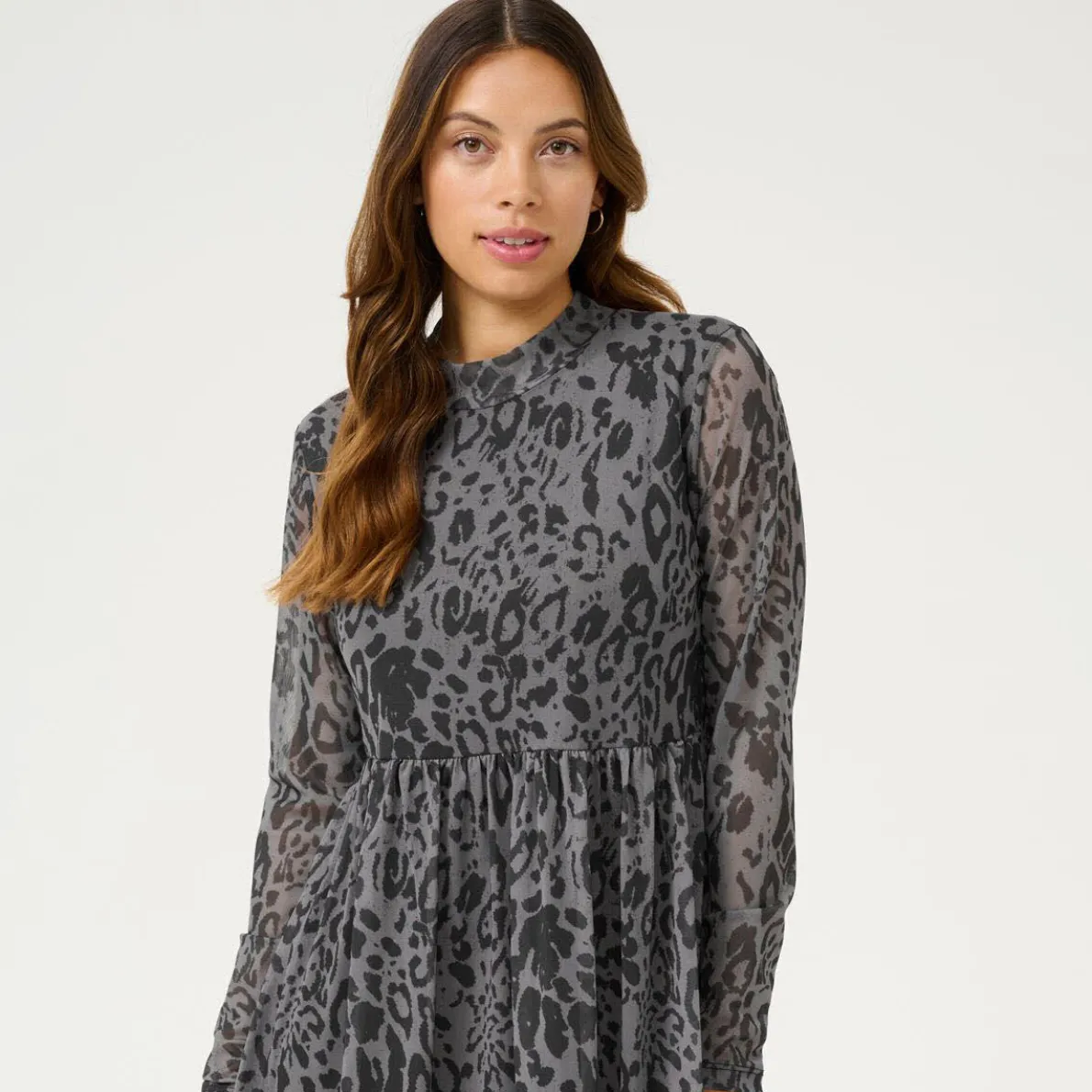 Das Mischgewebe in Braun ist mit einem modischen Leo Animal Print verziert und macht es zu etwas Besonderem. Weitere Highlights sind der kleine Stehkragen und die transparenten Ärmel. Durch den taillierten Schnitt ist es besonders feminin.
