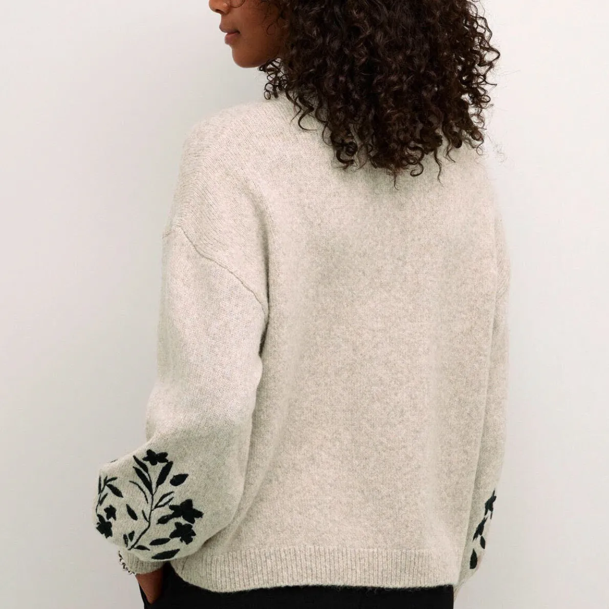 Das Strickgewebe in Grau wurde aus zertifizierten Materialien hergestellt. Als Highlight ist am langen Ärmel eine Blumen Stickerei in Schwarz zu sehen. Die Ärmel sind mit Bündchen in Rippstrick versehen, wodurch der Arm einen weiten angenehmen Schnitt hat und optisch toll zur Geltung kommt. Durch die Regular Fit Schnittform ist er besonders angenehm zu tragen und passt zu vielen Looks.