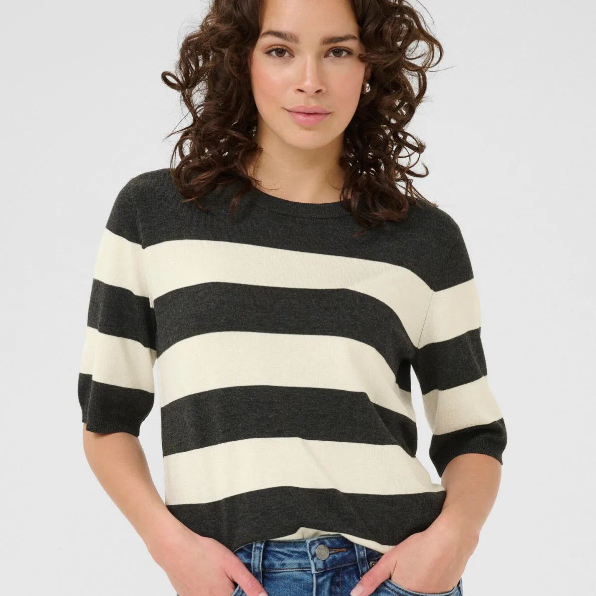 Das feine Strickgewebe im modischen Streifenmuster in Schwarz mit Weiß ist mit einem klassischen Rundhalsausschnitt gearbeitet. Dieser und die halblangen Ärmel, sind mit einem breiten Bund versehen und besonders angenehm zu tragen. Er hat einen Regular Fit Schnitt und lässt sich vielseitig kombinieren.