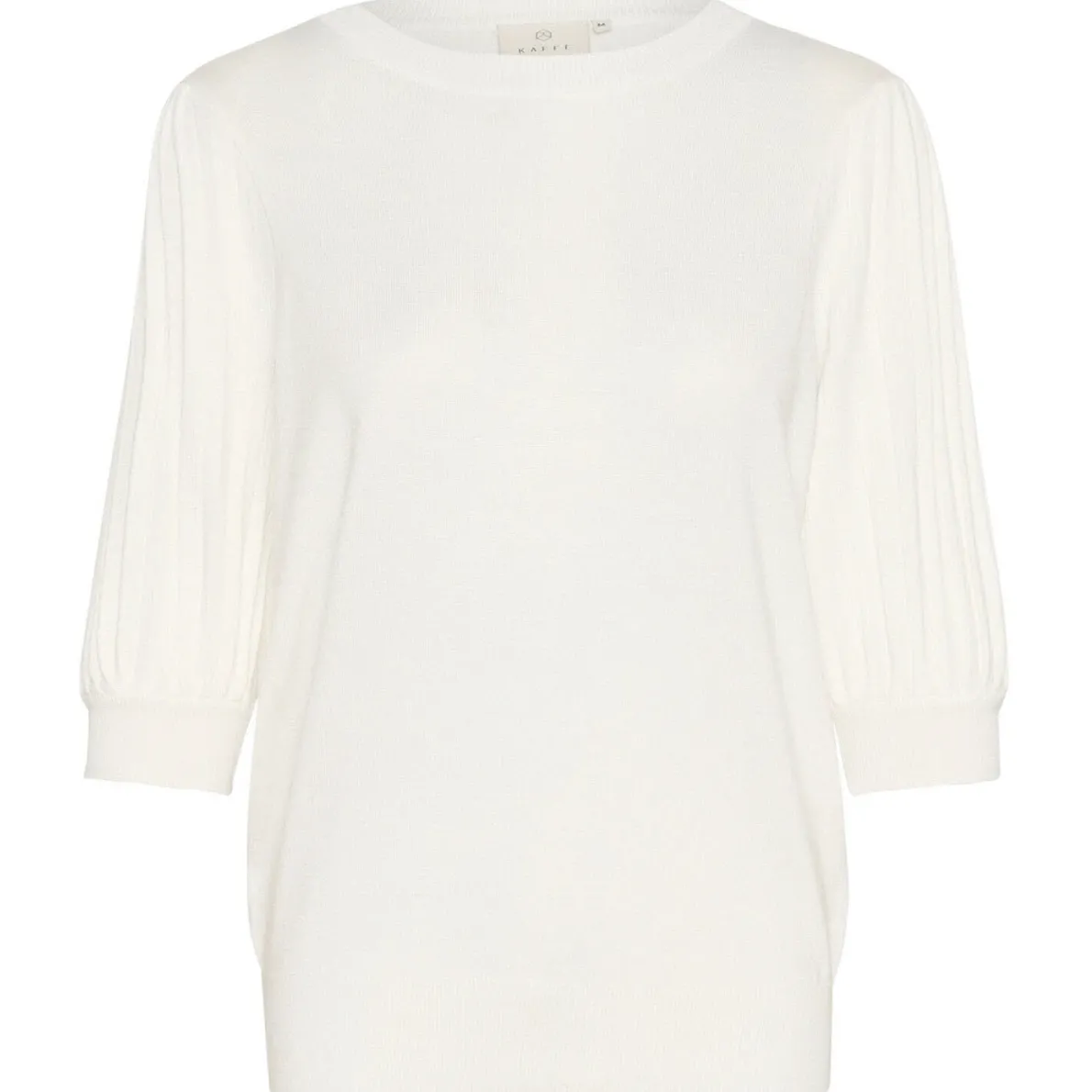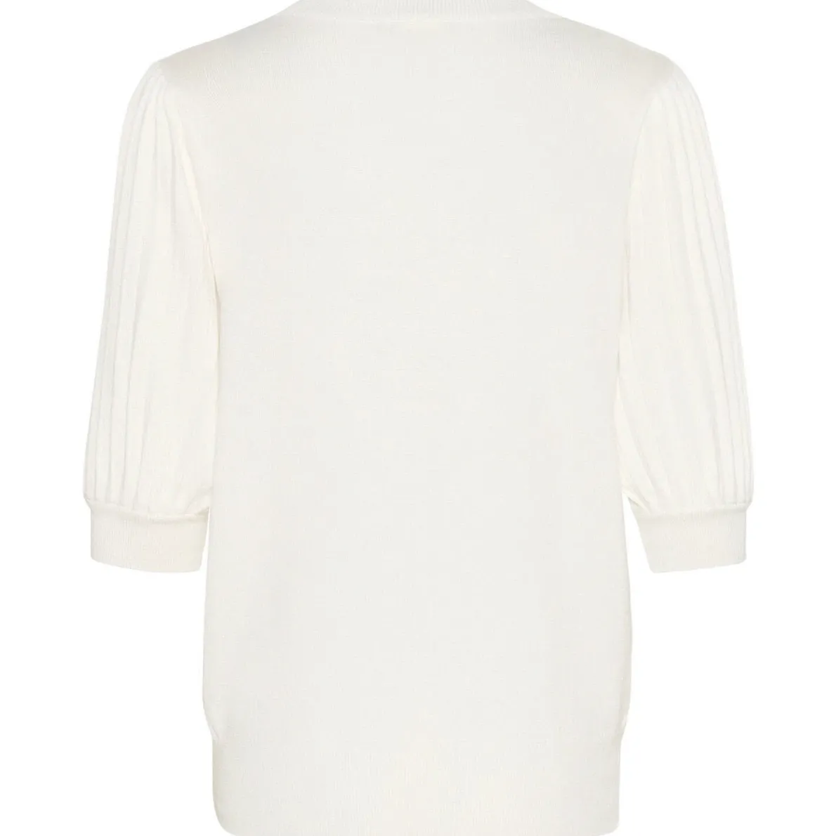 Er wurde aus einem leichten Strickgewebe in Creme Weiß gearbeitet und hat einen klassischen Rundhalsausschnitt. Absolute Eyecatcher sind die halblangen Puffärmel mit einer dezenten Struktur.