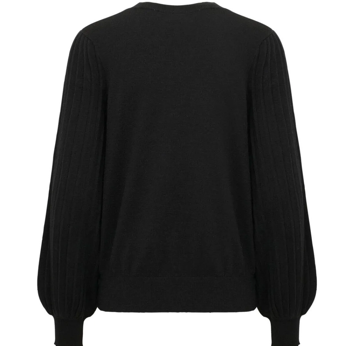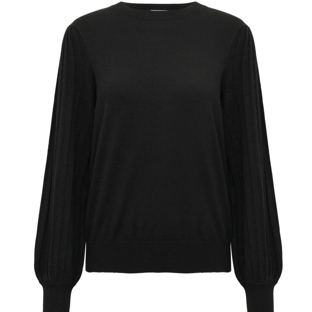Das Mischgewebe in Schwarz, ist mit einem Rundhalsausschnitt versehen. Er hat lange Ärmel, welche mit Plisseefalten verziert und weiter geschnitten sind. Der Regular Fit, lässt sich super angenehm tragen und zu jedem Outfit super kombinieren.
