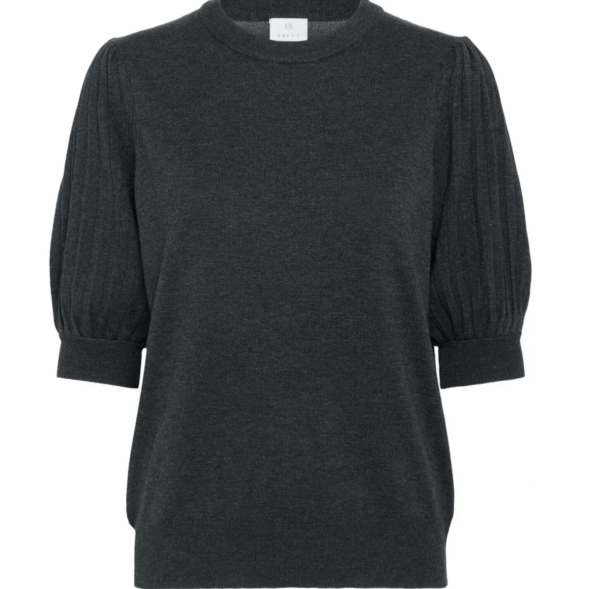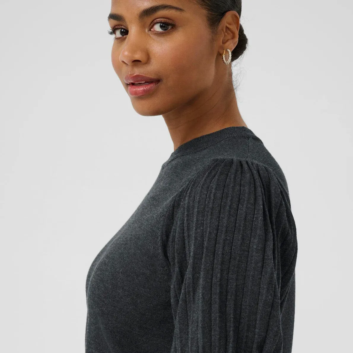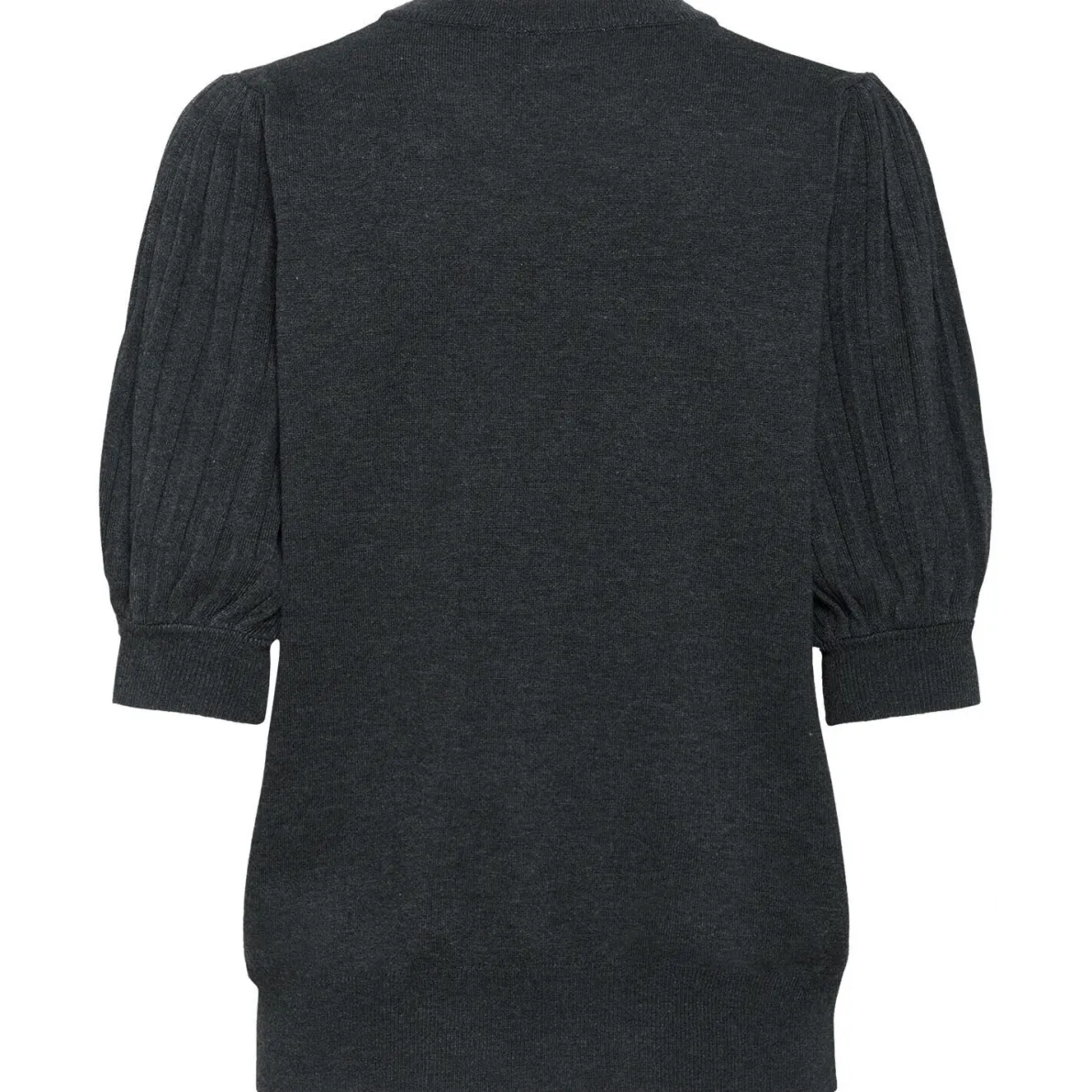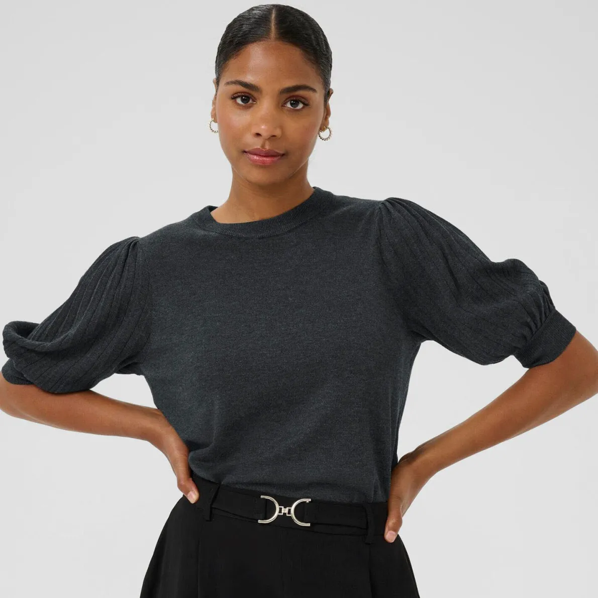 Er wurde aus einem leichten Strickgewebe in Grau gearbeitet und hat einen klassischen Rundhalsausschnitt. Absolute Eyecatcher sind die halblangen Puffärmel mit einer dezenten Struktur.