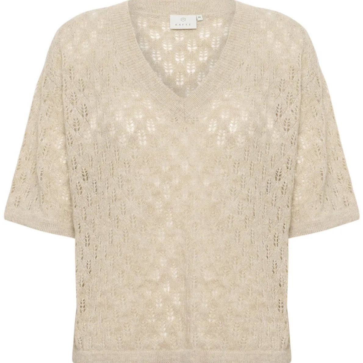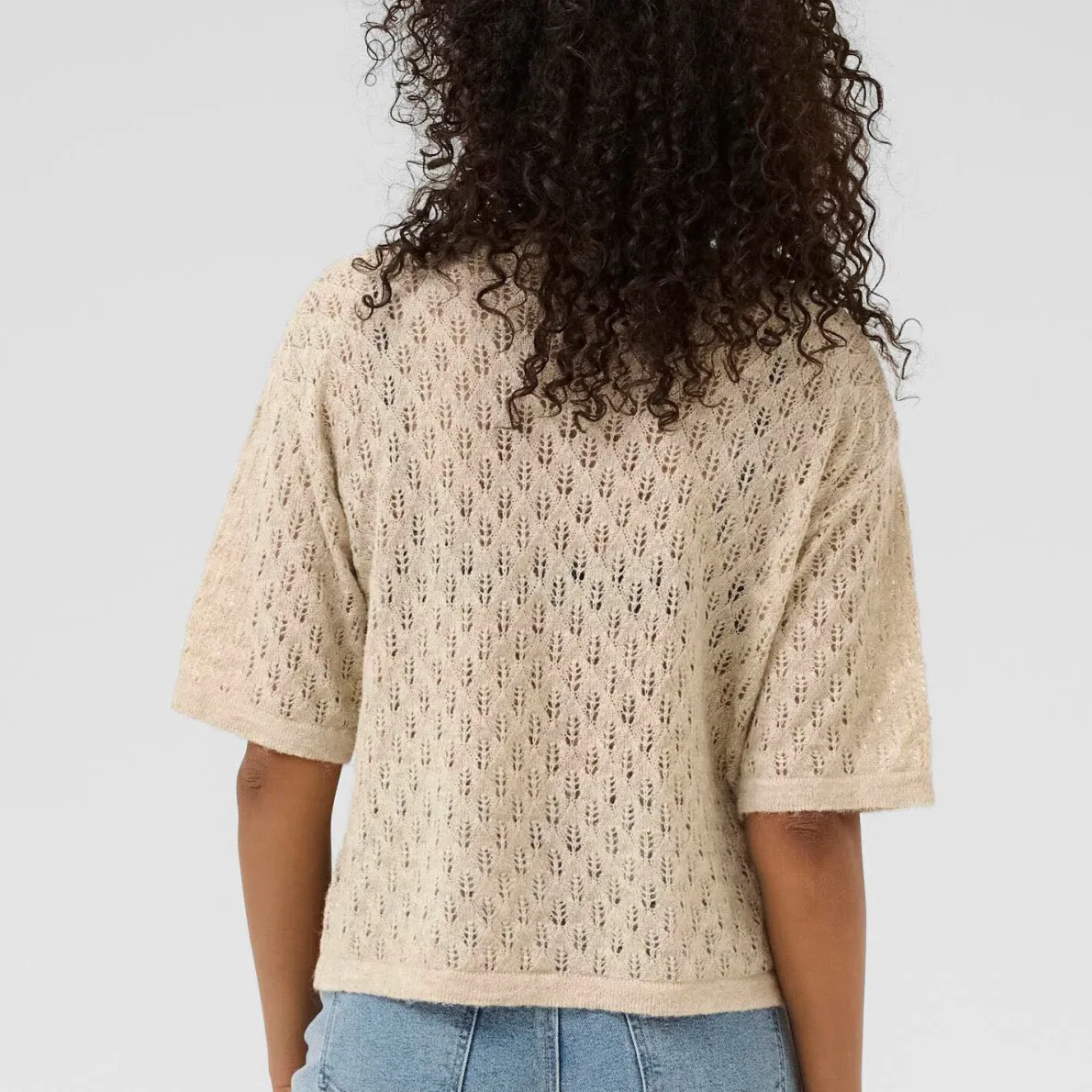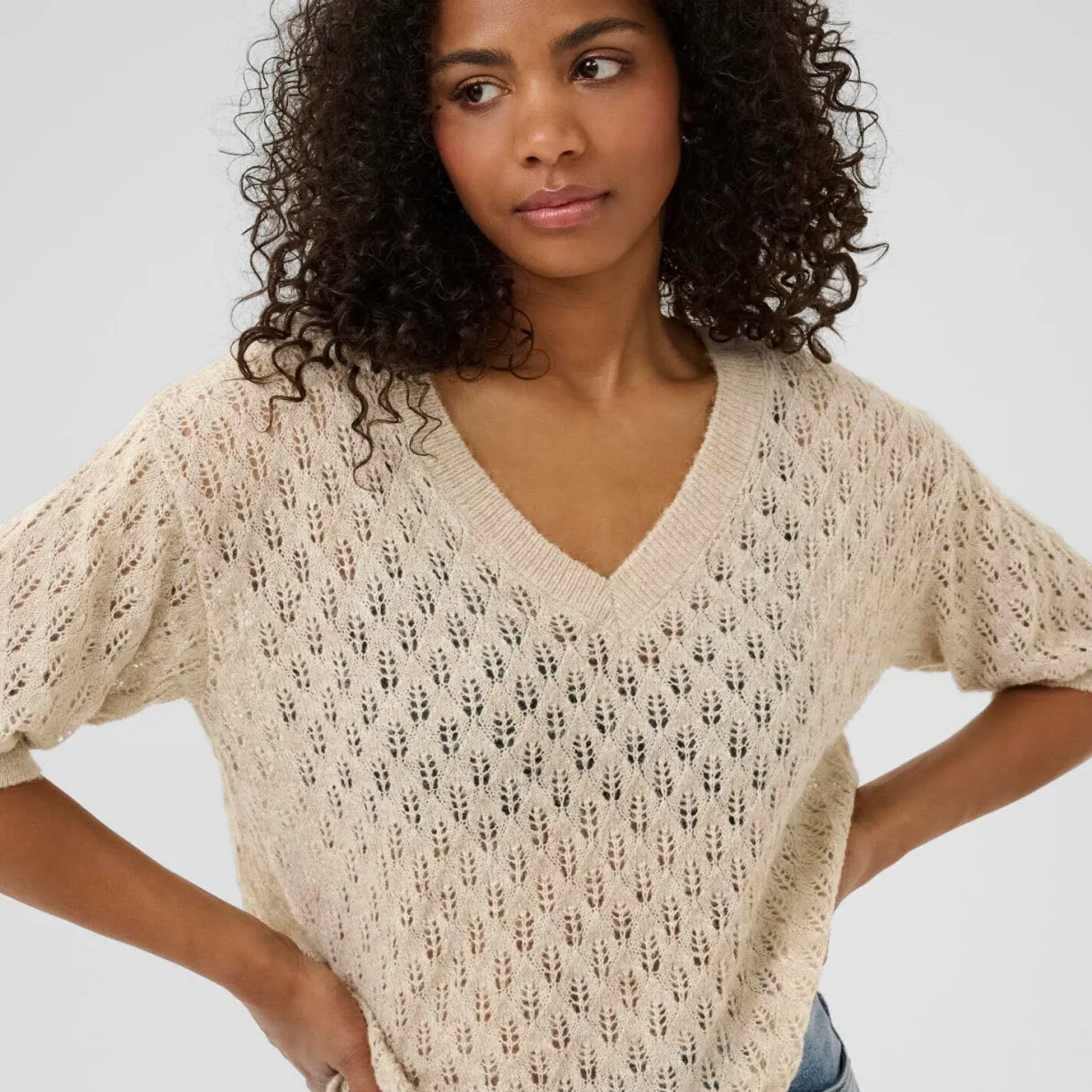 Das feine Strickgewebe in Beige ist mit feinen Ajour Details versehen. Er hat einen V-Ausschnitt und halblange Ärmel. Durch seinen Baggy Fit Schnitt ist er besonders bequem und kann super im Layering Look getragen werden.