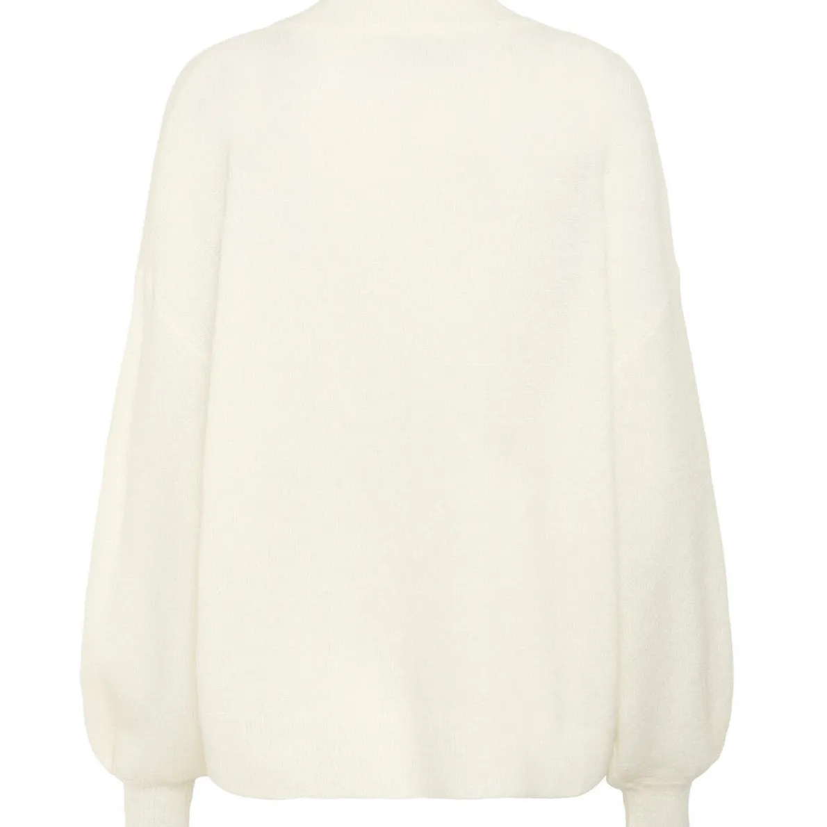Der Pullover wurde in einer lockeren Passform in Creme Weiß gearbeitet und ist besonders angenehm zu Tragen. Er hat einen klassischen Rundhalsauschnitt, der schön am Hals anliegt und die langen Ärmel haben Rippstrickbündchen.