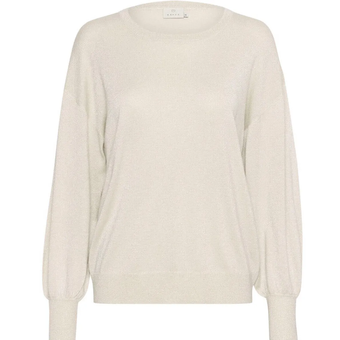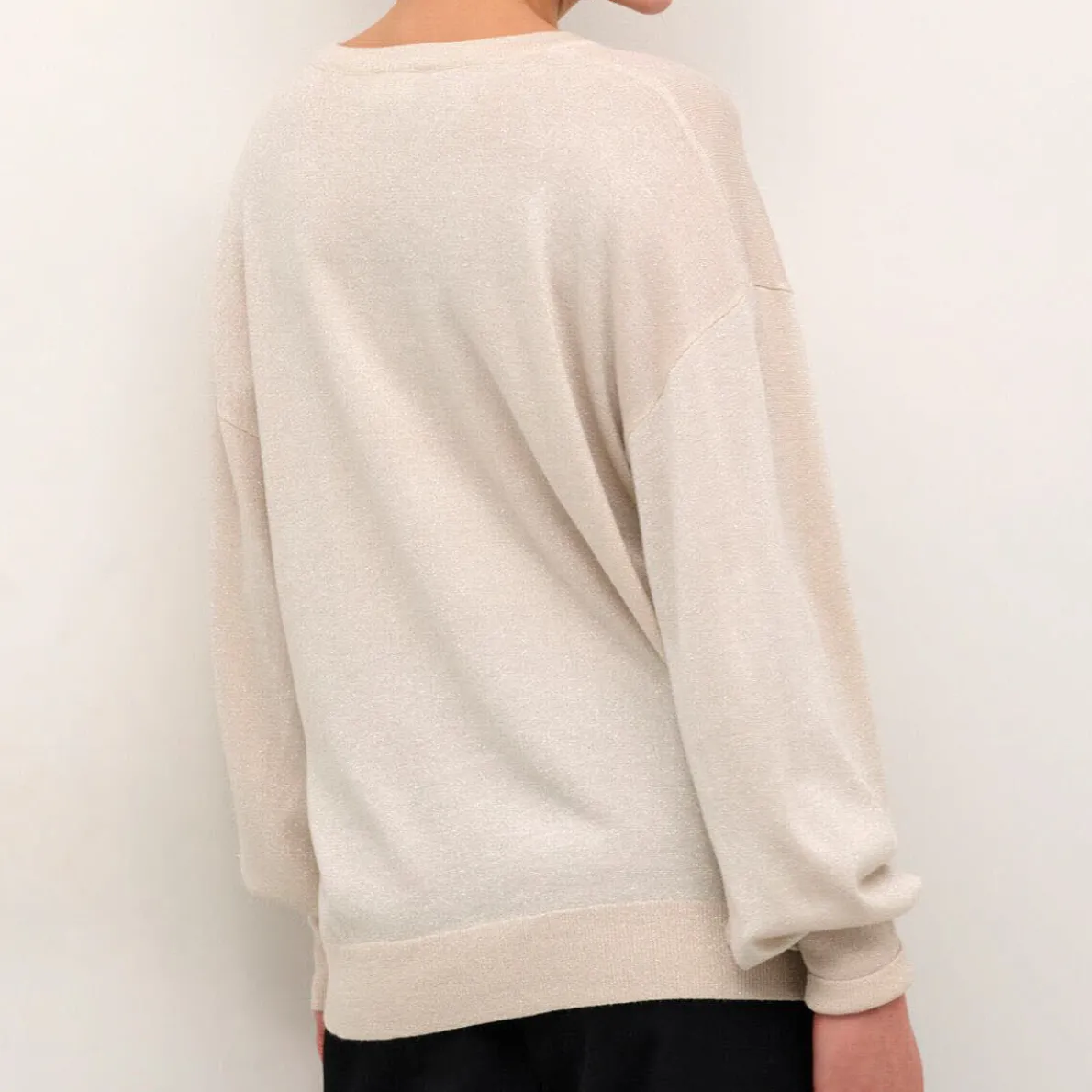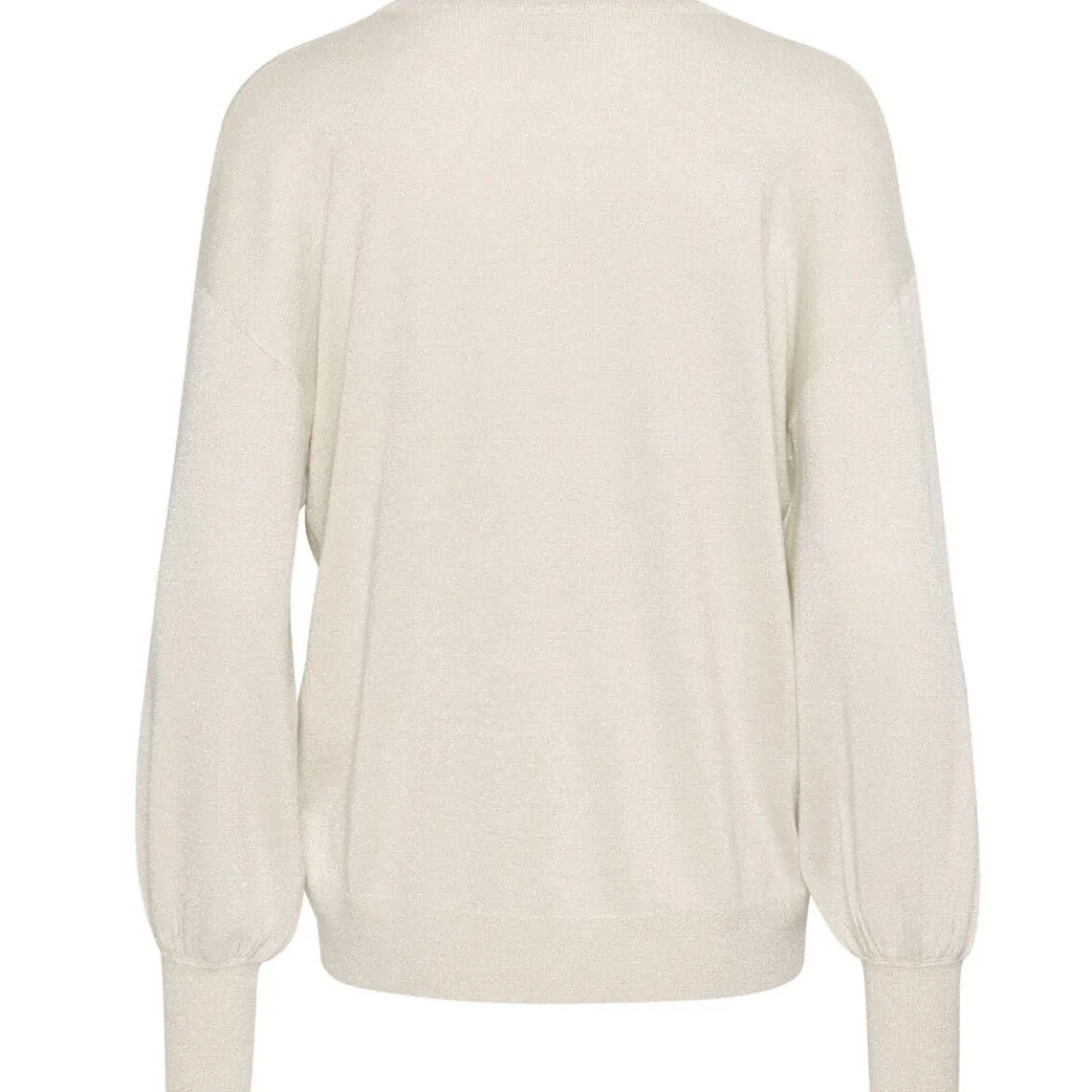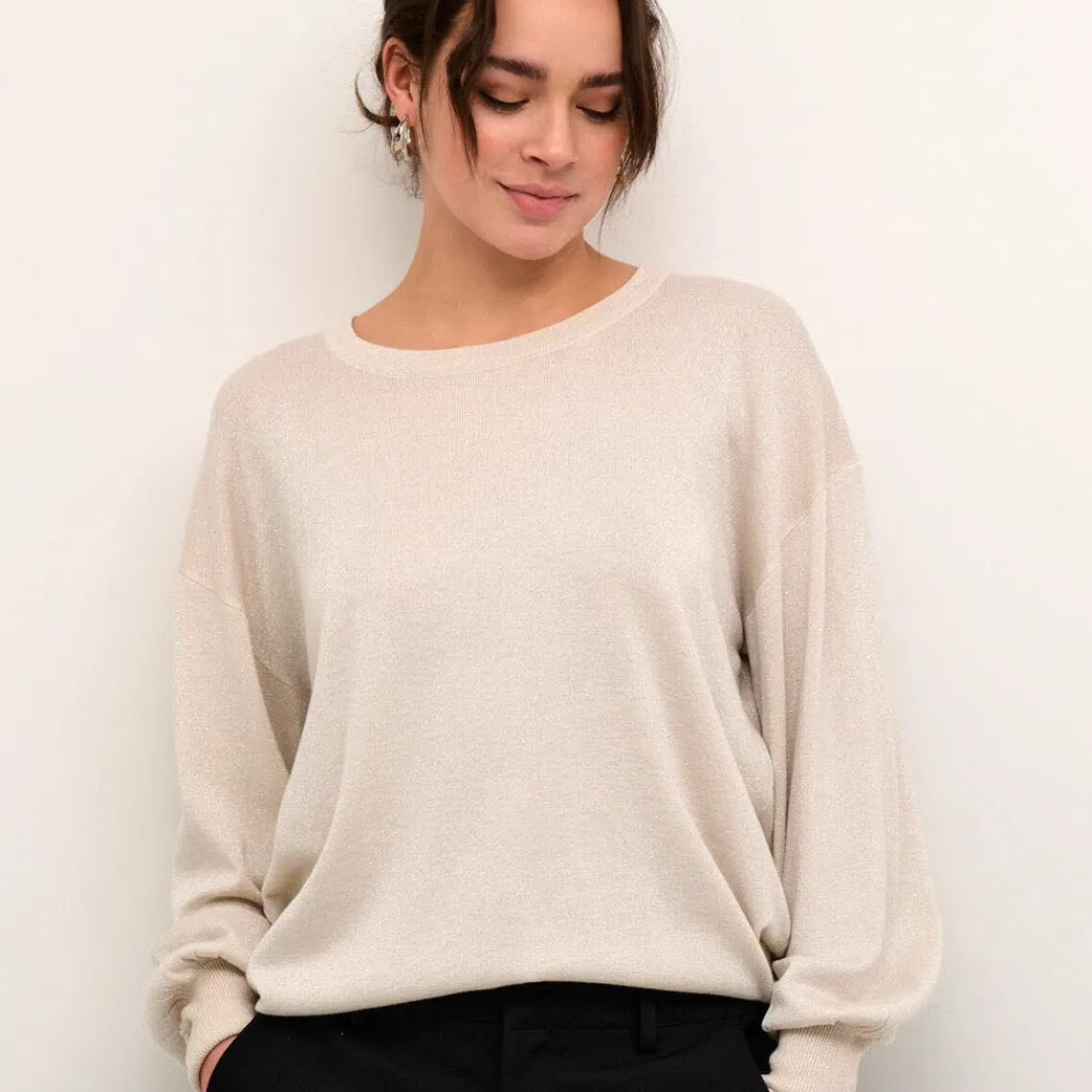 Aus einem hochwertigen Strickmaterial in Beige gefertigt, ist ein Metall Faden eingearbeitet, wodurch das Material ganz toll schimmert.