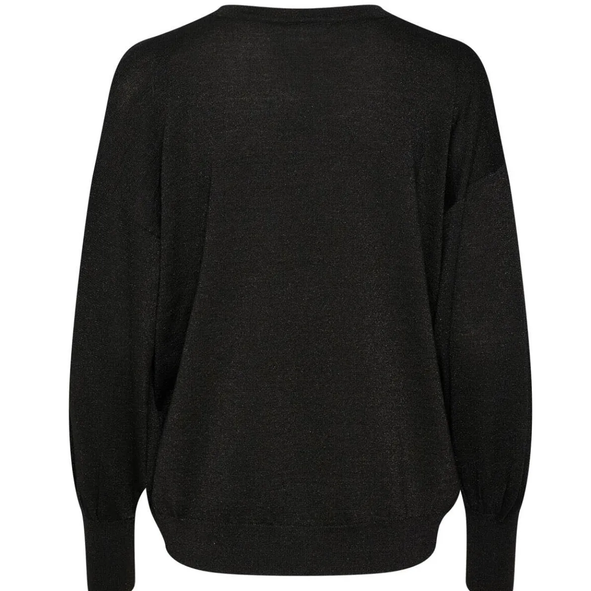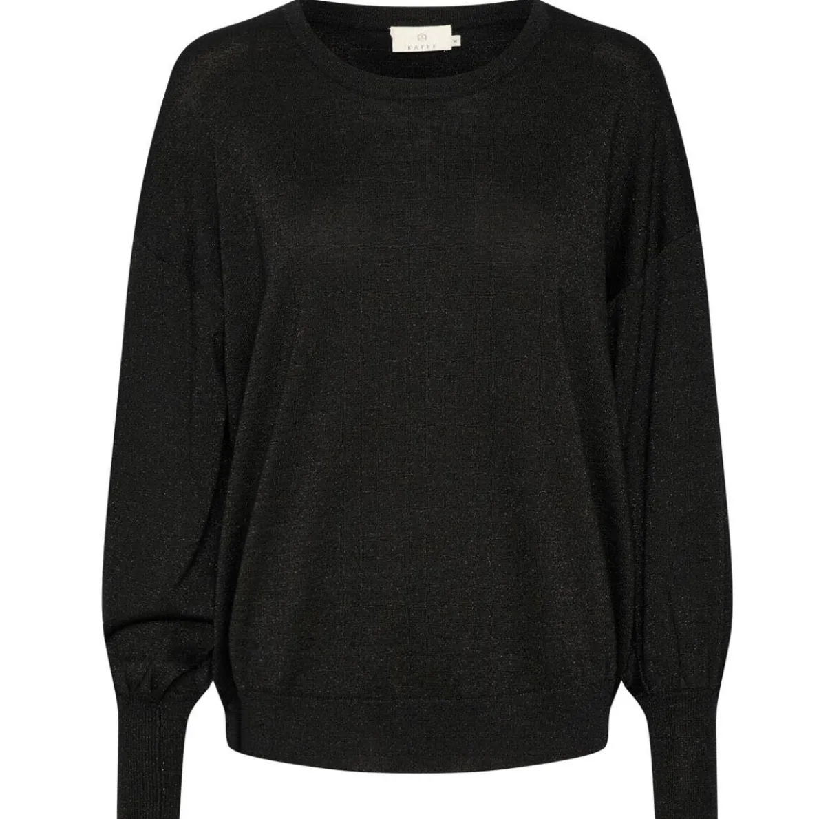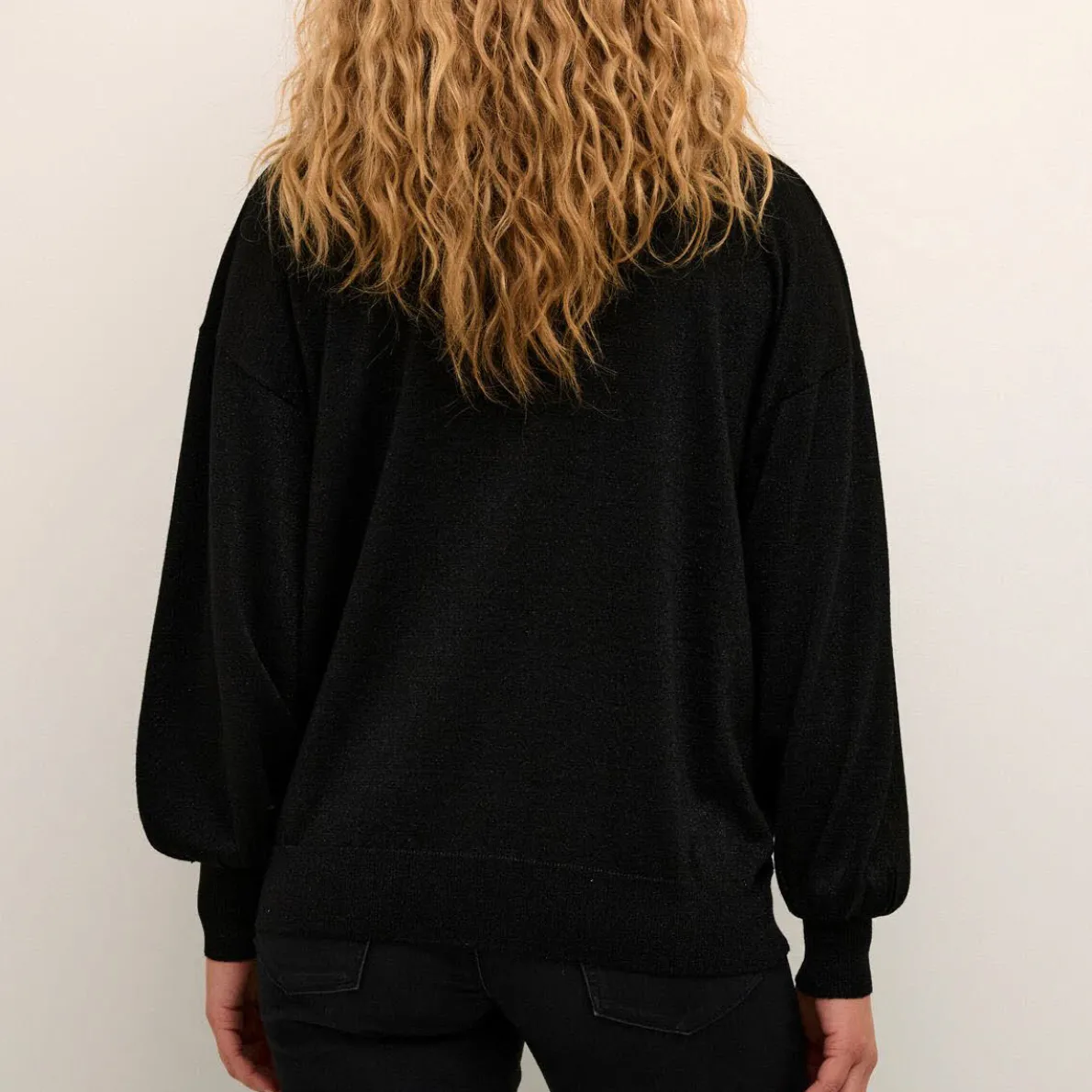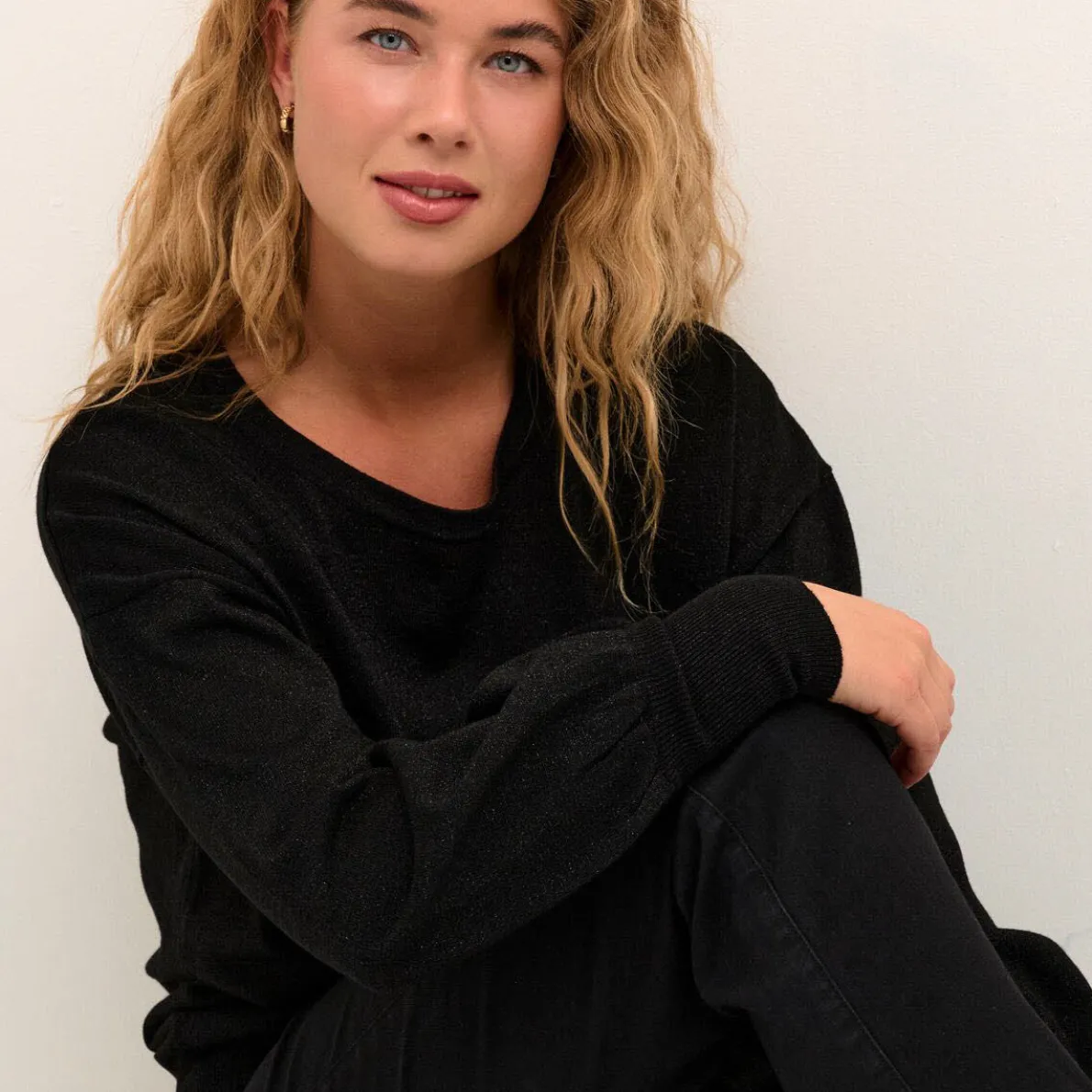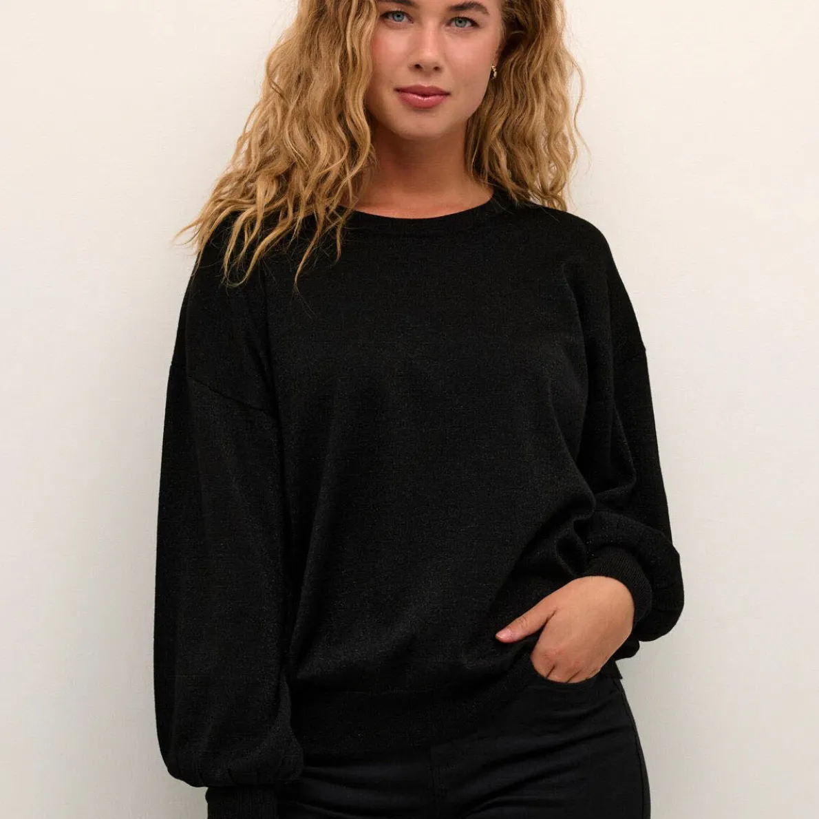 Aus einem hochwertigen Strickmaterial in Schwarz gefertigt, ist ein Metall Faden eingearbeitet, wodurch das Material ganz toll schimmert.