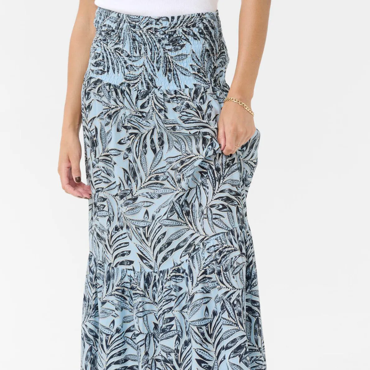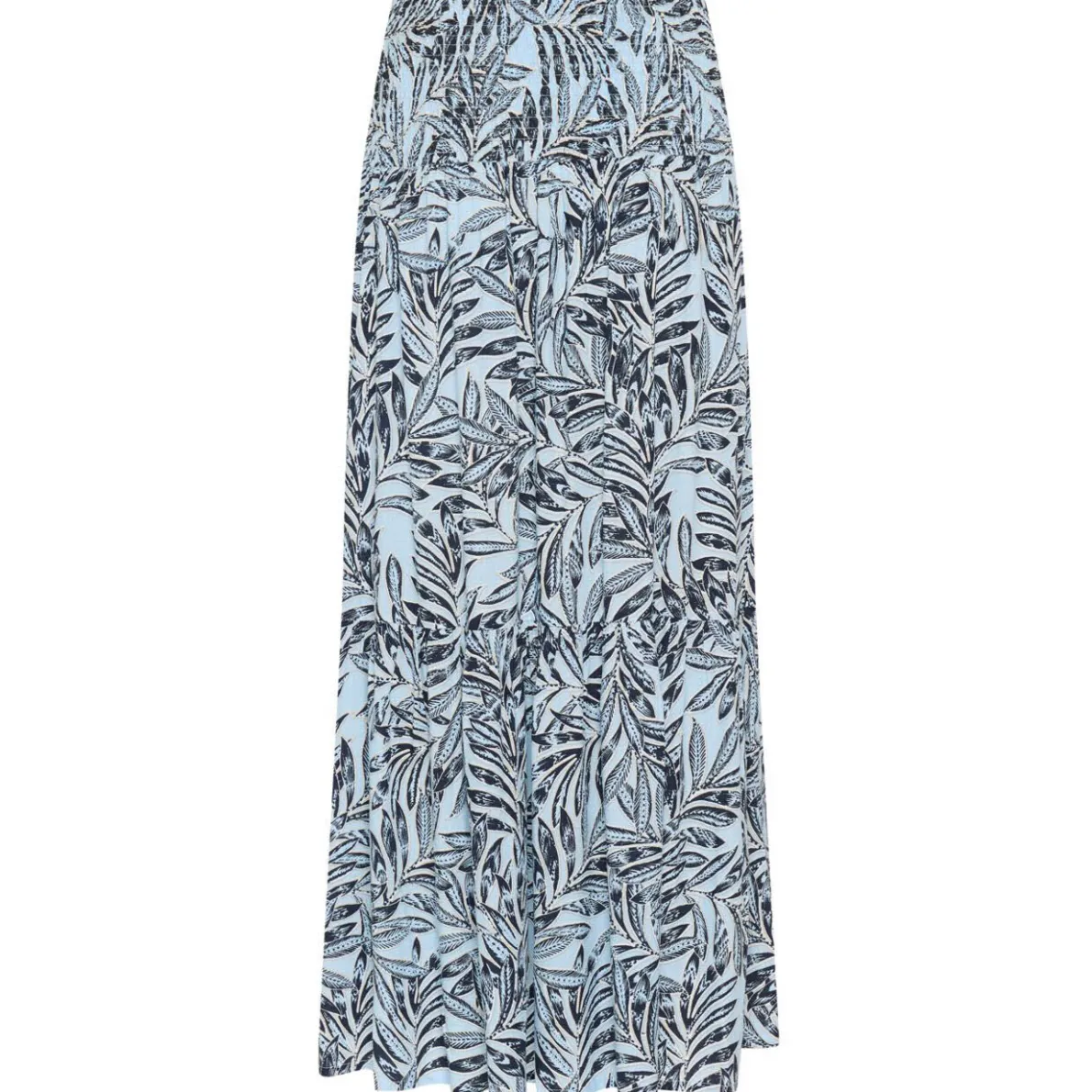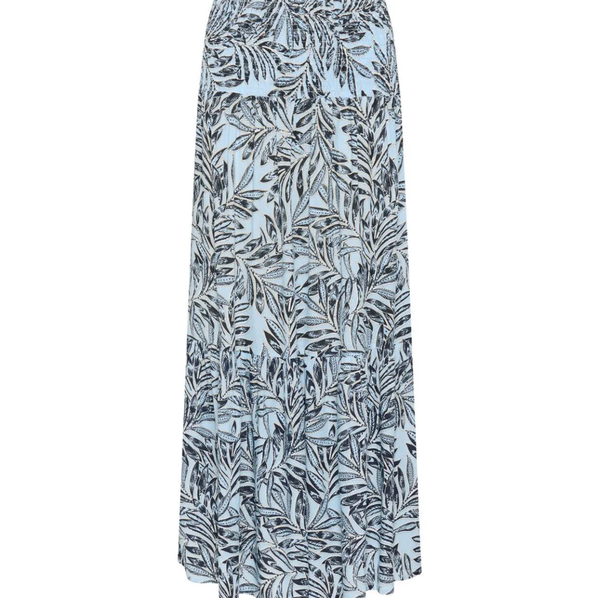 Der leichte Viskose Stoff ist mit einem Blumen Blätter Print in Blau verziert. Er hat eine elastische Taille und ist in A-Linie gearbeitet. Er ist lang geschnitten und für uns ein Must Have für den Sommer den du super kombinieren kannst.