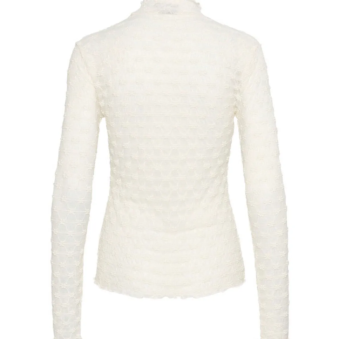 Das Highlight ist hier das Mesh Gewebe in Creme Beige, welches mit kleinen Blumen beflockt wurde. Es hat lange Ärmel und einen kleinen Stehbund am Hals.