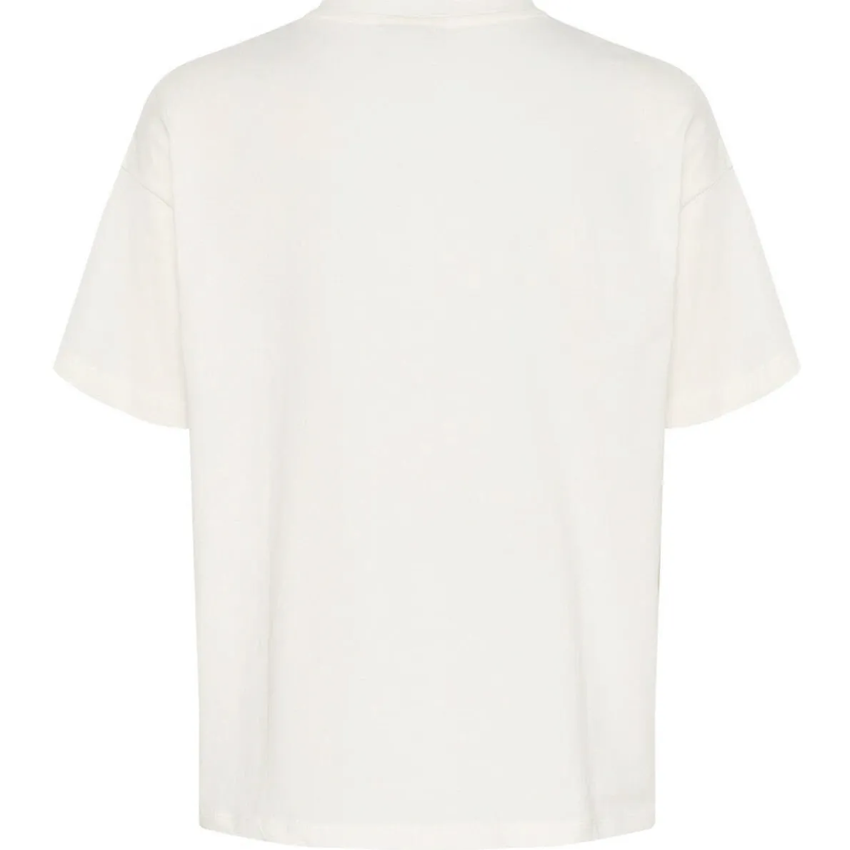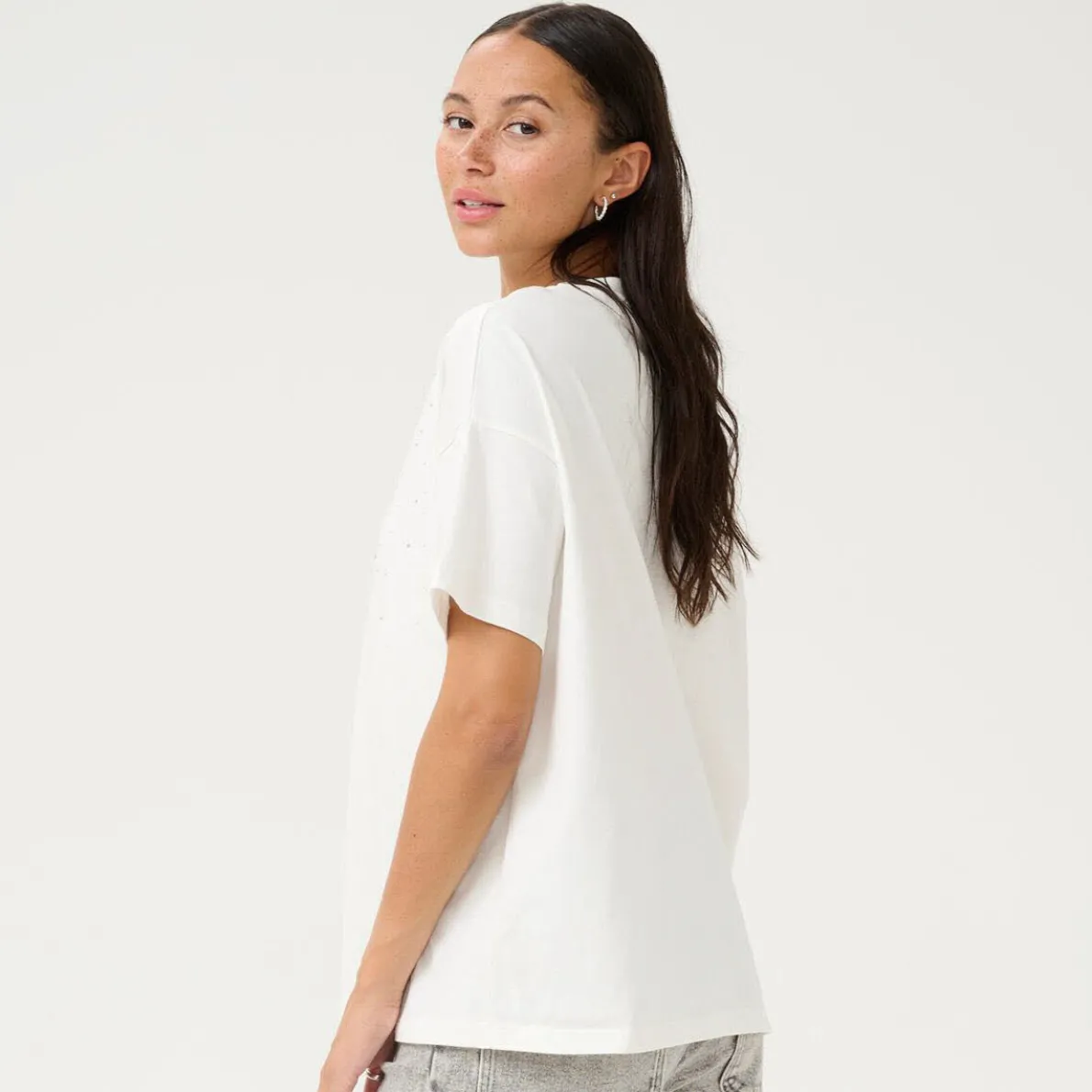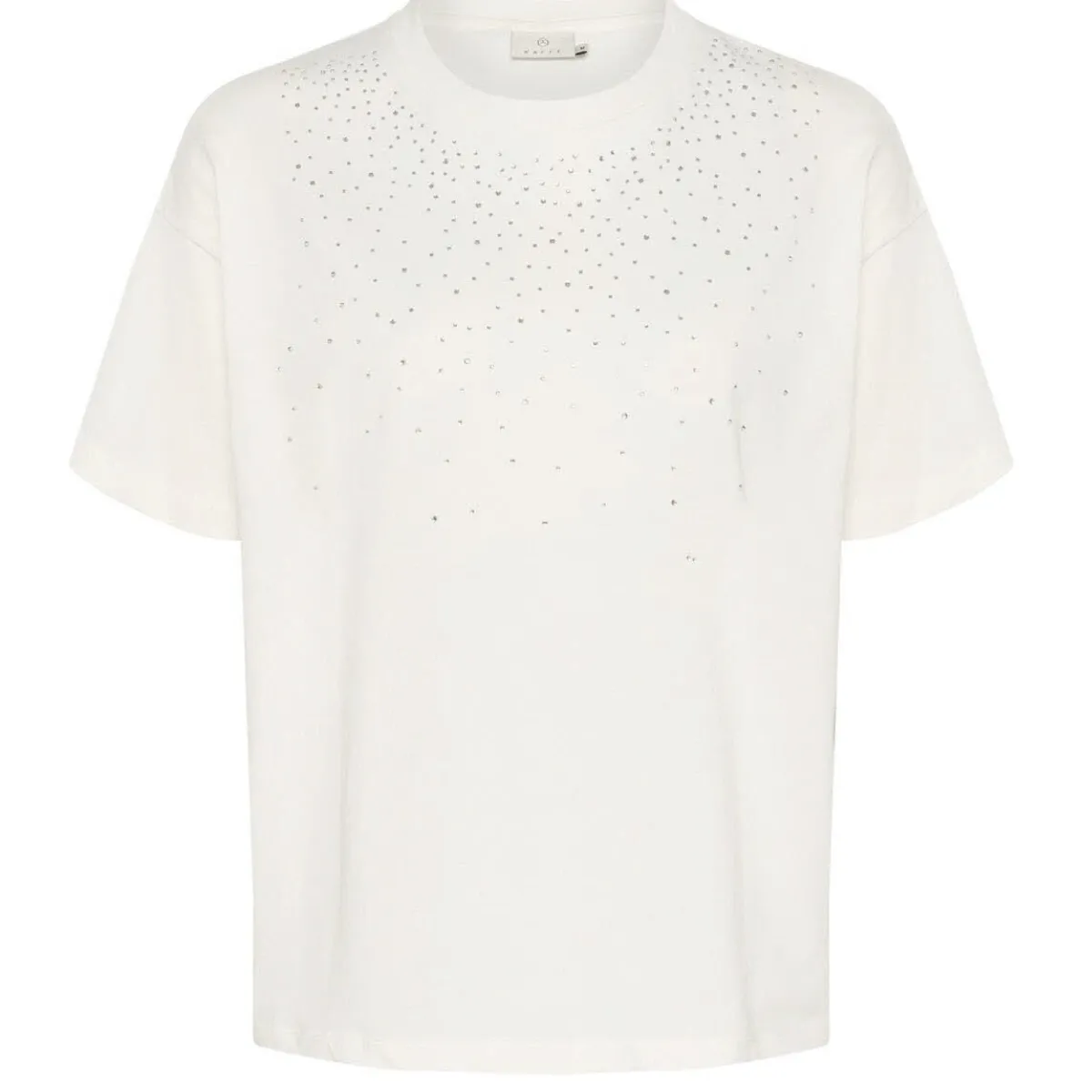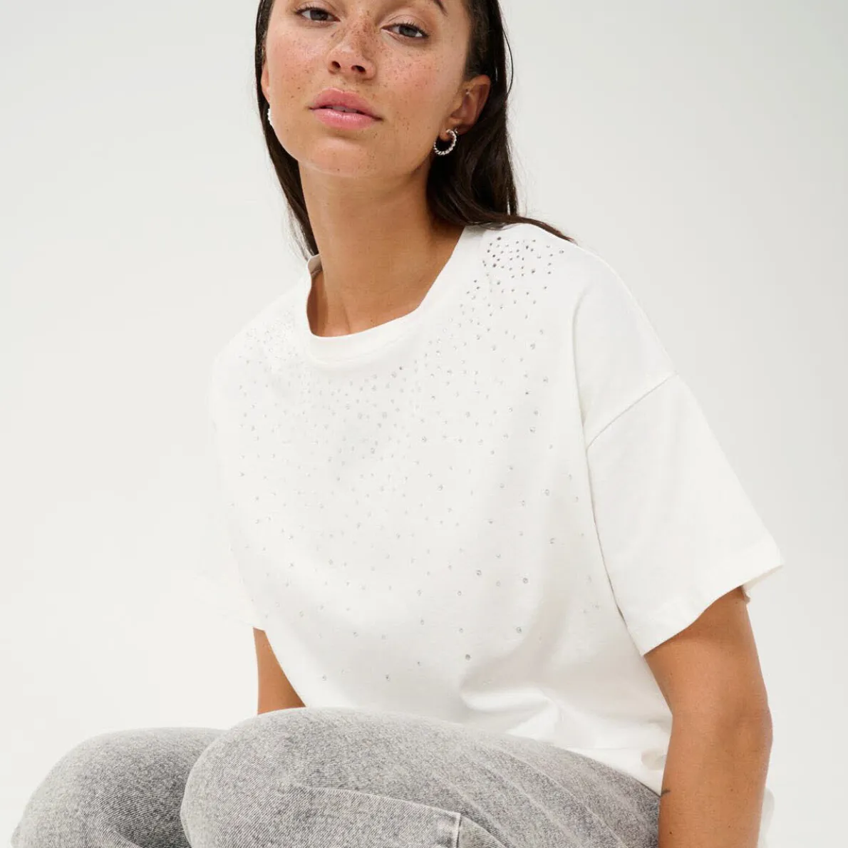 Das KAberisa T-Shirt von Kaffe ist ein tolles Damen Basic Shirt, mit dem gewissen Etwas, für den Frühling und Sommer. Das weiche Gewebe aus reiner Baumwolle in Weiß hat als absoluten Eyecatcher kleine Glitzer Steine im oberen Bereich, auf der Vorderseite. Das Shirt ist mit einem Rundhalsausschnitt gearbeitet, der einen breiten Bund hat und dadurch besonders schön anliegt. Es ist im Loose Fit Schnitt gearbeitet und hat kurze Ärmel.