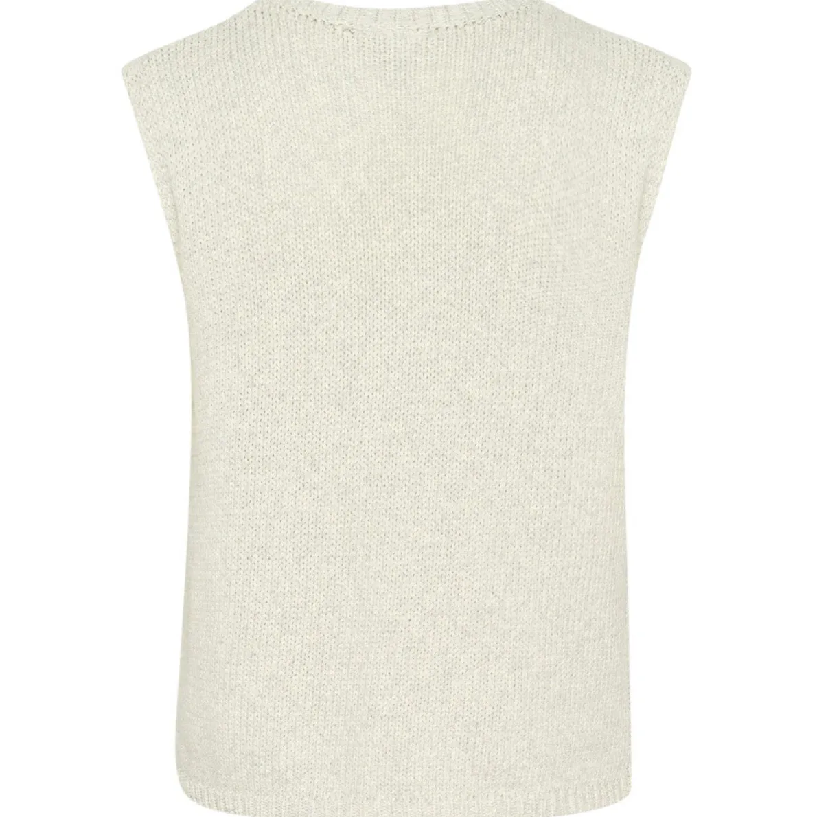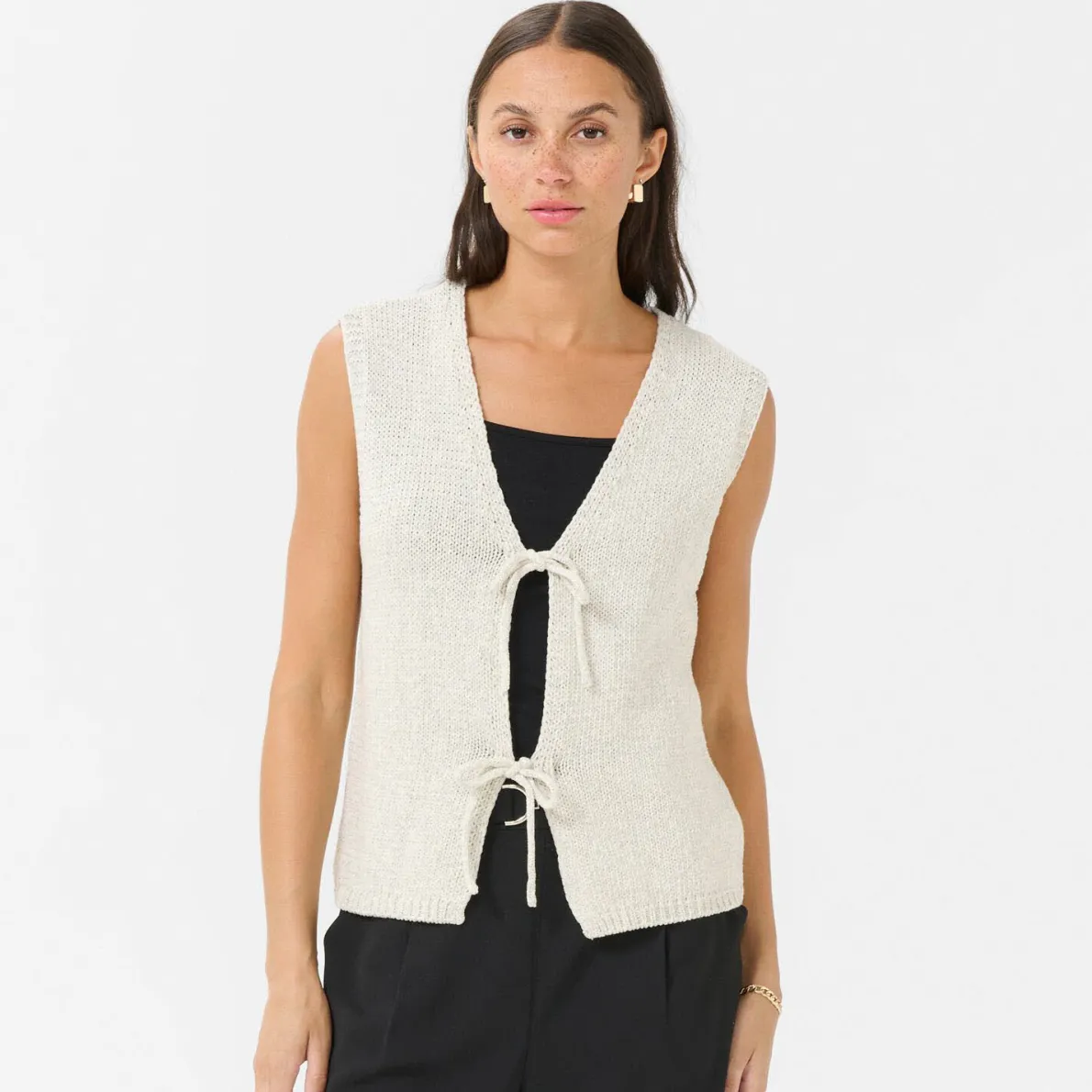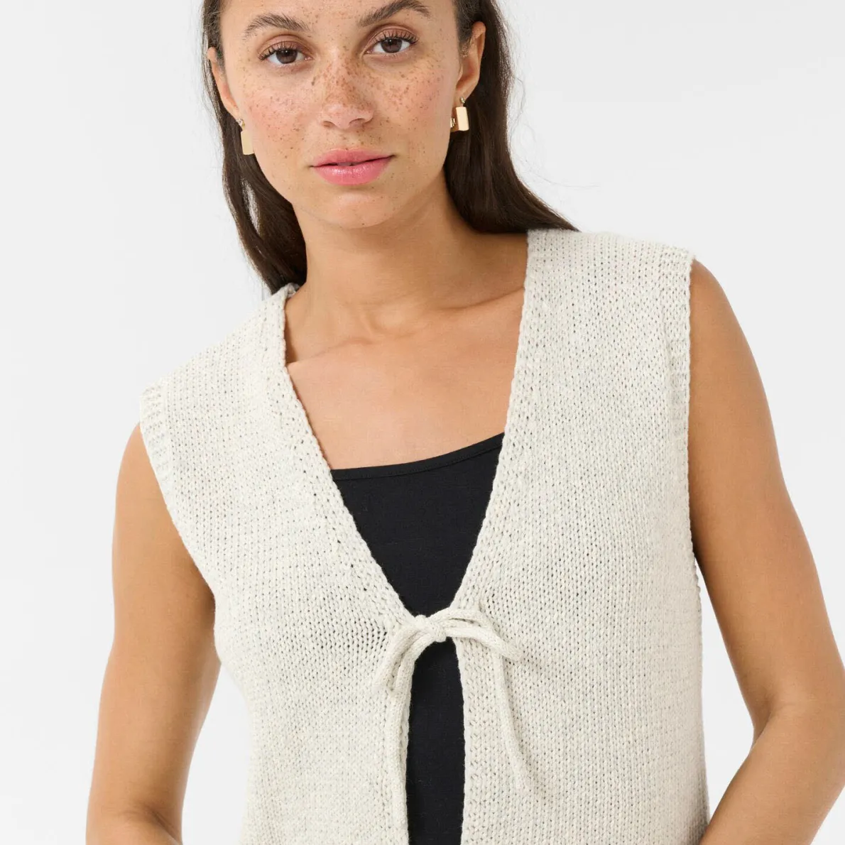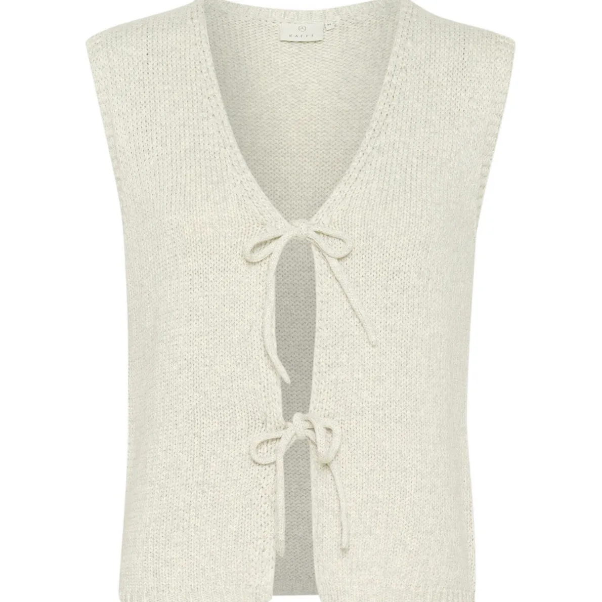 Die Strickjacke ohne Ärmel in Beige hat einen tiefen V-Ausschnitt und wird vorne mit kleinen Schleifen gebunden.