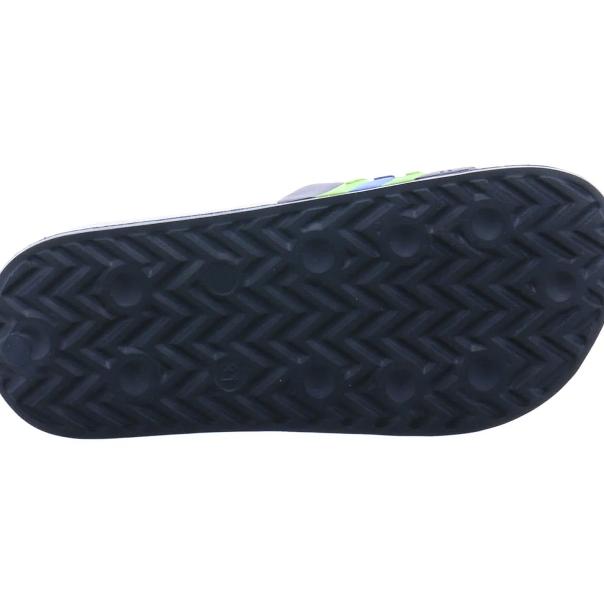 Die Kanga Slide KI ist eine Kinder Pantolette für Jungen aus dem Hause Kangaroos, die für jeden Einsatz bestens gerüstet ist. Gefertigt aus Synthetik in Blau begeistert der Schuh mit dem Streifen Muster in Grün auf dem Riemen.