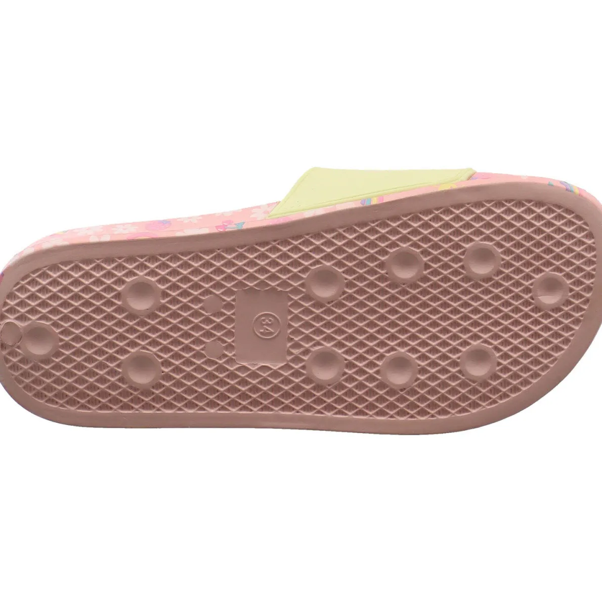 Auf dem breiten Riemen in Gelb ist das typische Kanguru zu sehen. Die Sohle hat einen coolen Print mit Blumen und Kirschen. Da kommt automatisch gute Laune auf. Das weiche Material aus Synthetik in Pastell Rosa ist angenehm weich und trocknet schnell. Er eignet sich daher auch als Badeschuh für das Freibad im Sommer. Aber auch als lässiger Sommer Schuh ideal zu jedem Outfit.