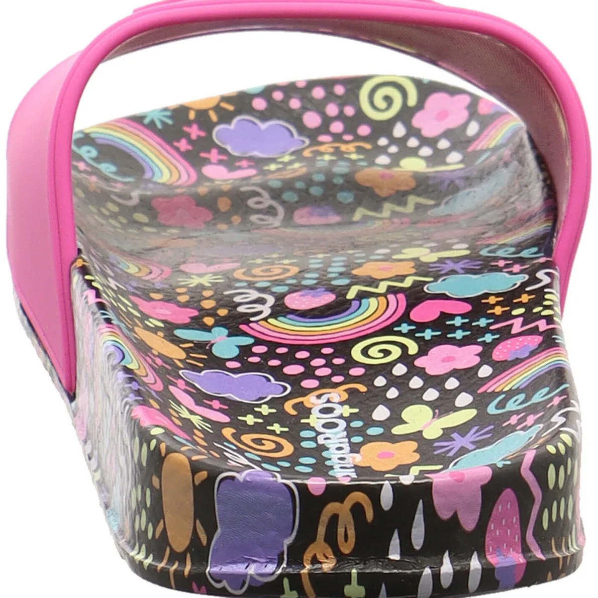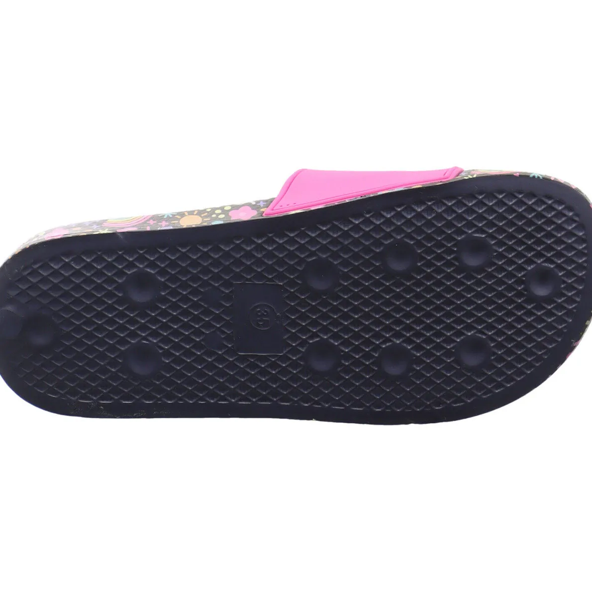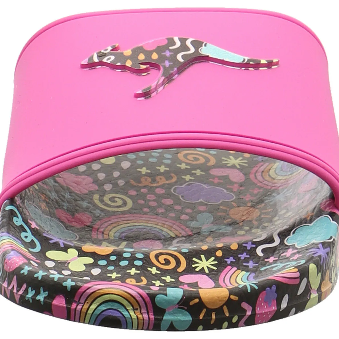 Auf dem breiten Riemen in Pink ist das typische Kanguru zu sehen. Die Sohle hat einen coolen bunten Print mit sommerlichen Motiven wie der Sonne und Schmetterlingen. Und verbreitet gute Laune. Das weiche Material aus Synthetik in Blau ist angenehm weich und trocknet schnell. Er eignet sich daher auch als Badeschuh für das Freibad im Sommer. Aber auch als lässiger Sommer Schuh ideal zu jedem Outfit.