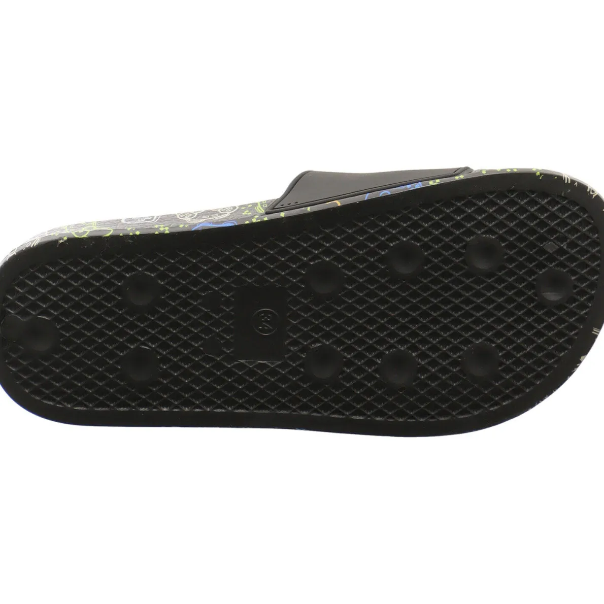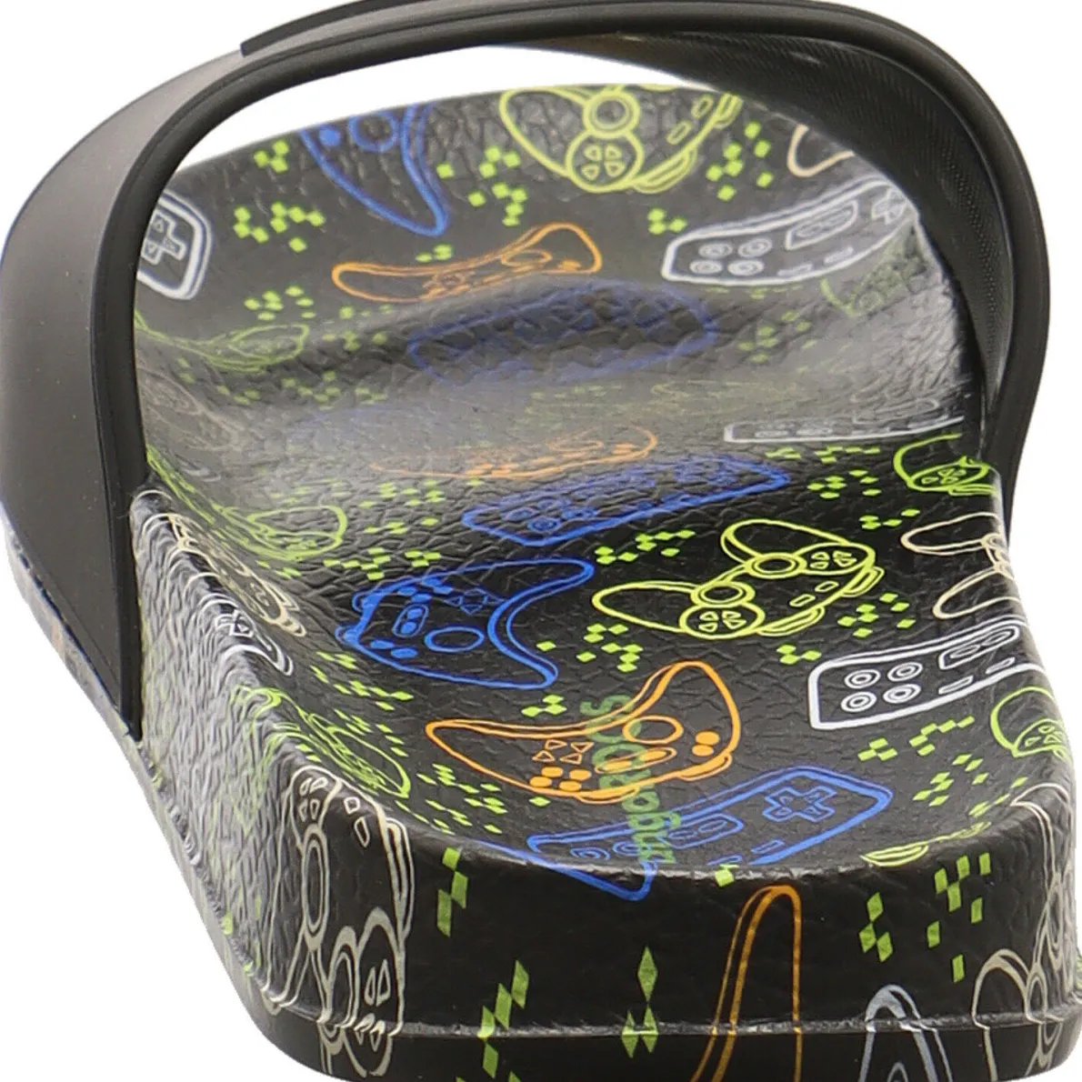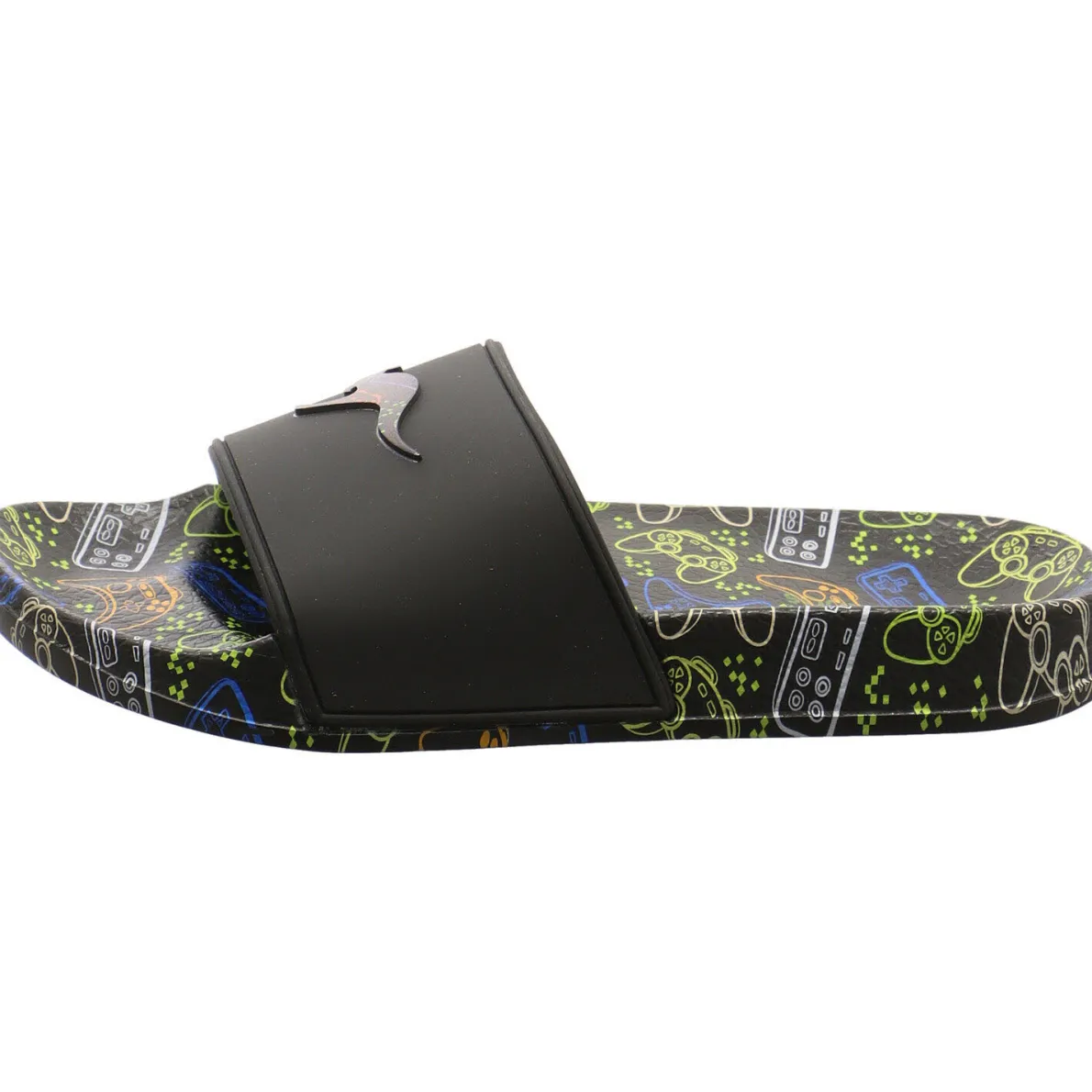 Auf dem breiten Riemen in Schwarz ist das typische Känguru zu sehen. Die Sohle hat einen coolen Gamer Print in leuchtenden Farben.