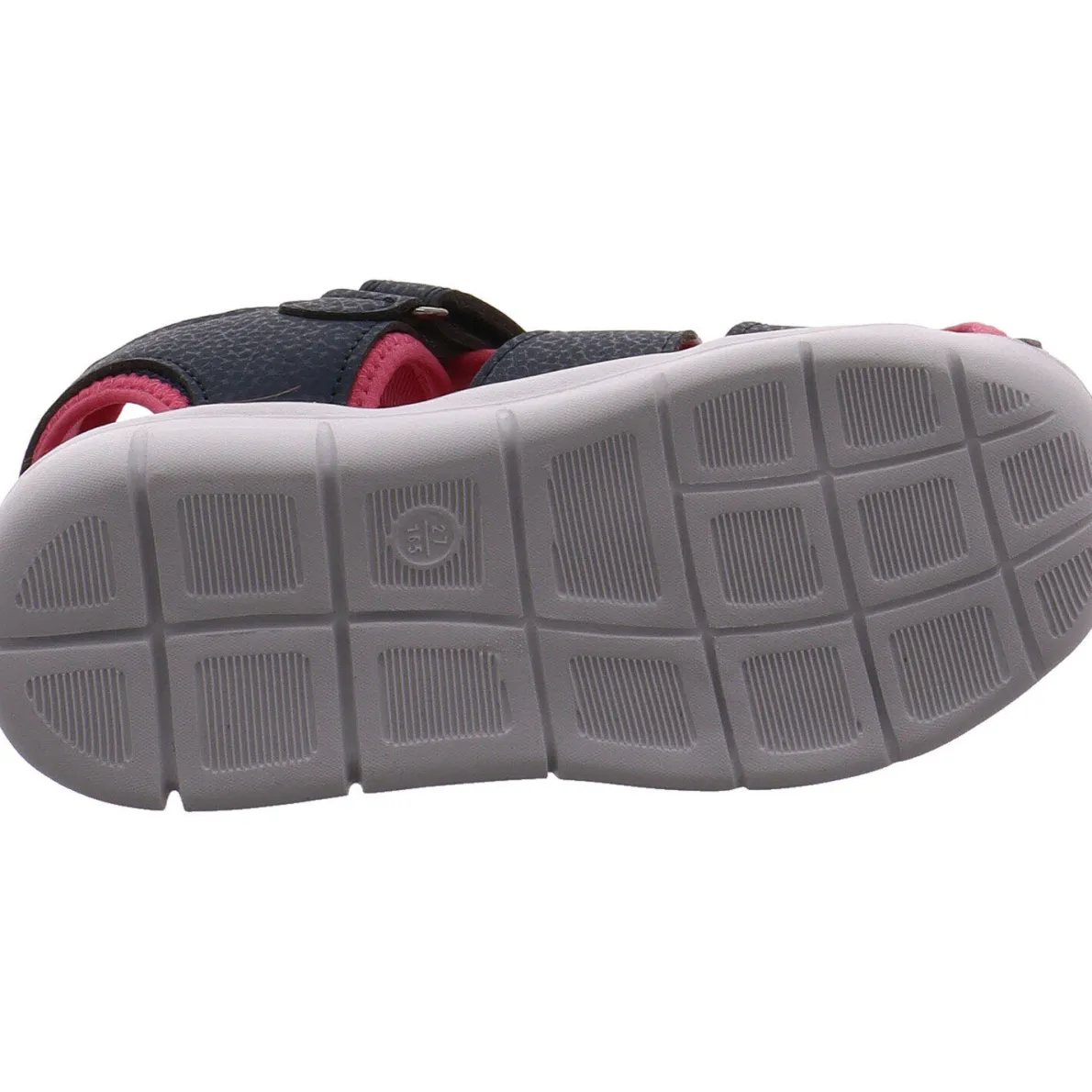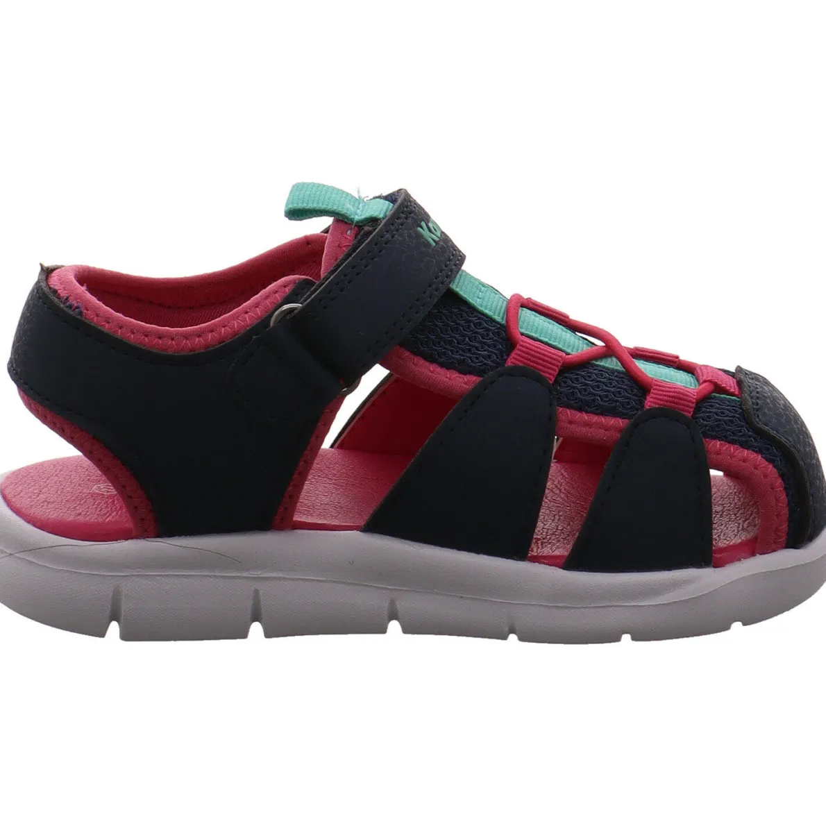 Die verstärkte Schuhspitze schützt die Zehen auch auf unwegsamem Gelände und durch den Klettverschluss und die Gummischnürung lässt sich die Sandale perfekt den Kinderfüßen anpassen.