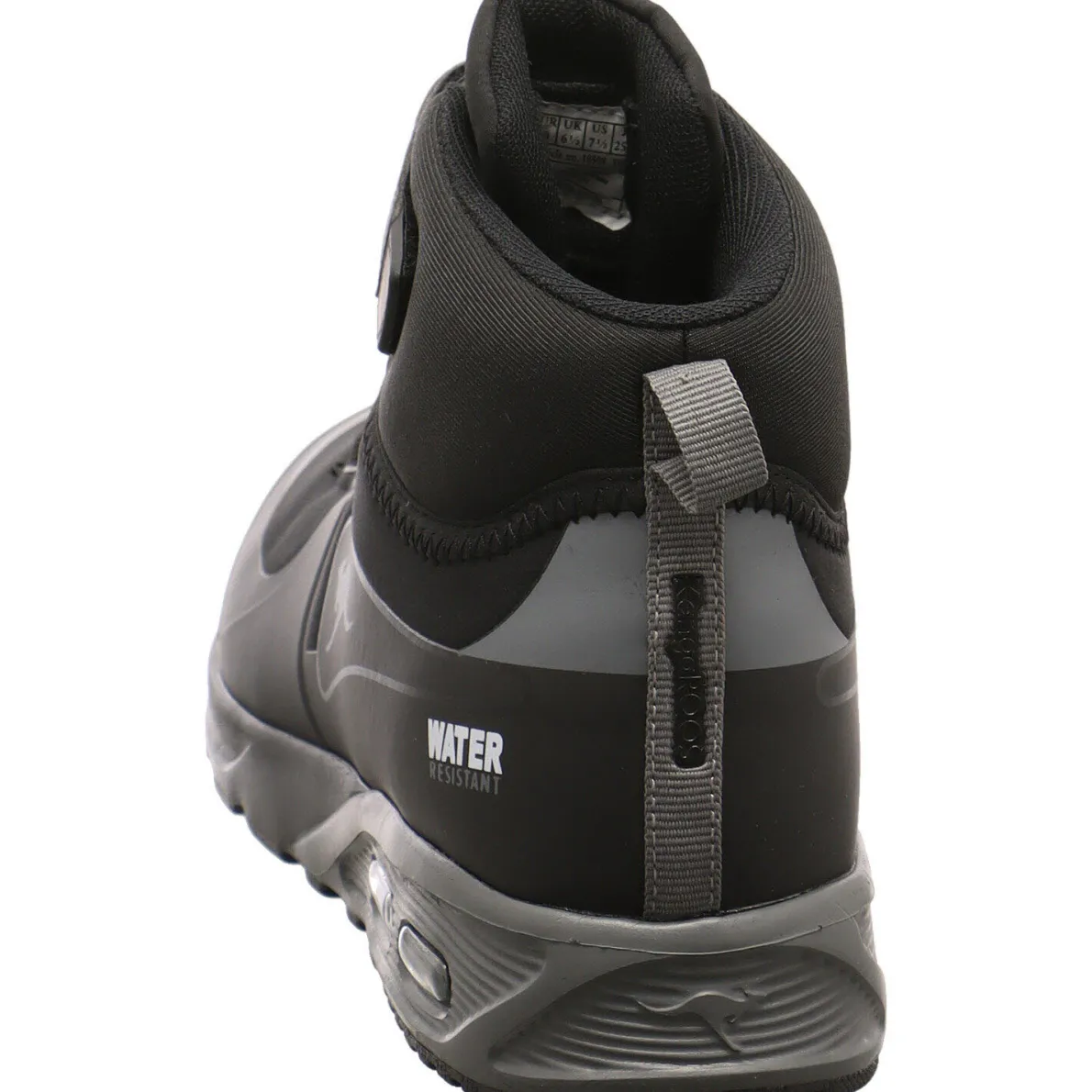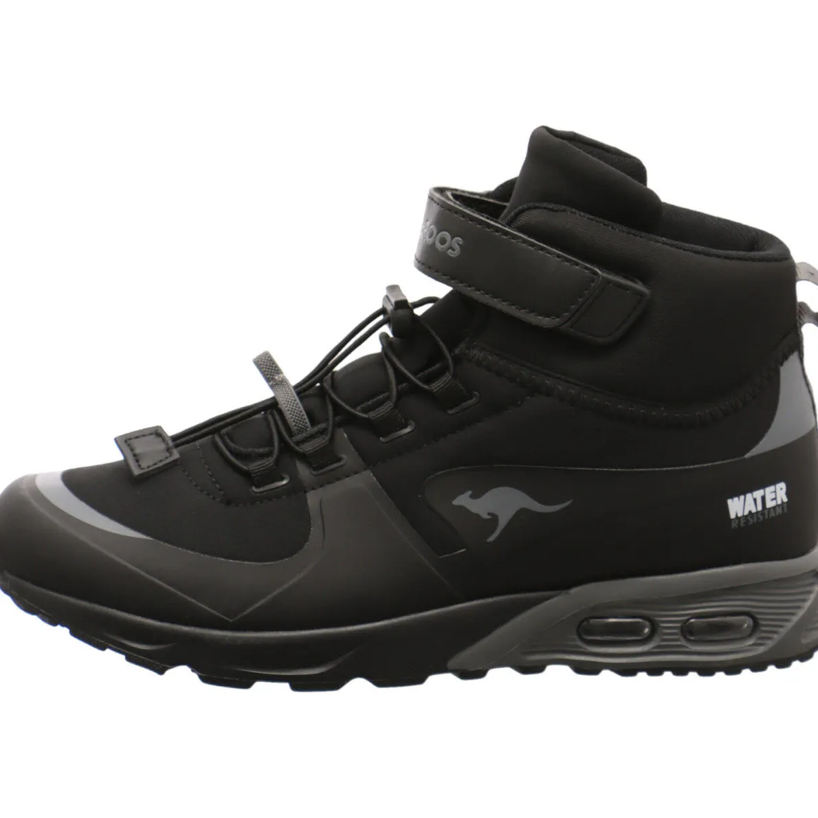 Der KX Hydro für Jungen von Kangaroos in Schwarz ist ein praktischer Hightop Sneaker für nasskalte Tage. Optisch wird der Schuh durch Details in Grau aufgewertet.