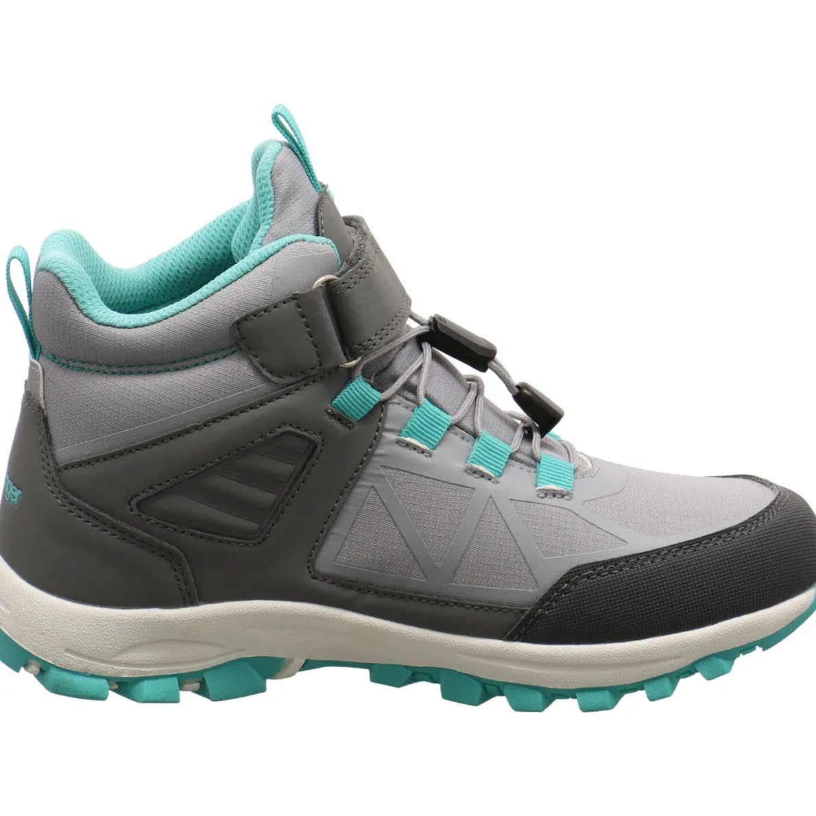 Gefertigt aus einem Mix aus Kunstleder und Textil Mesh in Grau und Türkis Blau, ist die Schuhspitze und Ferse verstärkt, wodurch der Schuh besonders robust ist. Durch die Textil Laschen am Schaft, die Speed-Lace Schnürung und den Klettverschluss ist der Einstieg leicht und der Stiefel kann optimal an den Fuß angepasst werden. Die K-Tex Ausstattung macht den Schuh wasserdicht und atmungsaktiv. Regnerische Herbst Tage und nasse Wiesen, meistert er ohne Probleme. Die K-CELL Einlegesohle ist gepolstert, herausnehmbar und sehr flexibel, durch Soft Cushion.