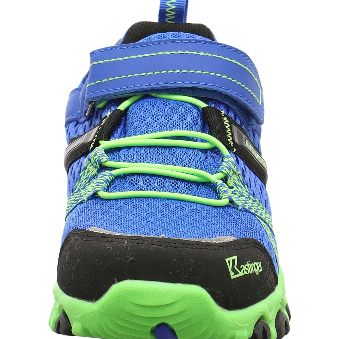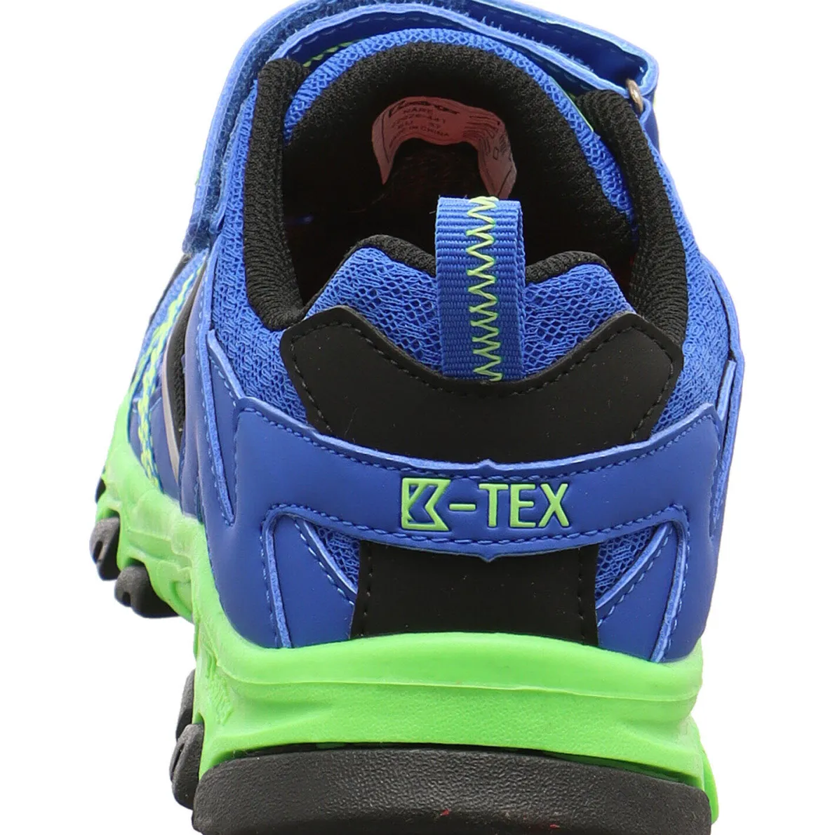 Gefertigt aus einem Mix aus Kunstleder und Textil Mesh in Blau und Grün mit Schwarz sind die Schuhspitze und Ferse verstärkt, wodurch der Schuh besonders robust ist. Durch den Klettverschluss und die Gummischnürung ist ein besonders komfortbaler Einstieg möglich. Die K-Tex Ausstattung macht den Schuh zudem wasserdicht und atmungsaktiv.