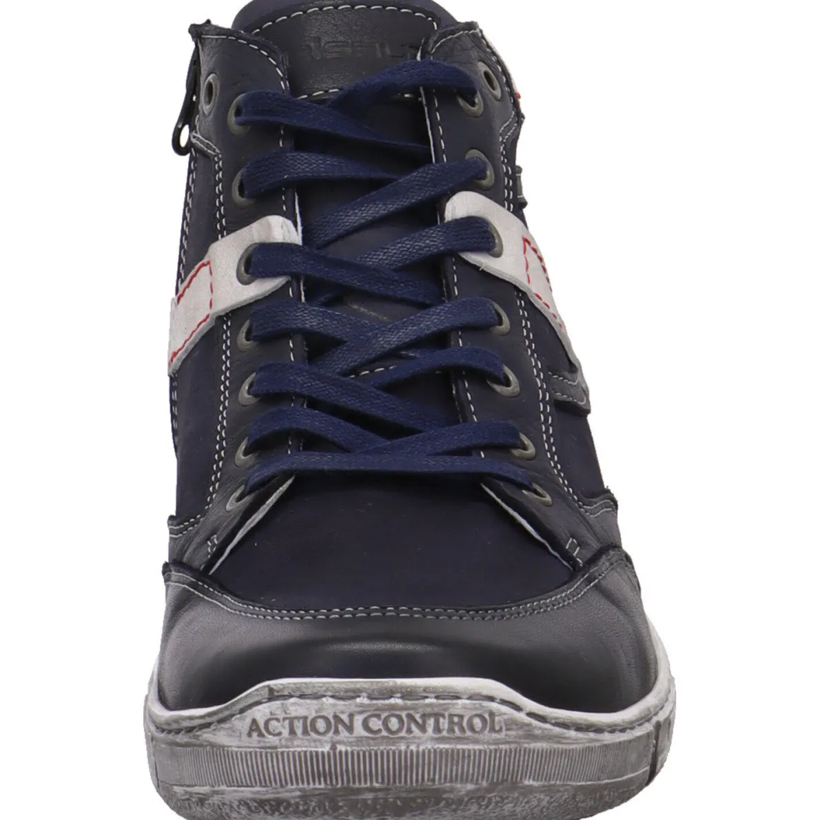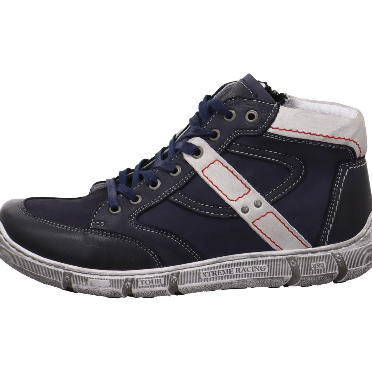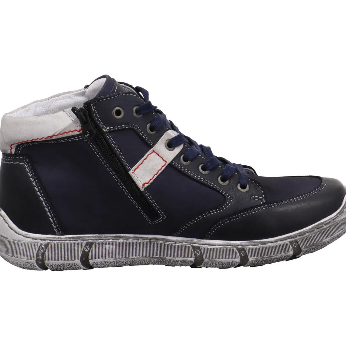Das soft weiche Obermaterial aus Echtleder in Blau wird durch Parts in Weiß und dekorative Ziernähte in Rot optisch noch aufgewertet.