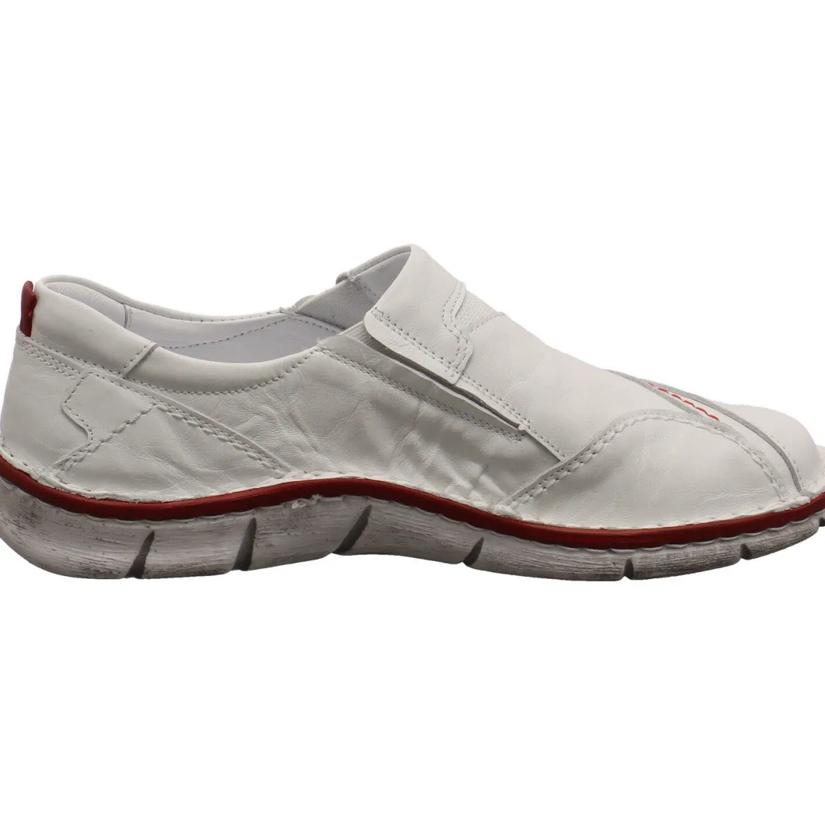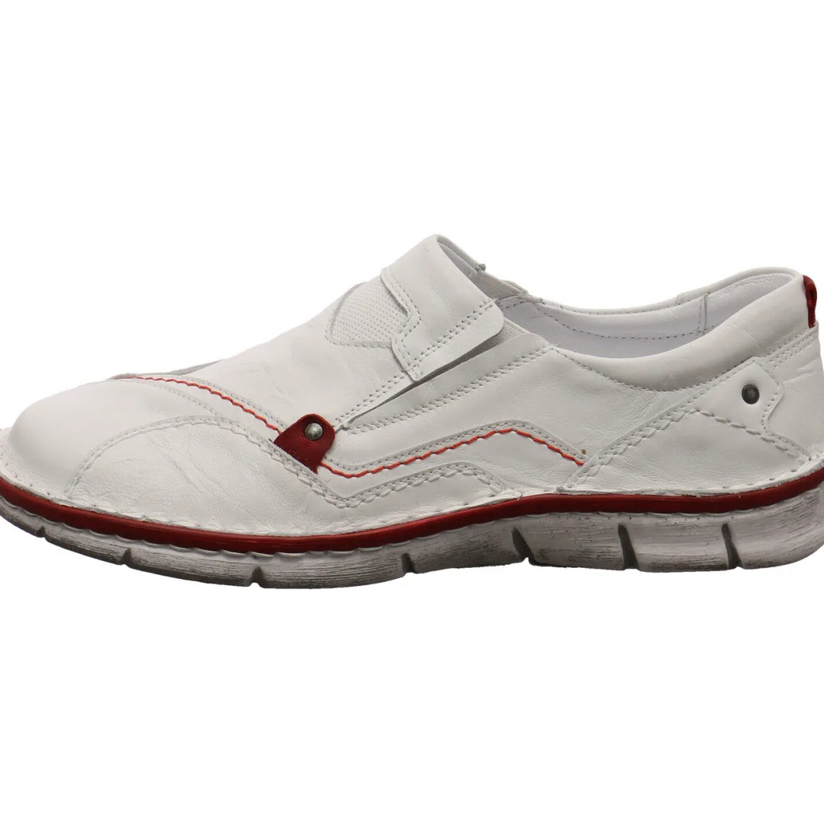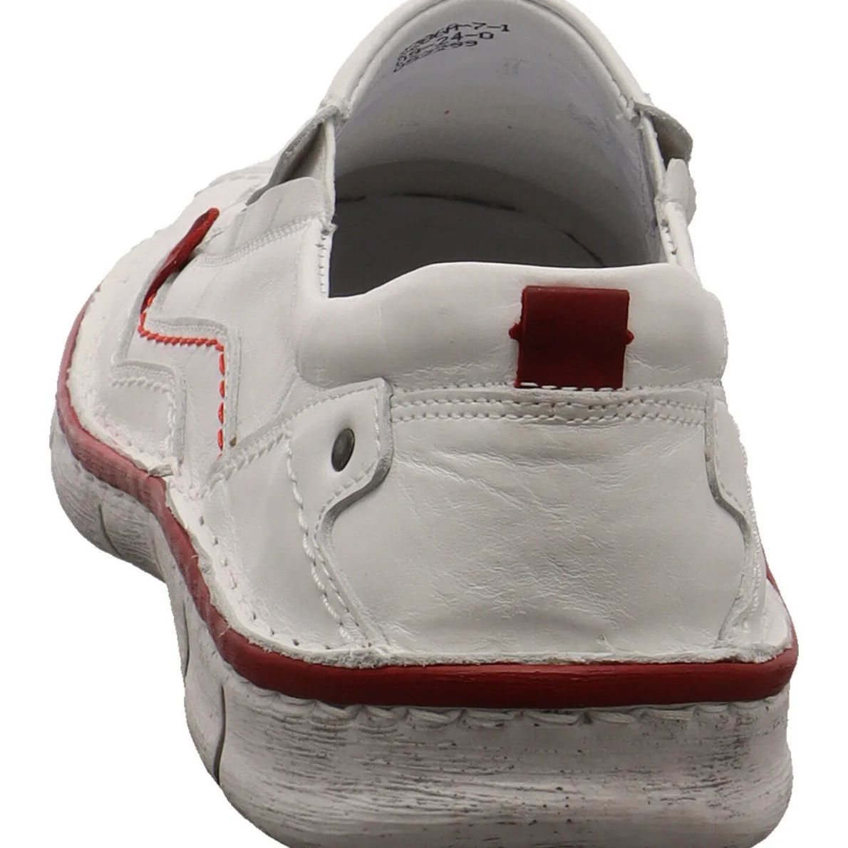 Das Obermaterial aus hochwertigem Echtleder in Weiß im Antik Look ist verziert mit auffälligen Nähten, Prägungen und Overlays, die dem Schuh ein cooles Design verleihen. Ein weiterer Eyecatcher ist die Umrandung der Laufsohle und Ziernaht in Rot.
