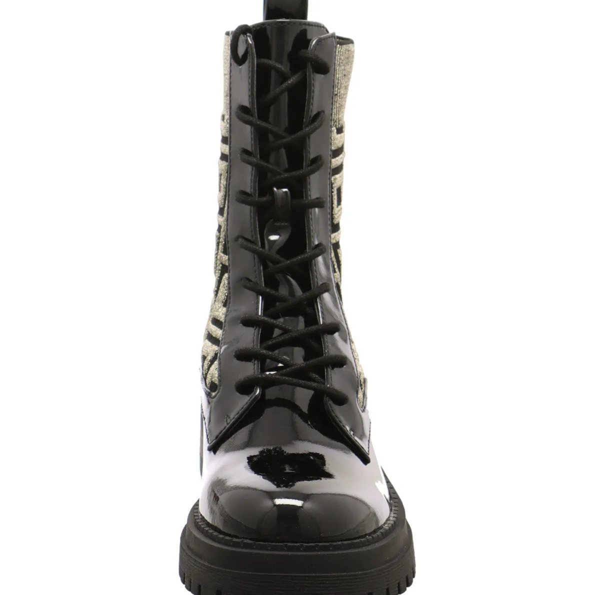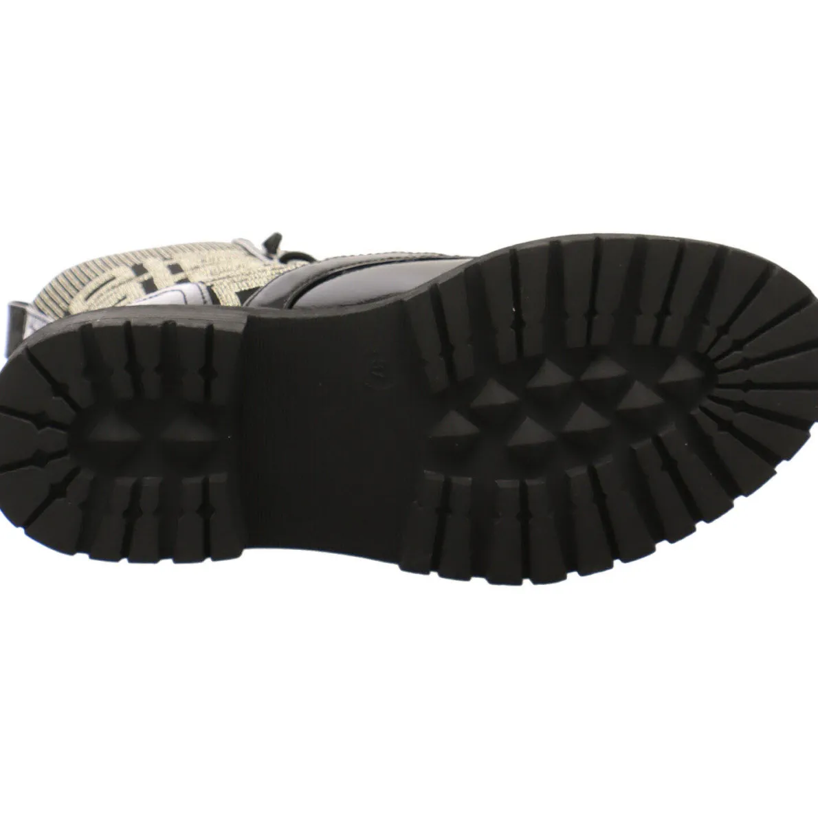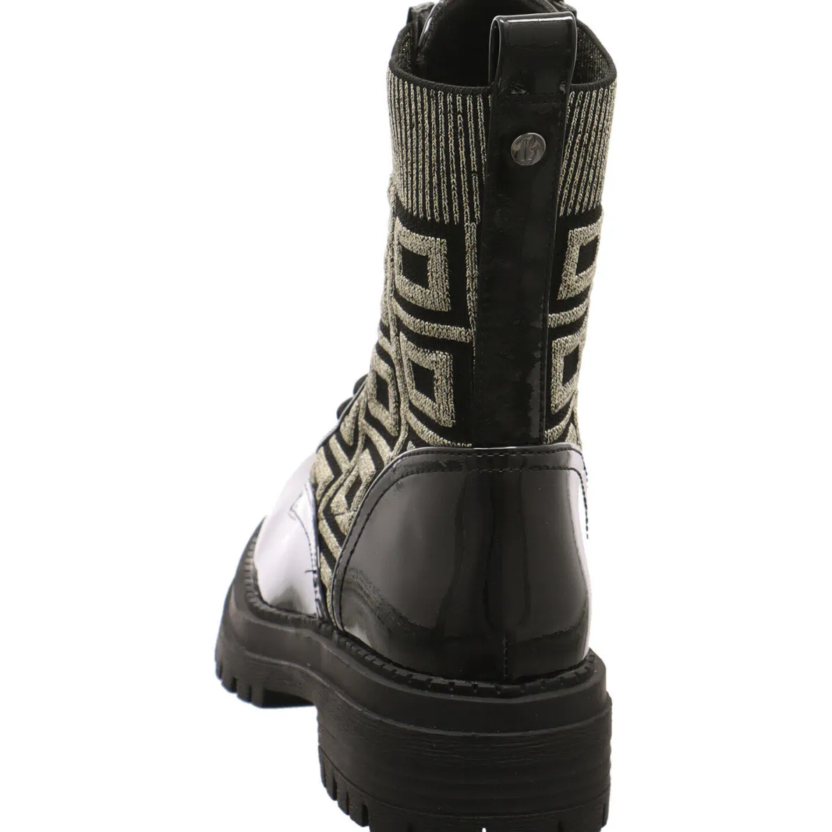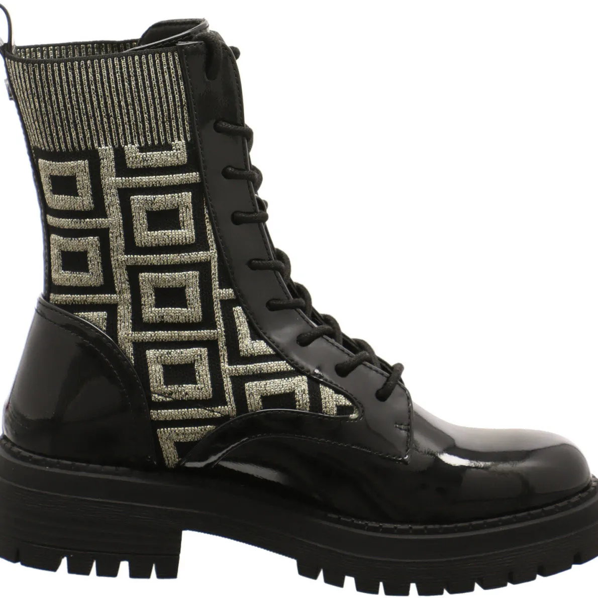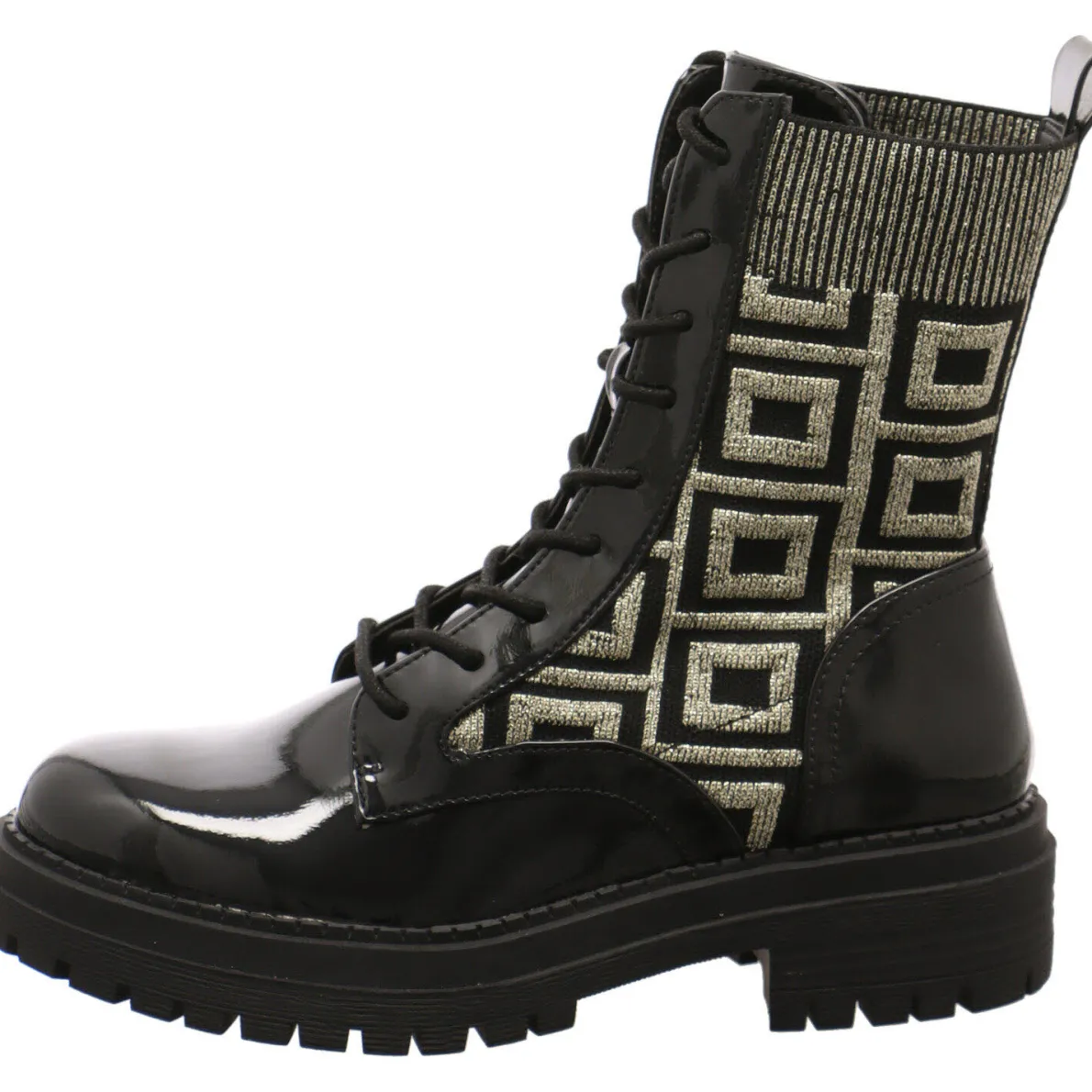 Gefertigt aus einem Mix aus flexiblem Textil in Schwarz mit einem auffälligen Muster in Gold mit Glitzer und Kunstleder in Schwarz Lack kann man den Boots durch das weiche Material und die Lasche am Schaft anziehen wie Socken. Dadurch ist der Einstieg besonders komfortabel und sehr einfach. Durch die Schnürung kann er dann optimal an den Fuß angepasst werden. Ein absolutes Highlight ist das Muster des Obermaterials, welches im Sonnenlicht toll glitzert. Abgerundet wird der coole Look durch die markante Laufsohle mit Blockabsatz, welcher leicht profiliert ist und somit für guten Halt sorgt.