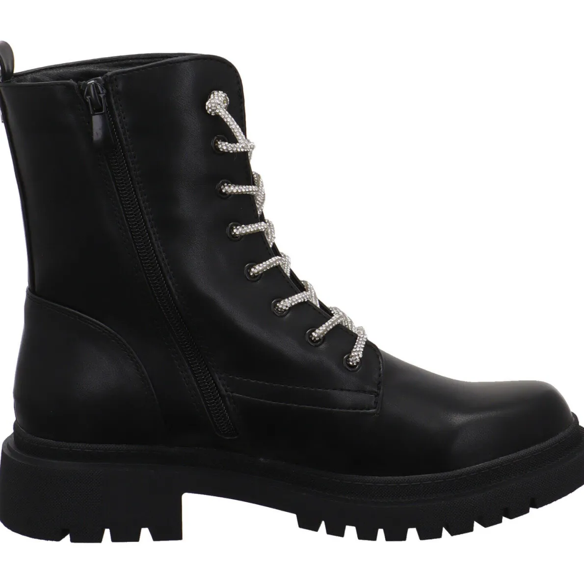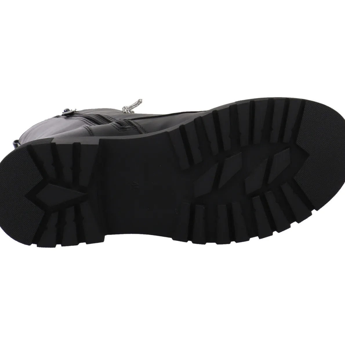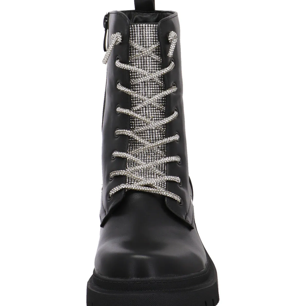 Das Obermaterial wurde aus Echtleder in Schwarz gefertigt. Absolutes Highlight sind hier die Zierschnürung und Zunge, die mit vielen kleinen Strasssteinen verziert sind und funkeln.