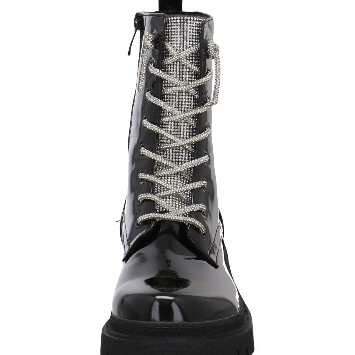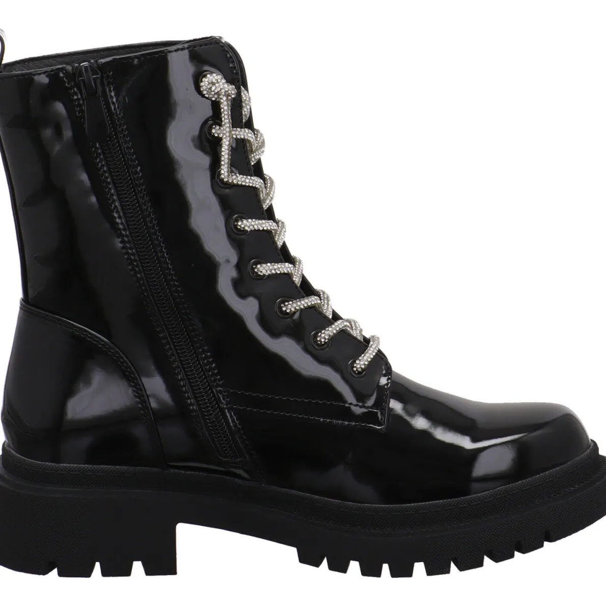 Das Obermaterial schimmert durch die Lack Schicht in Schwarz und passt perfekt zur Zierschnürung und der Zunge, die mit vielen kleinen Strasssteinen verziert sind.