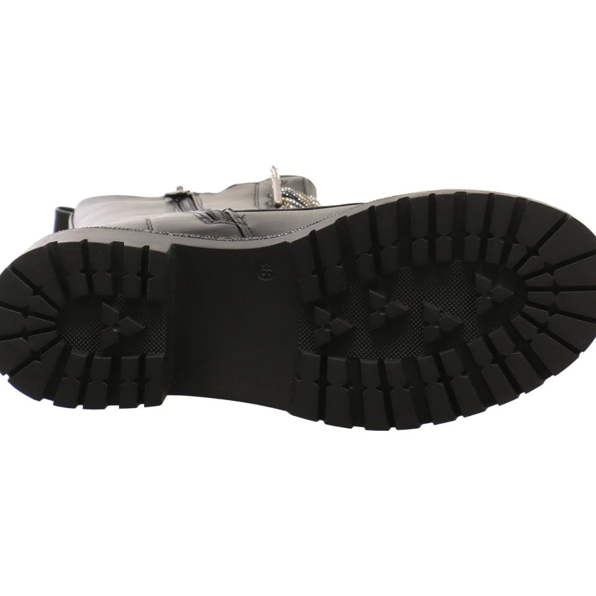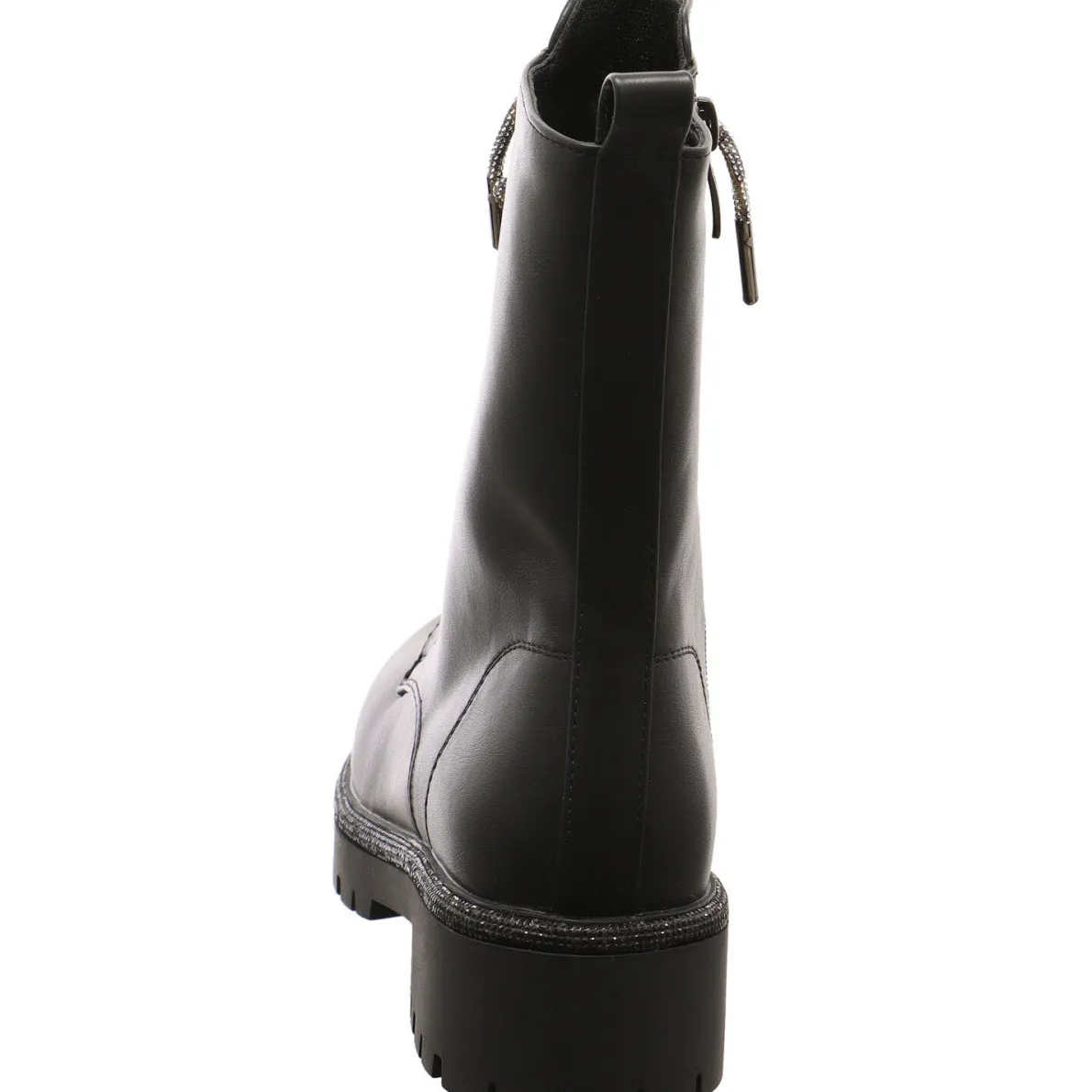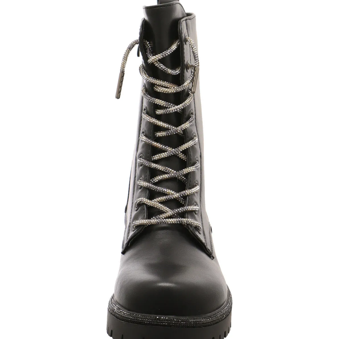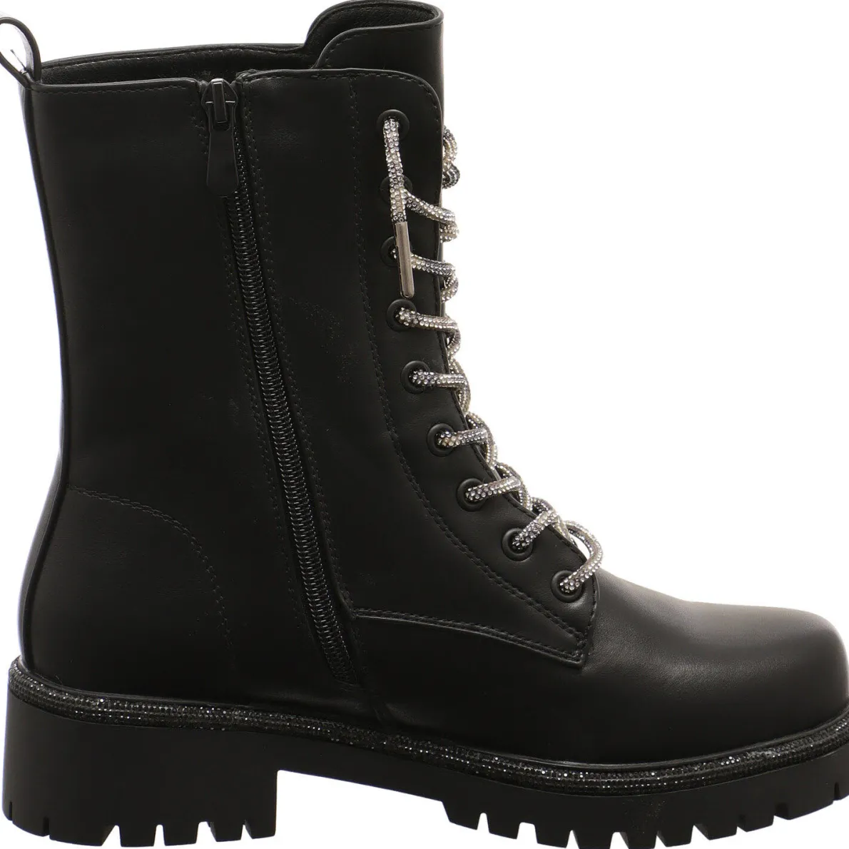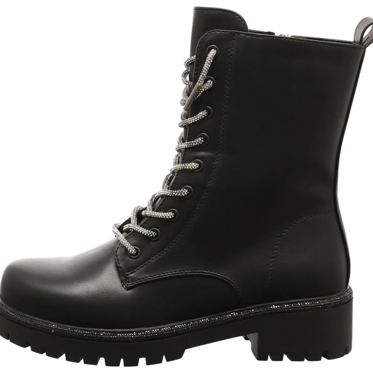 Das Obermaterial aus Kunstleder in Schwarz, wird durch die Schnürsenkel die eine Glitzerkette nachahmen gekonnt in Szene gesetzt. Abgerundet wurd das ganze, durch die Umrandung der Laufsohle mit Blockabsatz, mit vielen kleinen Glitzer Steinen in schwarz. Durch die Lasche am Schaft und den Reißverschluss an der Innenseite, kommst du bequem in den Boots.